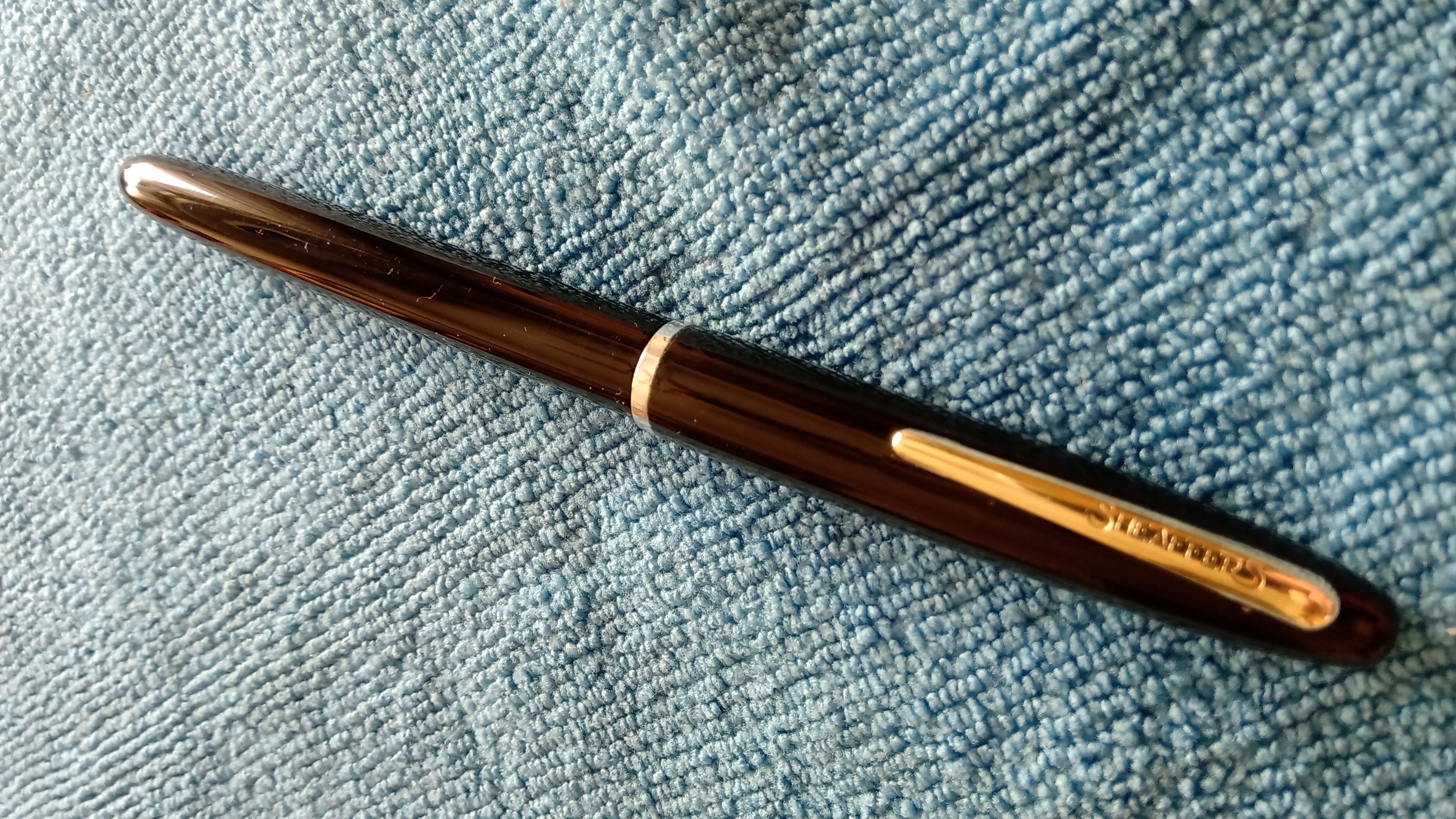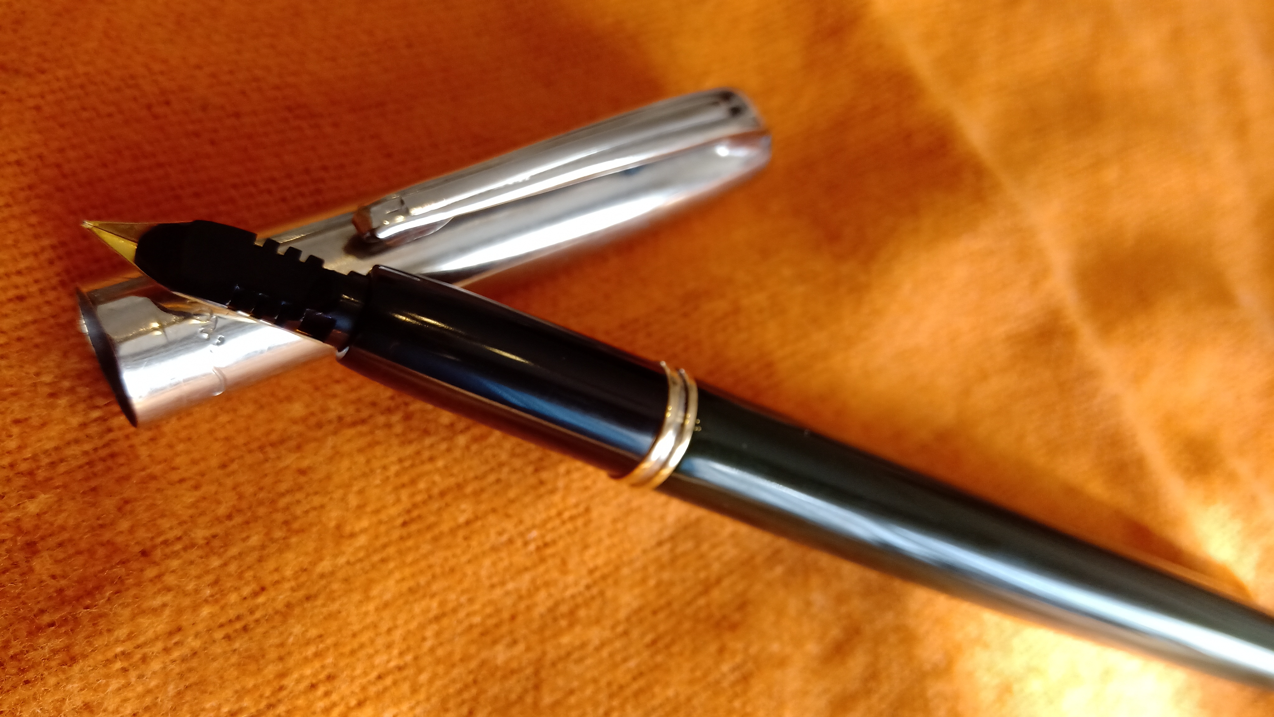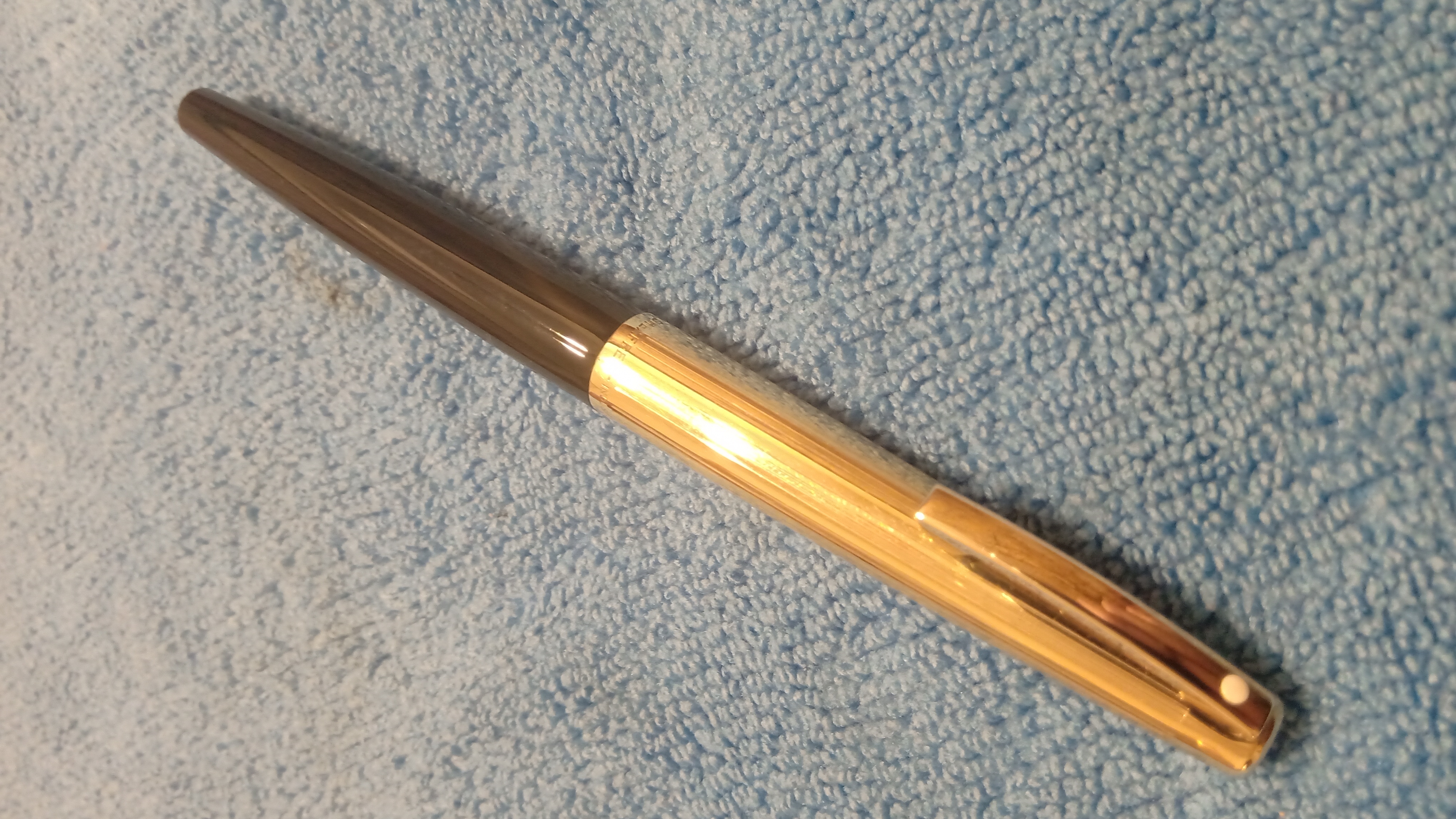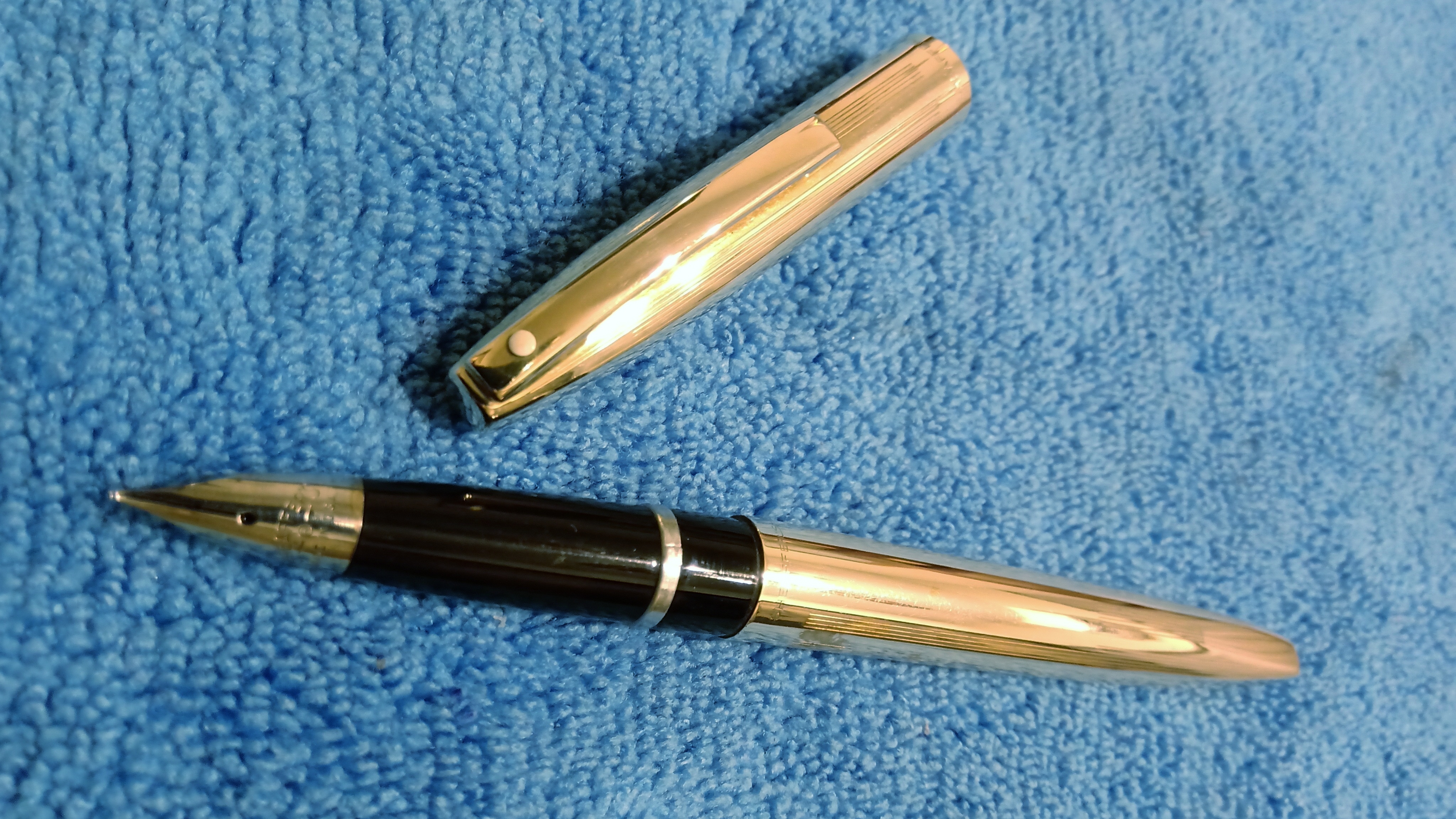 Si tratta di una Sheaffer's degli anni 60/70 quasi interamente prodotta in Argentina, e dico Sheaffer's e non Sheaffer, Imperial 777, Stylist Lifetime, con corpo, cappuccio e clip placcati oro incisi, con sistema di conversione aerometrica originale, impugnatura in acrilico nera, e un magnifico pennino corto conico originale, in argento palladio prodotto negli Stati Uniti, che ad un certo punto gli ho presentato nel forum e che scrive meravigliosamente...!!!