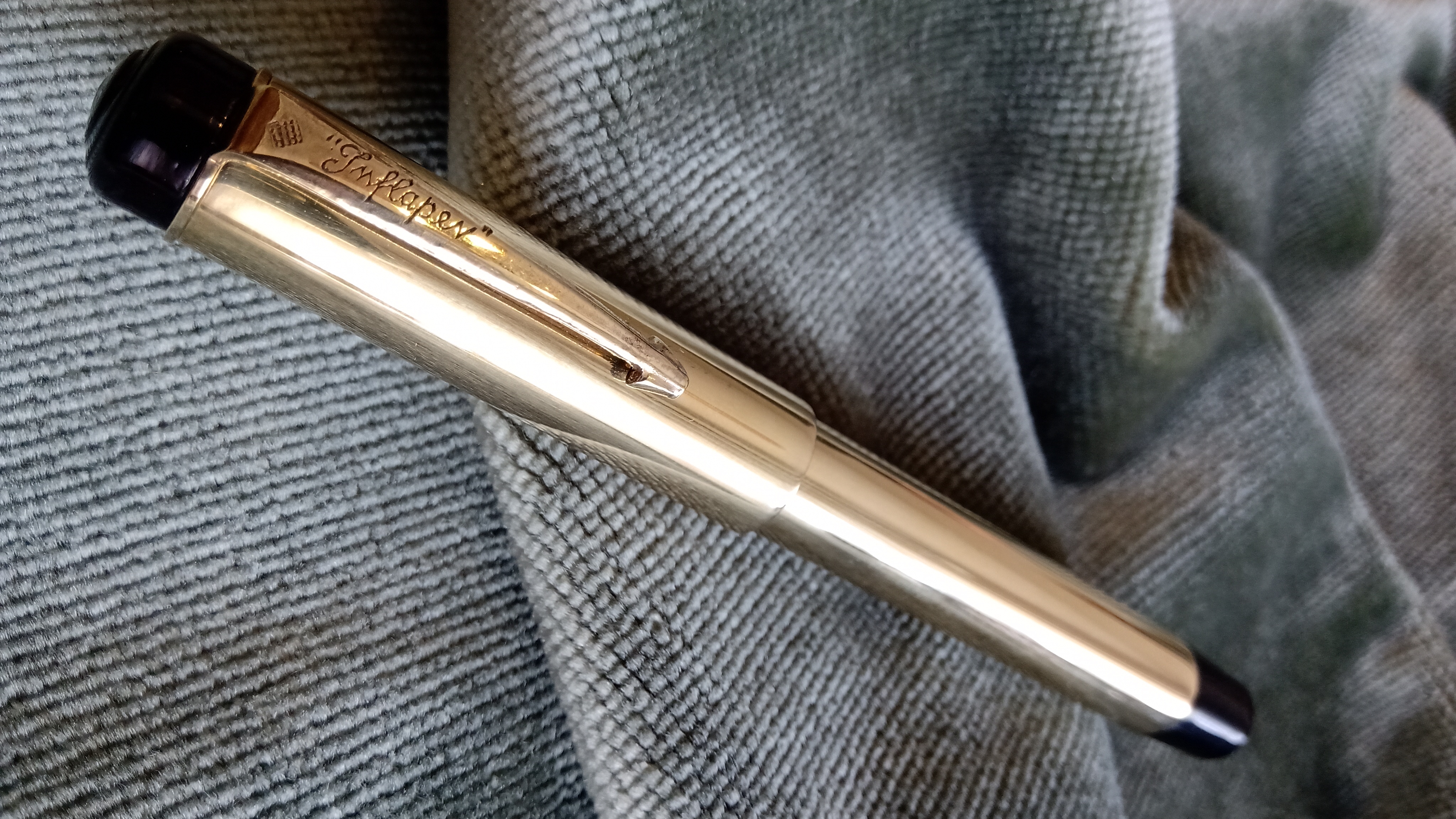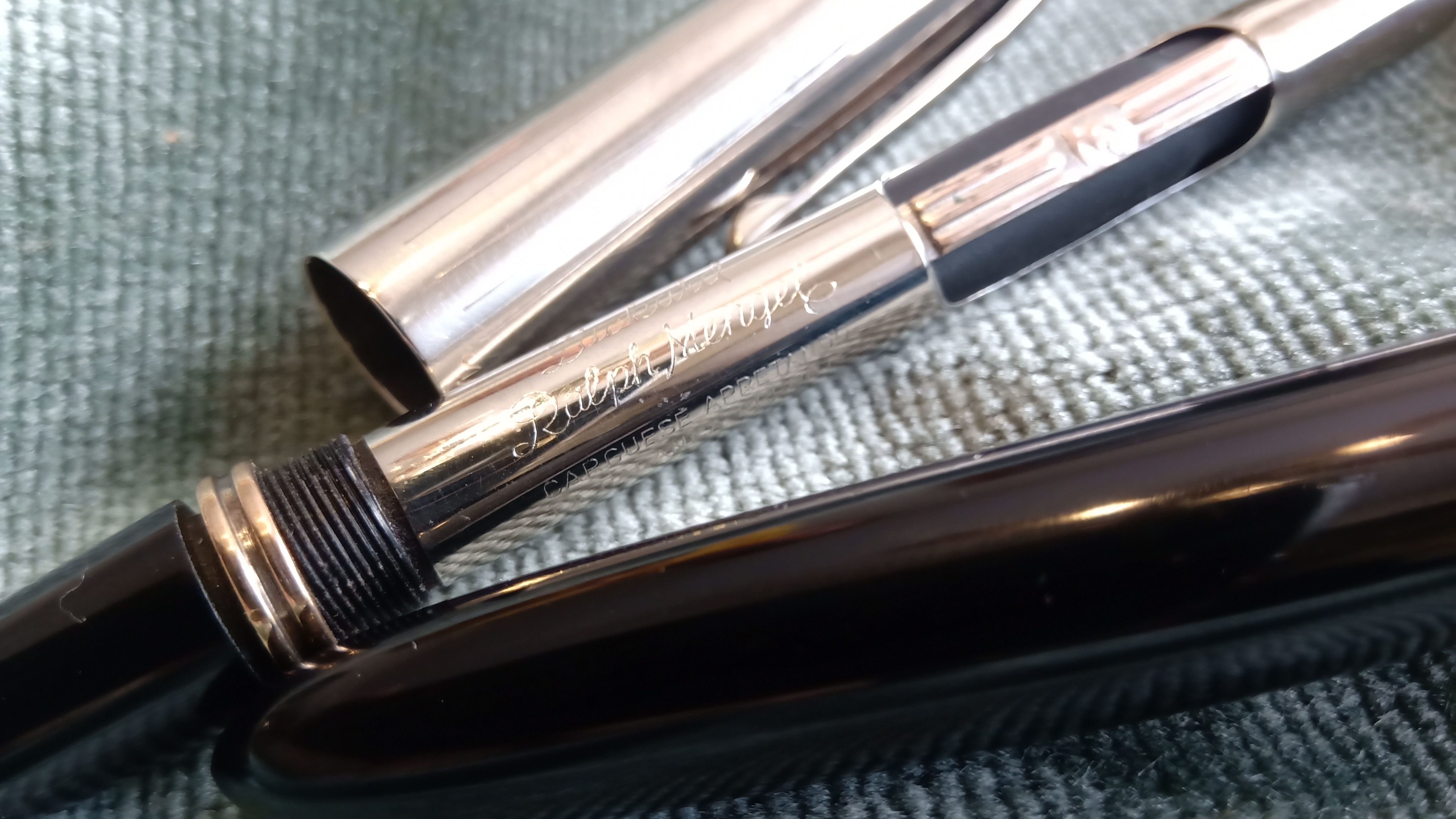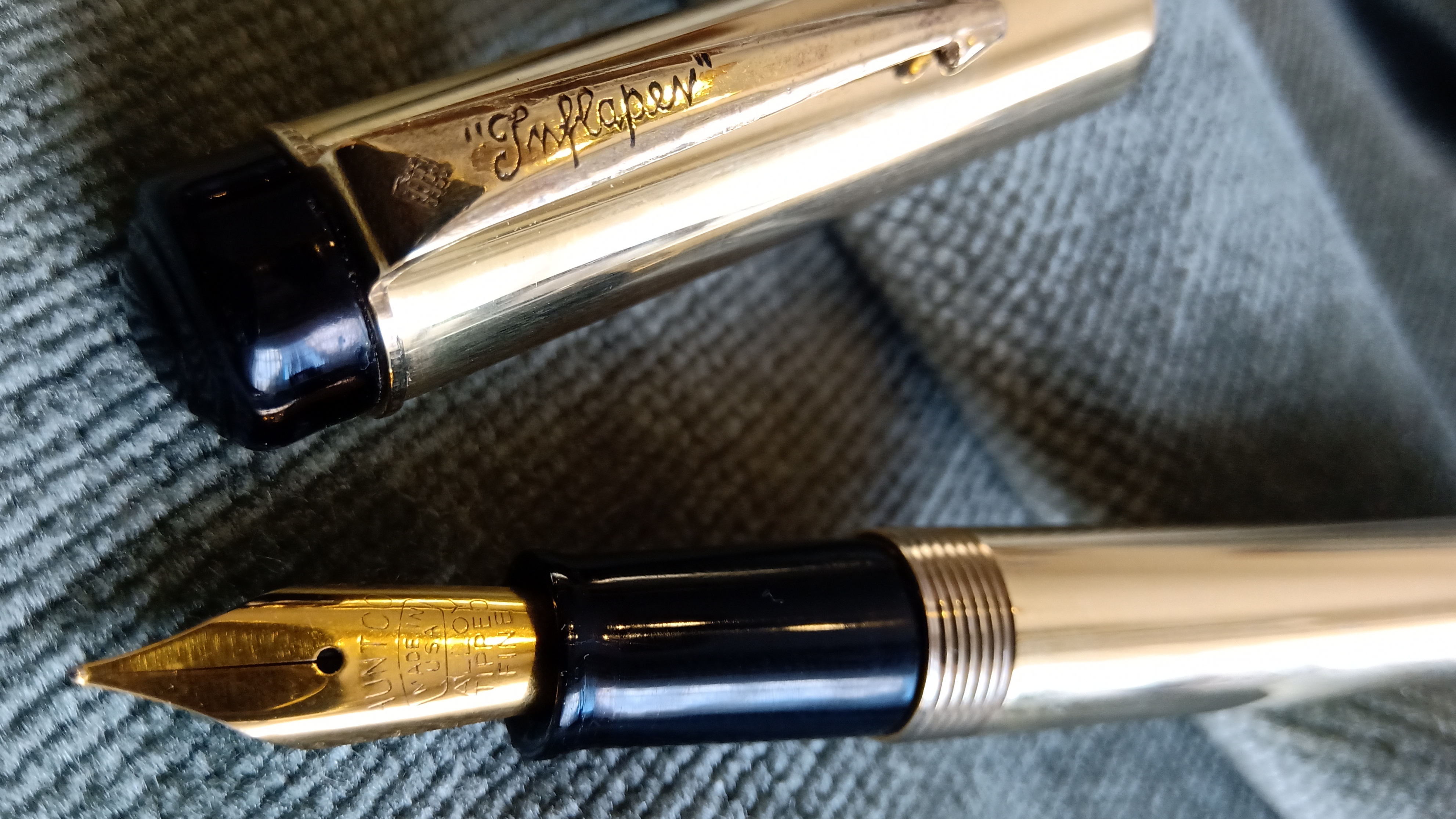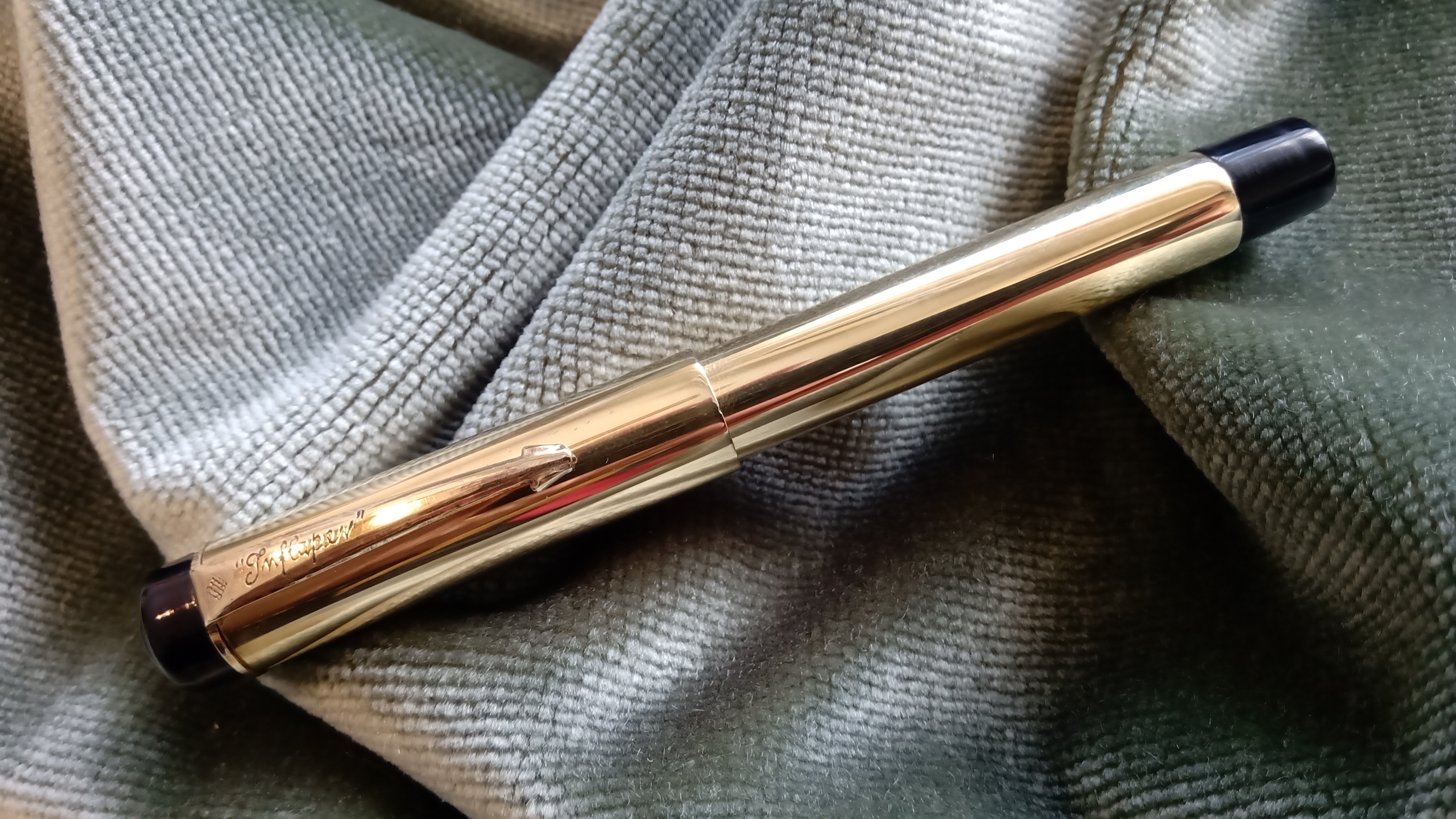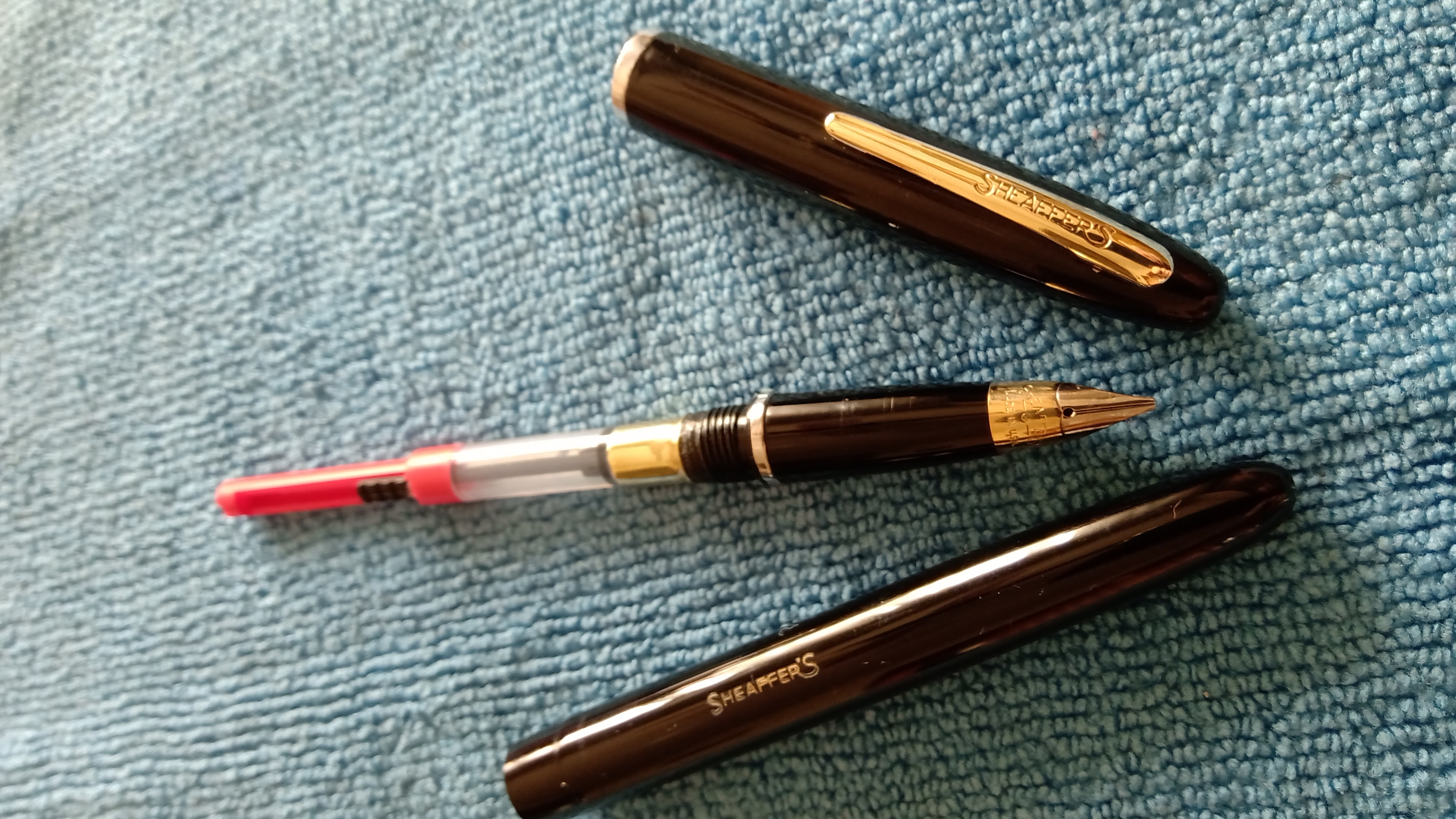 Si tratta di una Sheaffer's degli anni 60/70 quasi interamente prodotta in Argentina, e dico Sheaffer's e non Sheaffer, Imperial 777, Stylist Lifetime, con corpo, cappuccio e clip placcati oro incisi, con sistema di conversione aerometrica originale, impugnatura in acrilico nera, e un magnifico pennino corto conico originale, in argento palladio prodotto negli Stati Uniti, che ad un certo punto gli ho presentato nel forum e che scrive meravigliosamente...!!!