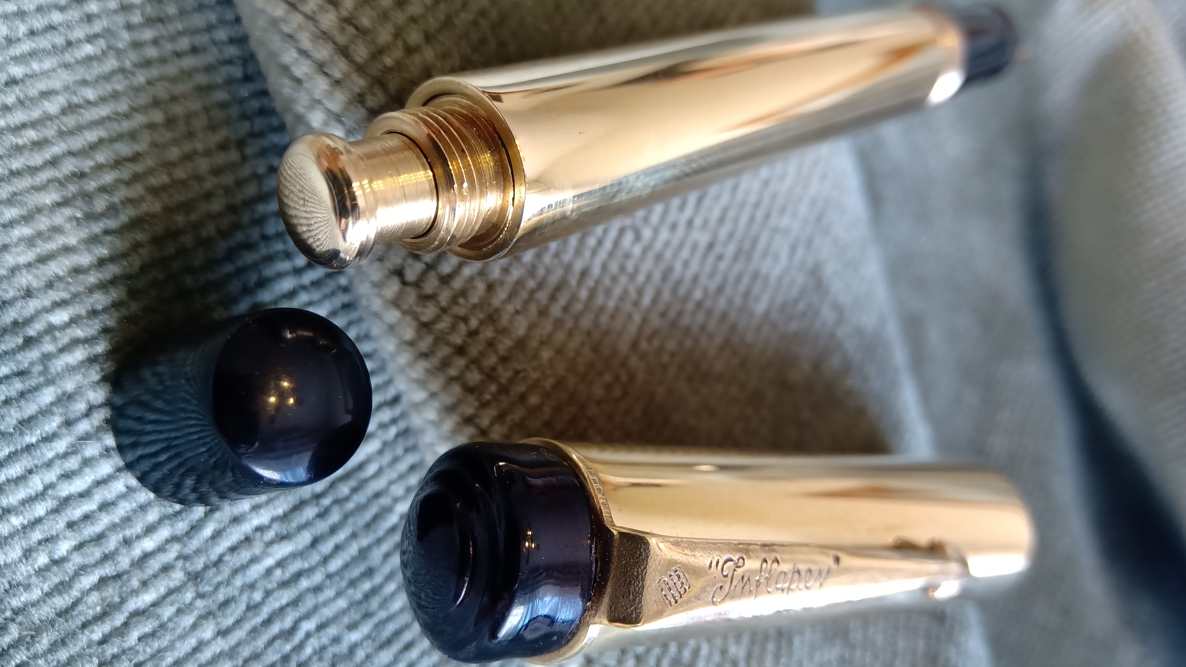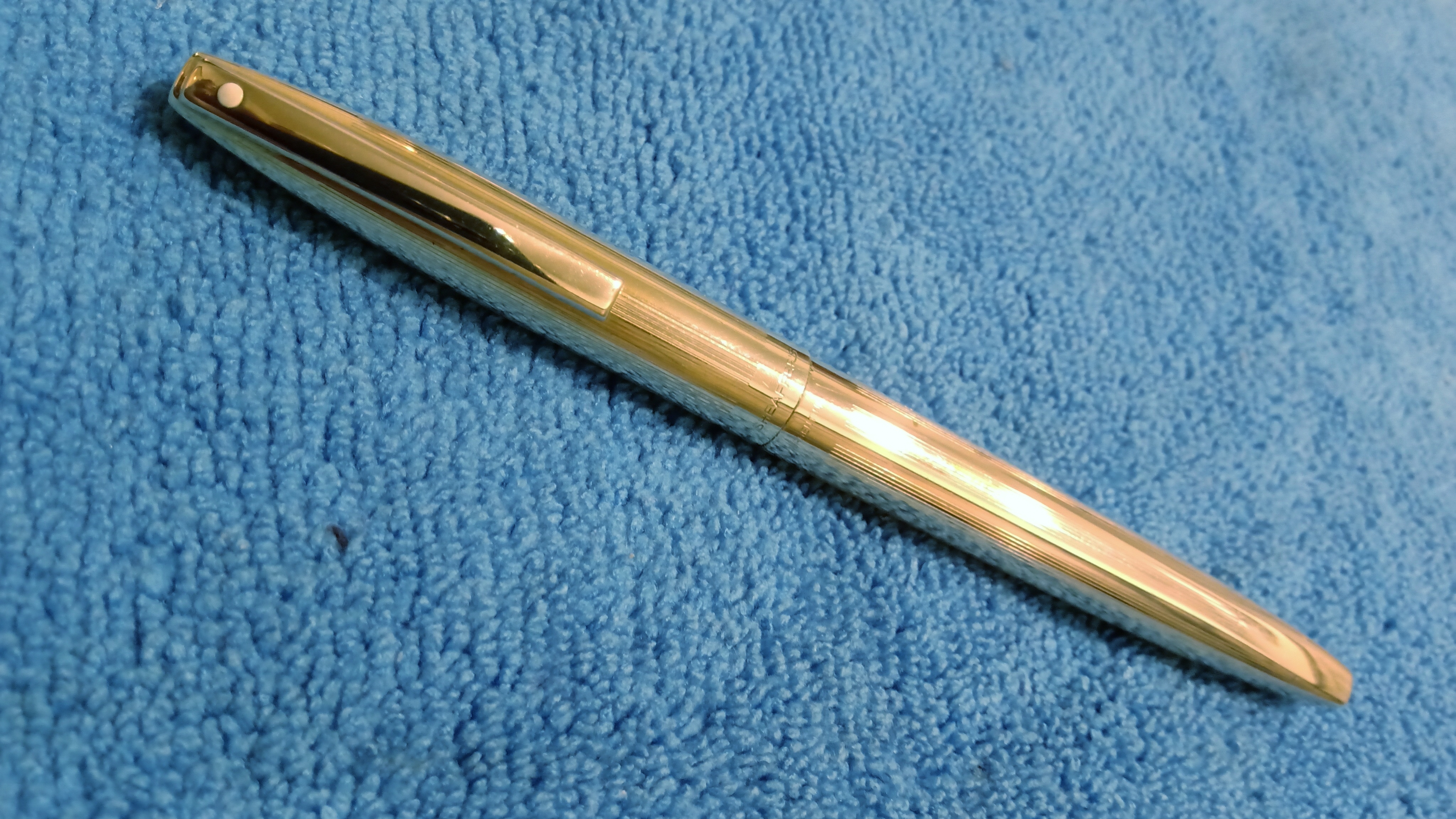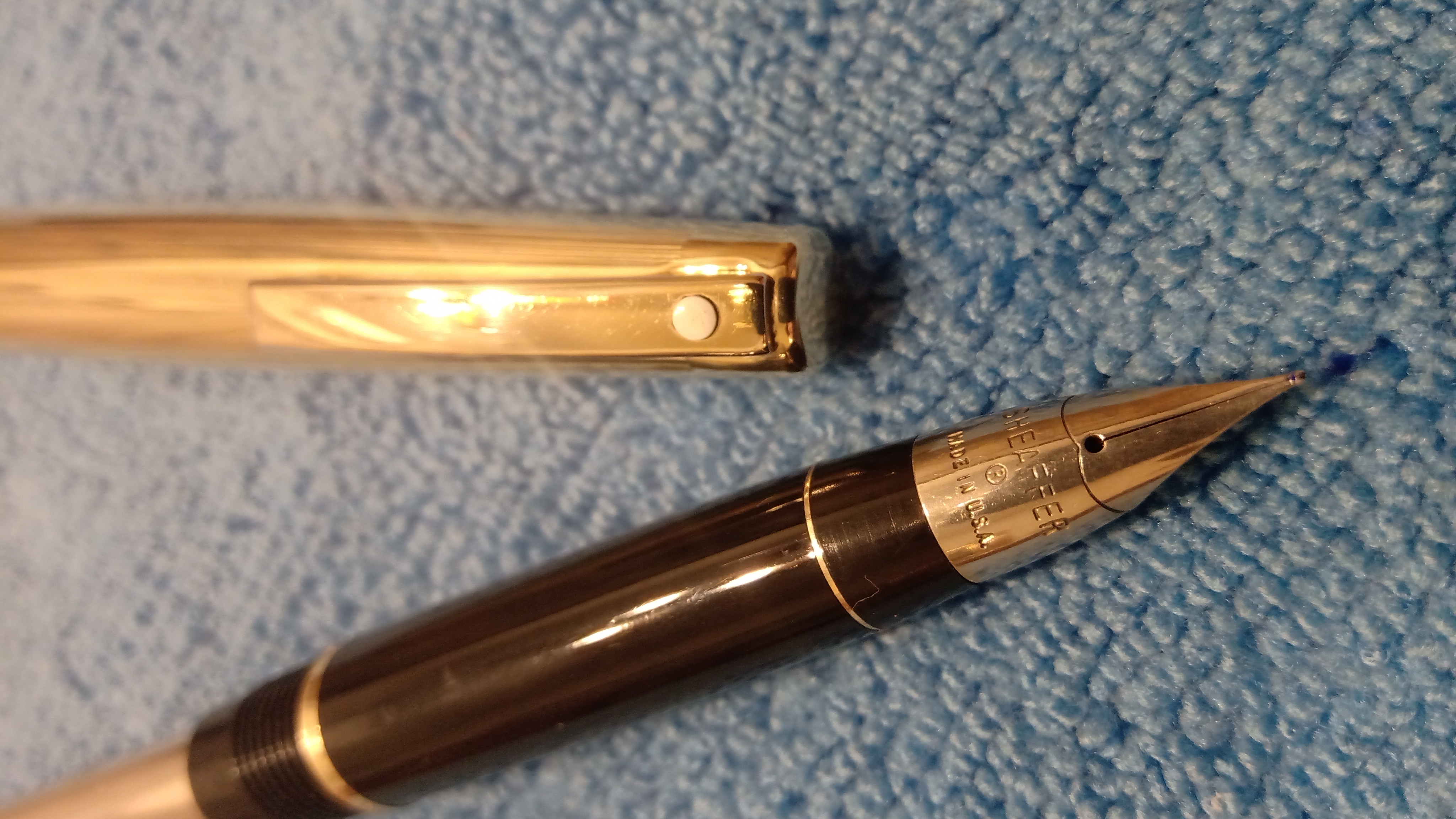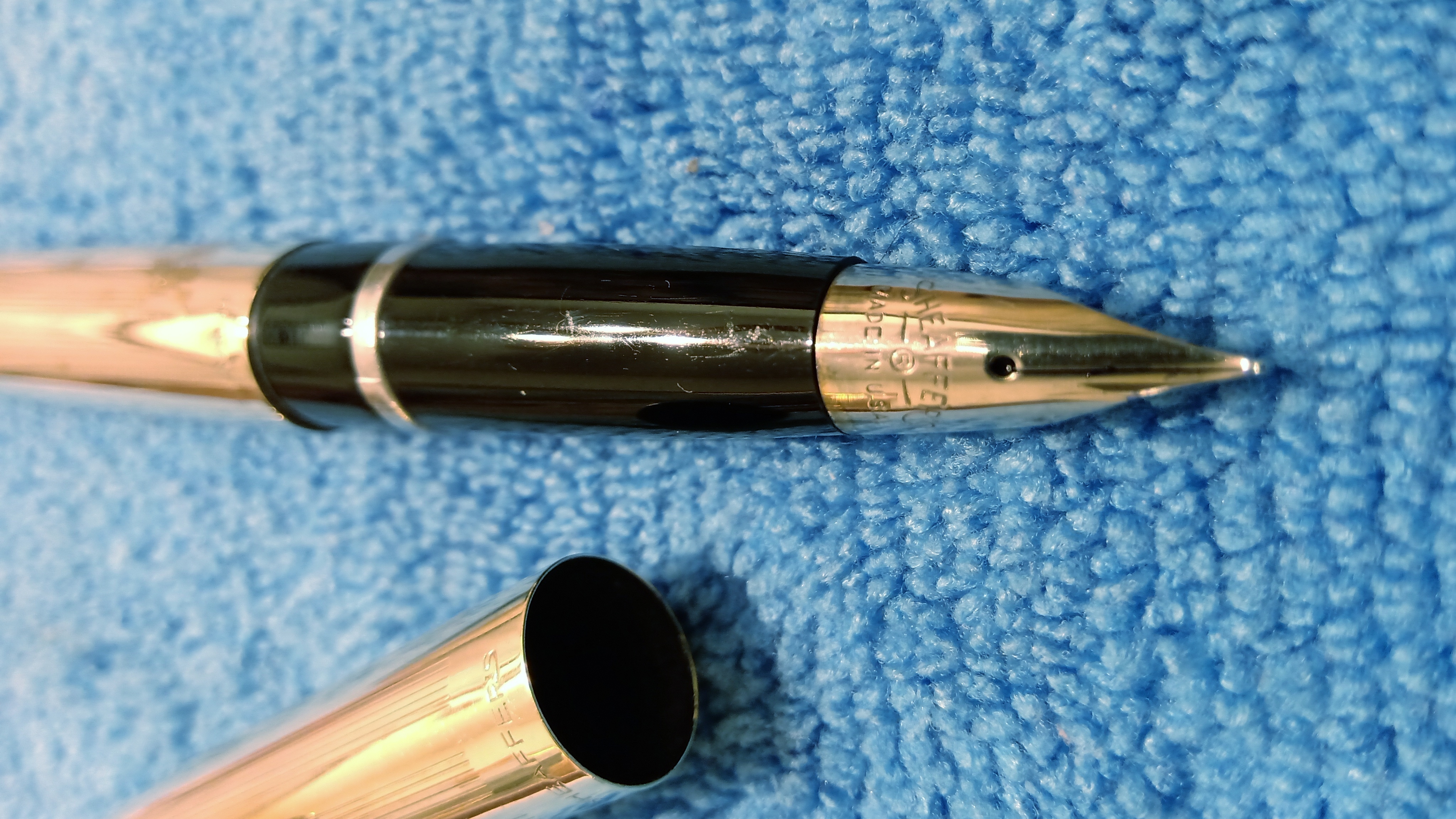 Si tratta di una Sheaffer's degli anni 60/70 quasi interamente prodotta in Argentina, e dico Sheaffer's e non Sheaffer, Imperial 777, Stylist Lifetime, con corpo, cappuccio e clip placcati oro incisi, con sistema di conversione aerometrica originale, impugnatura in acrilico nera, e un magnifico pennino corto conico originale, in argento palladio prodotto negli Stati Uniti, che ad un certo punto gli ho presentato nel forum e che scrive meravigliosamente...!!!