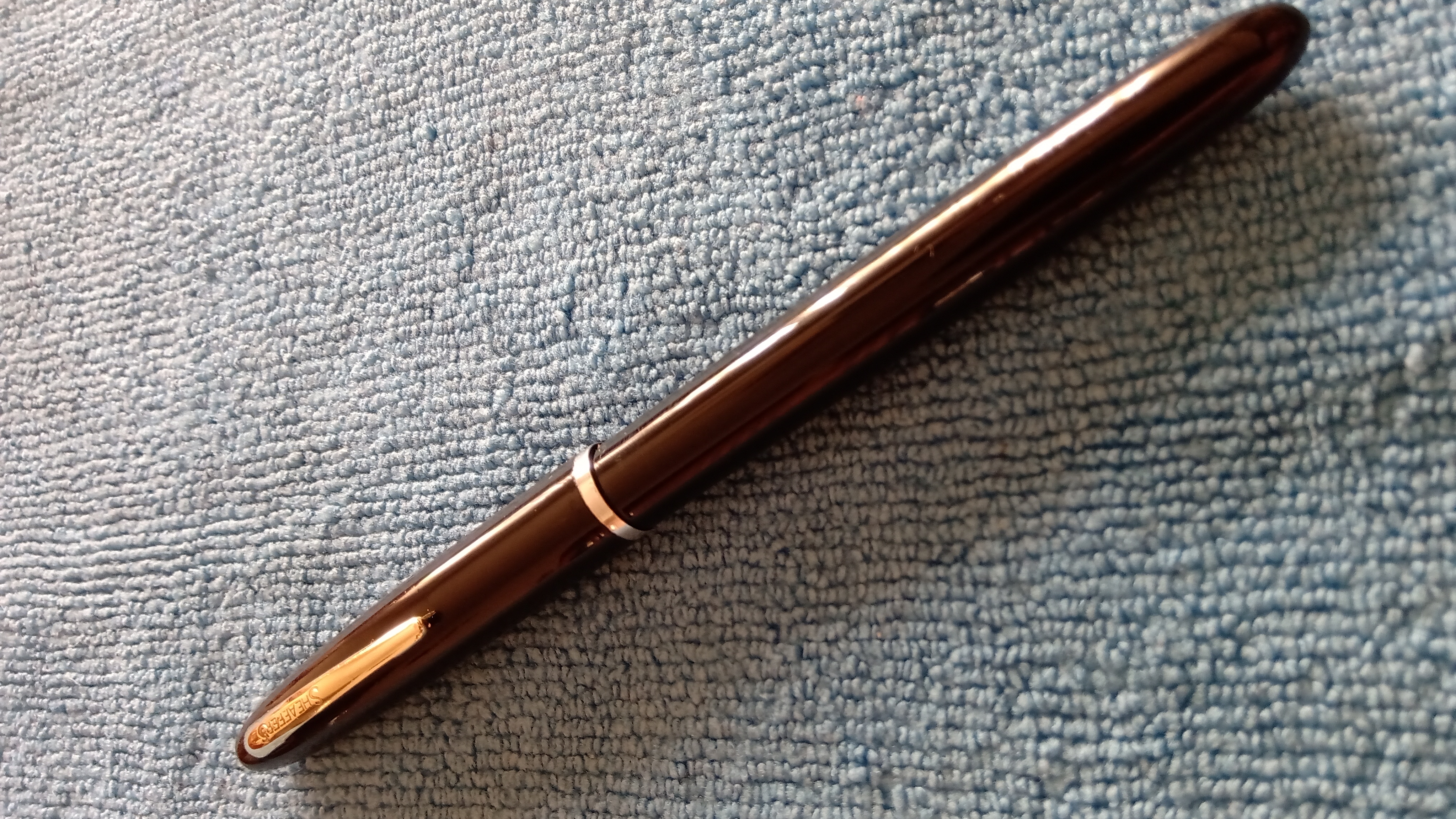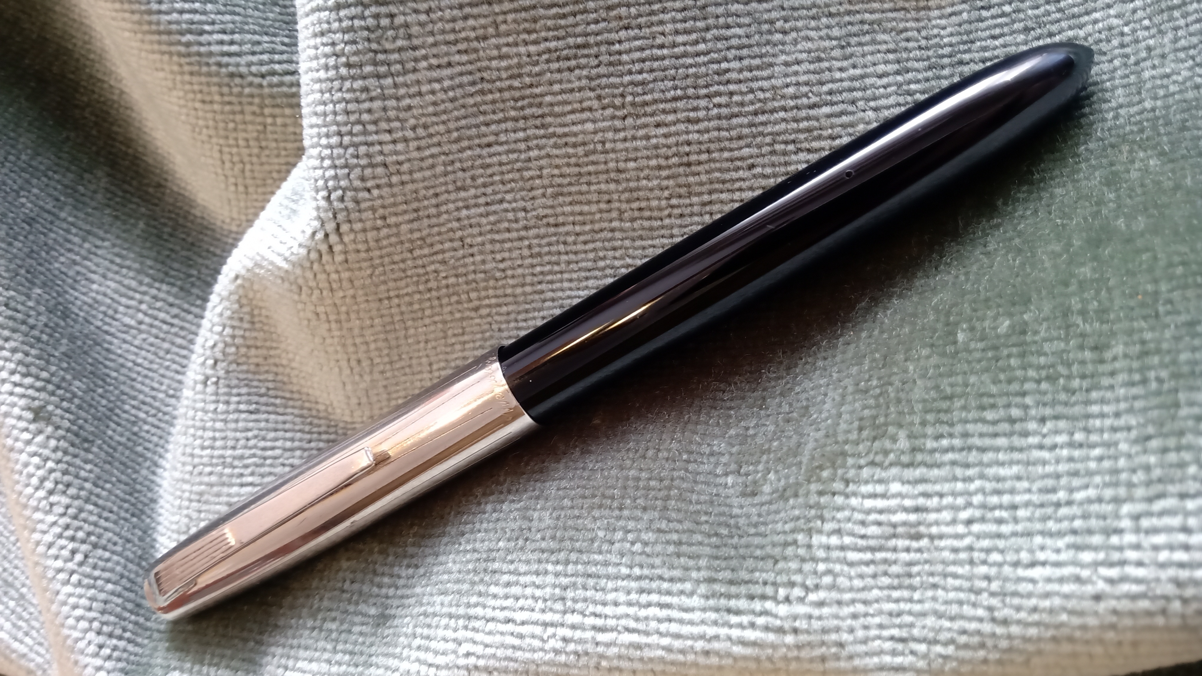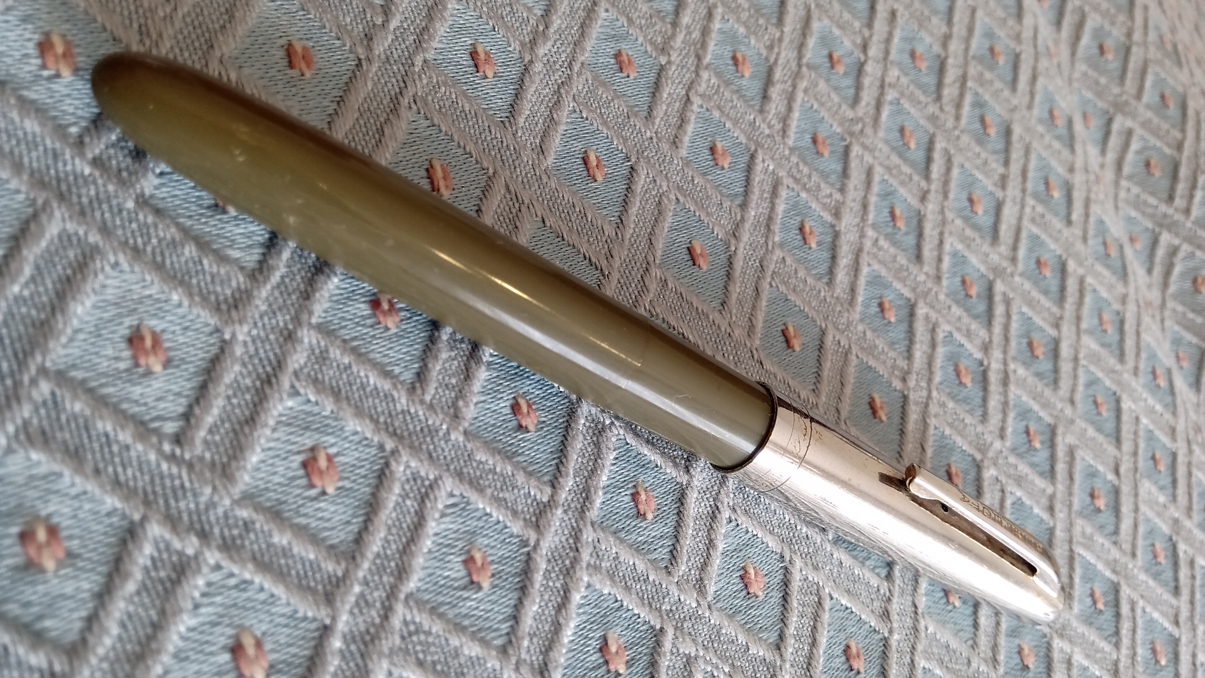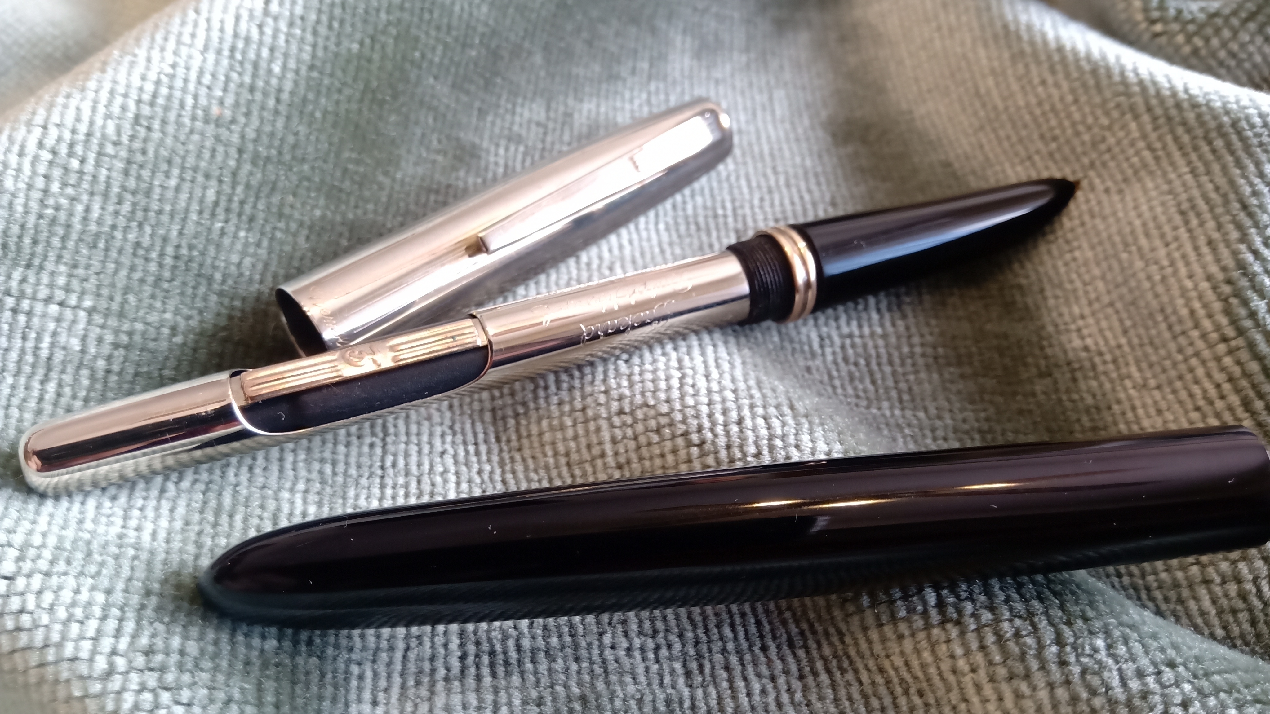 Si tratta di una Sheaffer's degli anni 60/70 quasi interamente prodotta in Argentina, e dico Sheaffer's e non Sheaffer, Imperial 777, Stylist Lifetime, con corpo, cappuccio e clip placcati oro incisi, con sistema di conversione aerometrica originale, impugnatura in acrilico nera, e un magnifico pennino corto conico originale, in argento palladio prodotto negli Stati Uniti, che ad un certo punto gli ho presentato nel forum e che scrive meravigliosamente...!!!