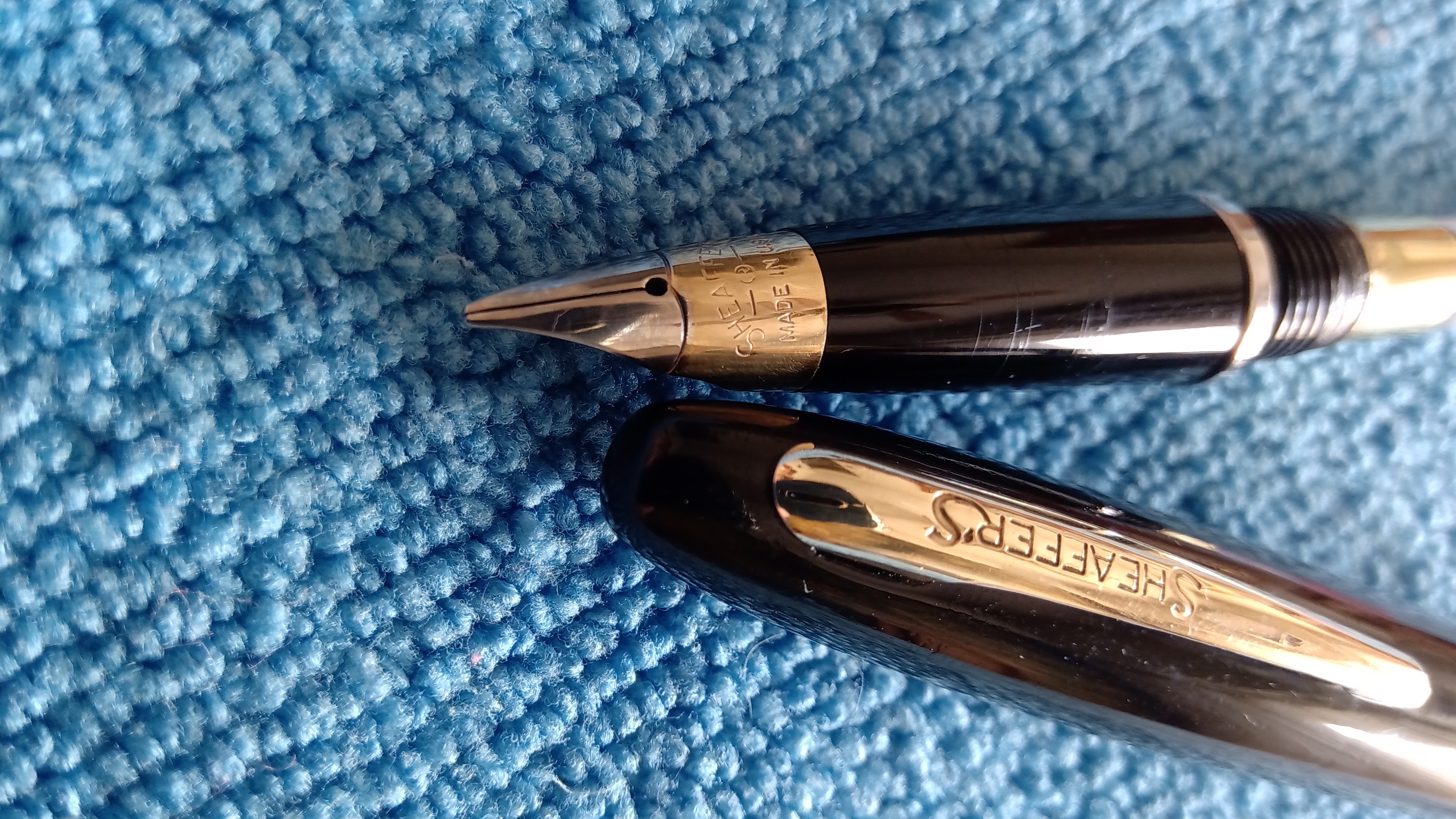 Una altra misteriosa Sheaffer's, e non Sheaffer, degli anni 60/70 made in Argentina, con clip in oro, cappuccio, corpo e impugnatura in acrilico nero, con sistema a cartuccia (è stato posizionato un convertitore), e un'interessante pennino conico corto originale, in oro con maschera in platino, prodotto negli U.S.A. e con una linea spessa...