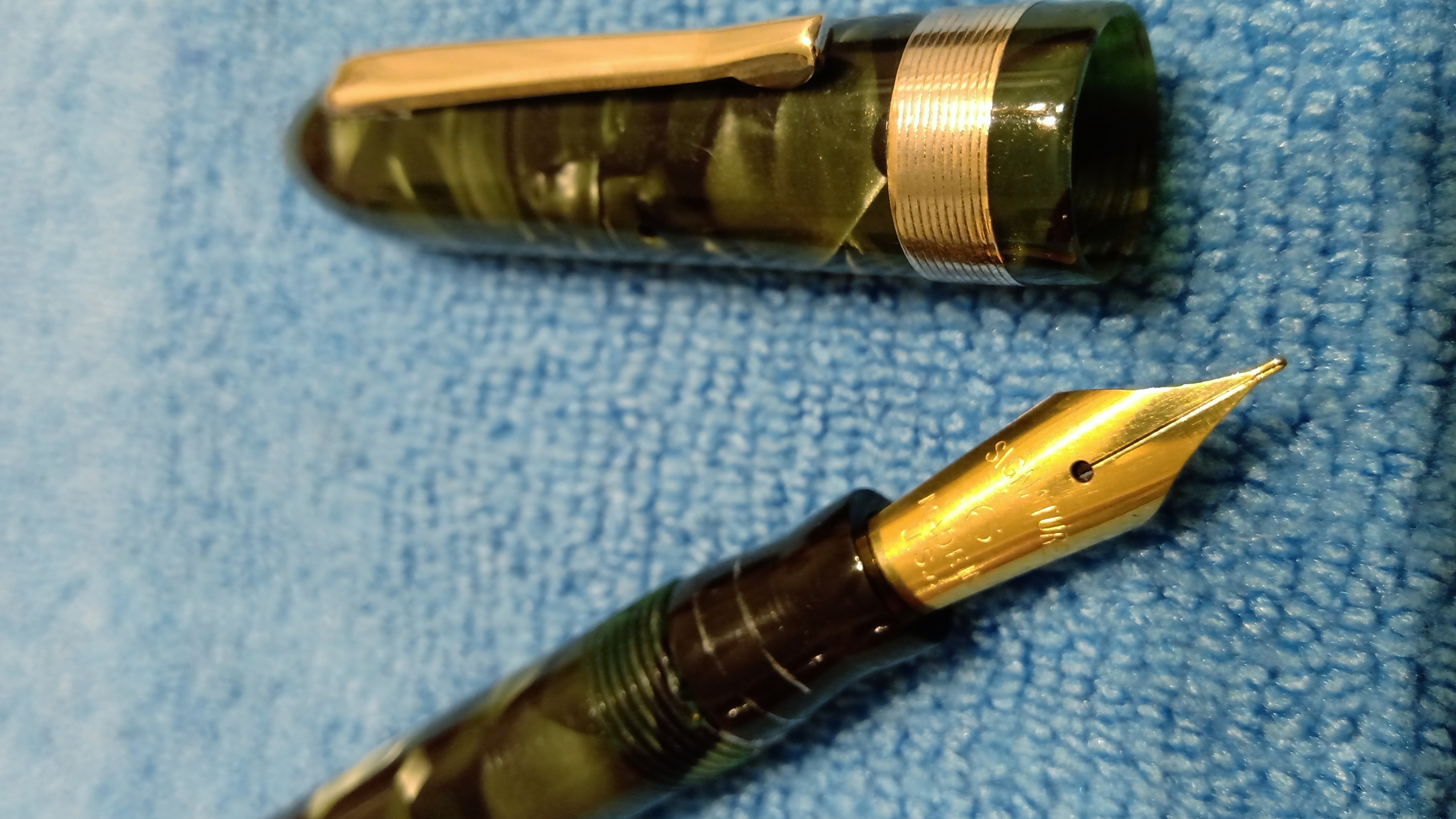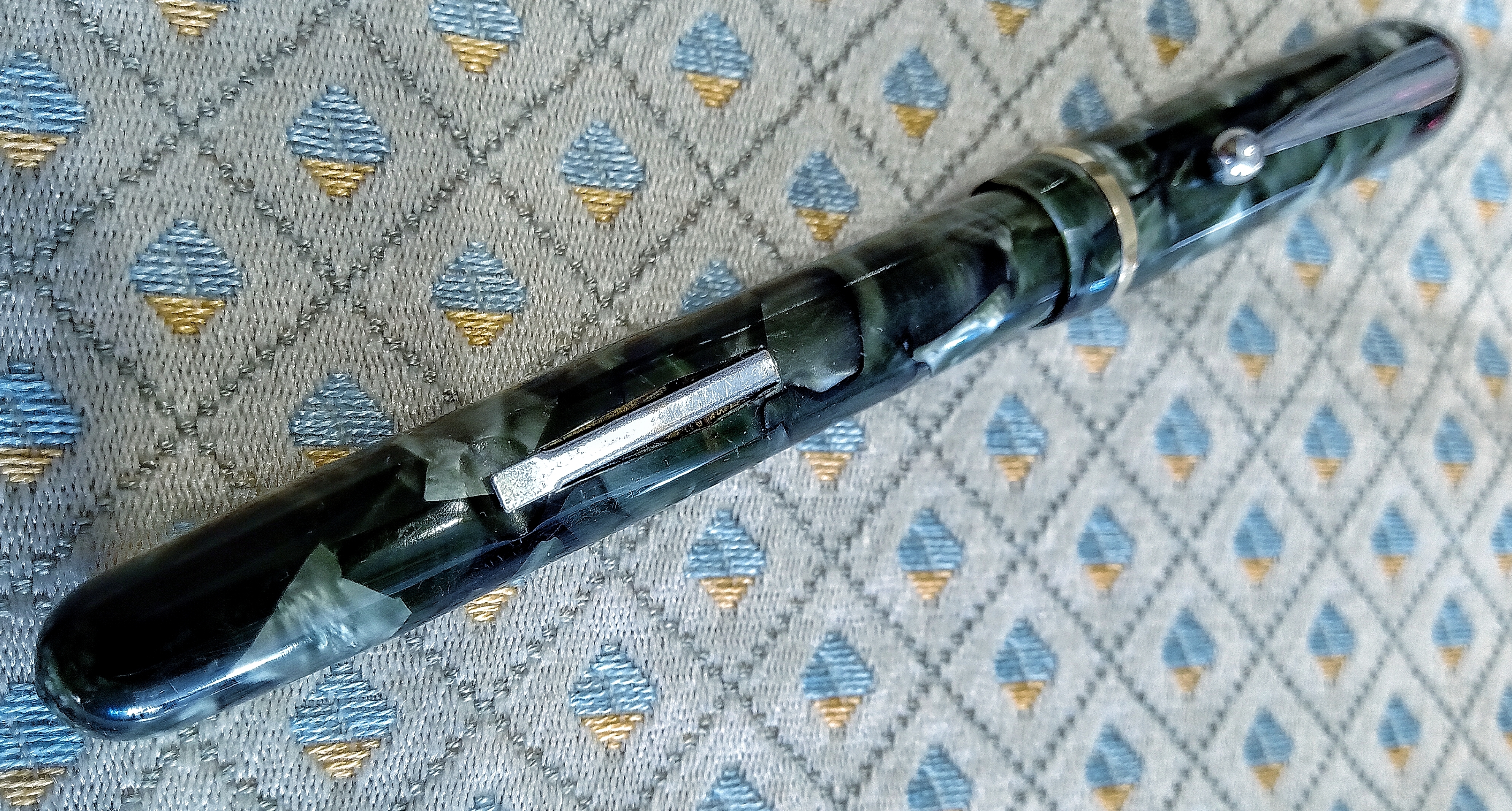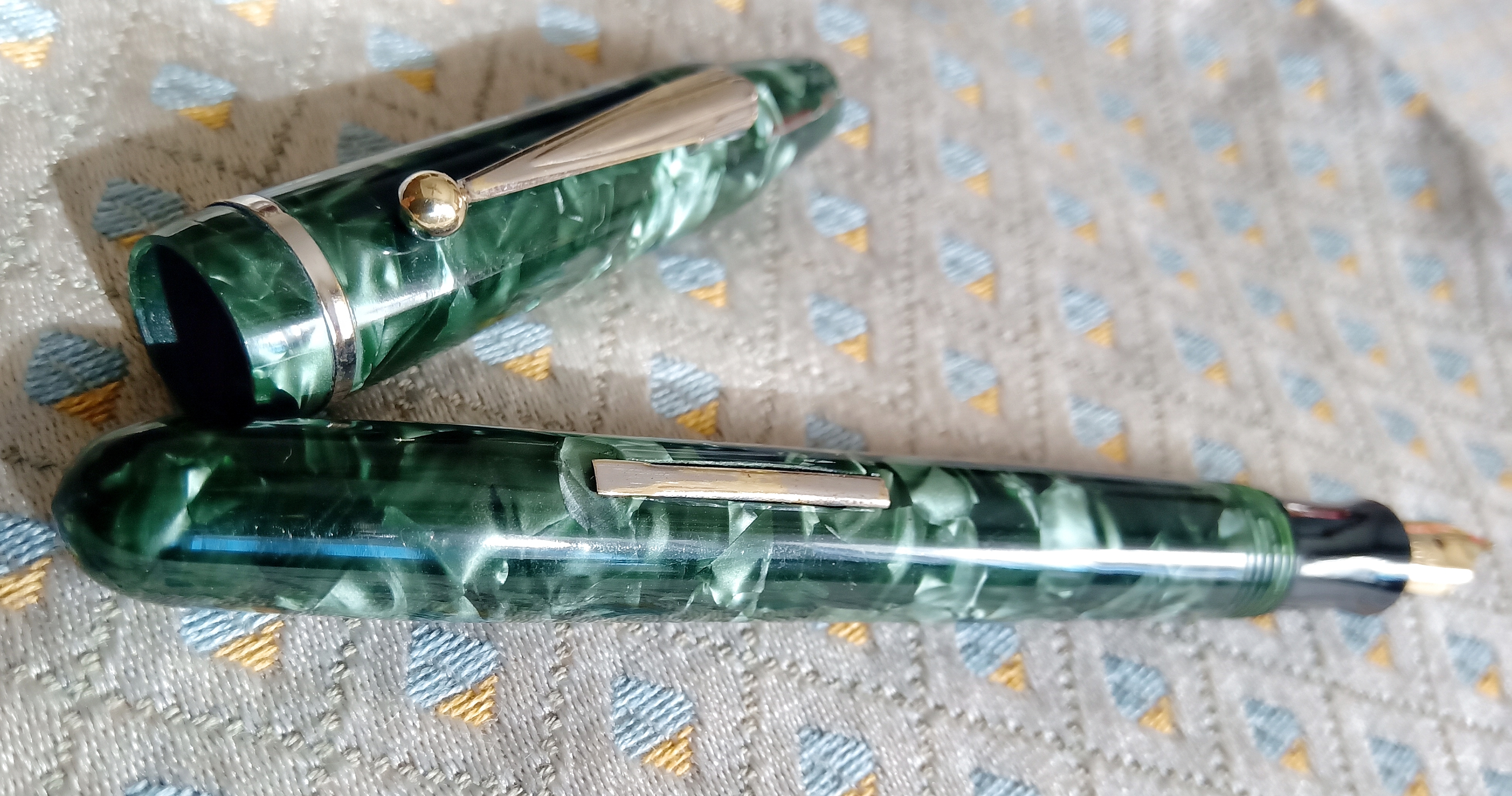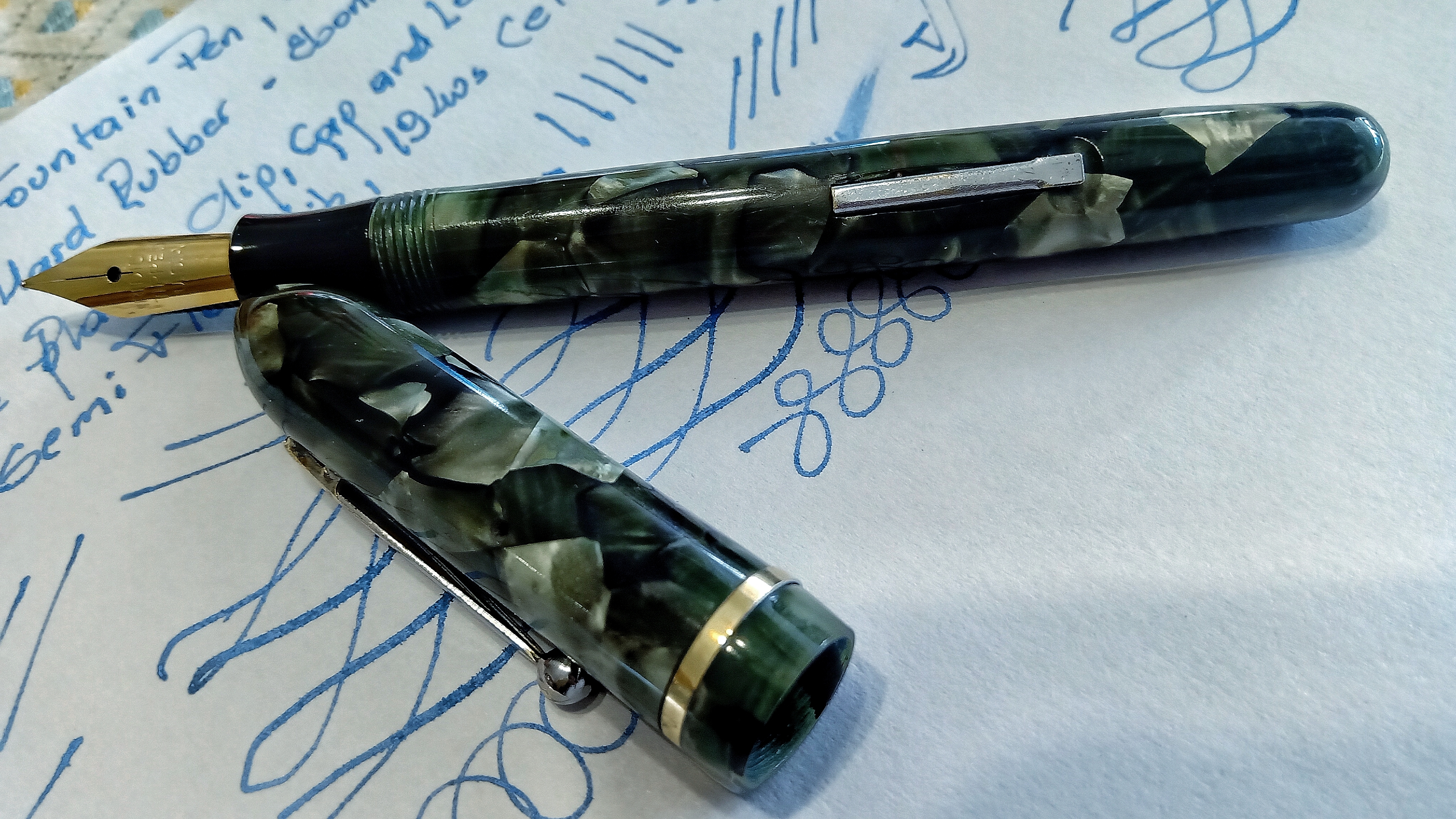 In questo caso un'altra stilografica degli anni 40 circa, dove compare solo l'impronta della provenienza ma non il marchio, con sistema di caricamento a leva, pennino aperto placcato oro non originale Iridium Tipped, impugnatura in ebanite, corpo e cappuccio in celluloide laminata , argento perlato e marmorizzato verde, clip, leva di caricamento e fascia del cappuccio cromate...
