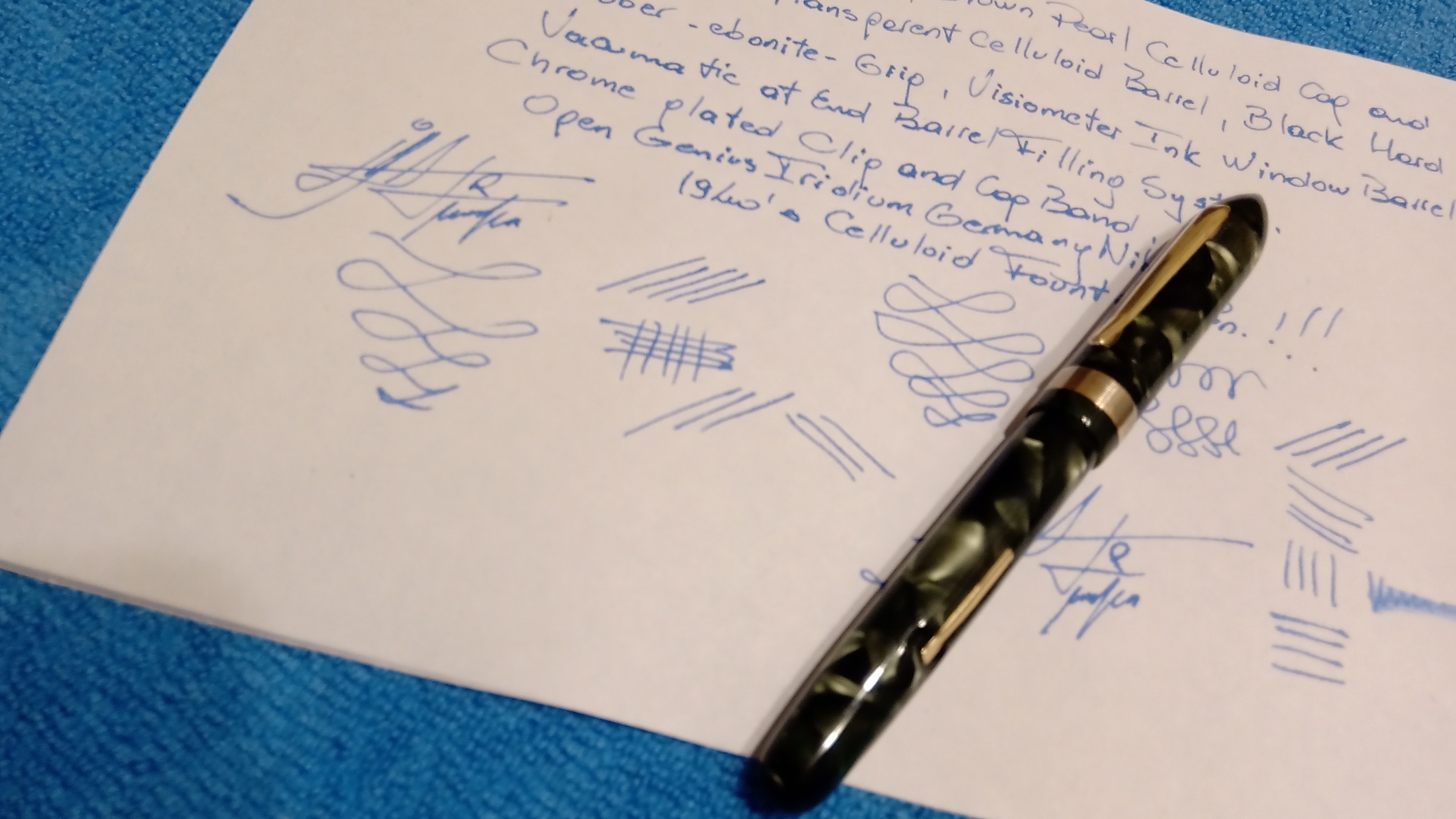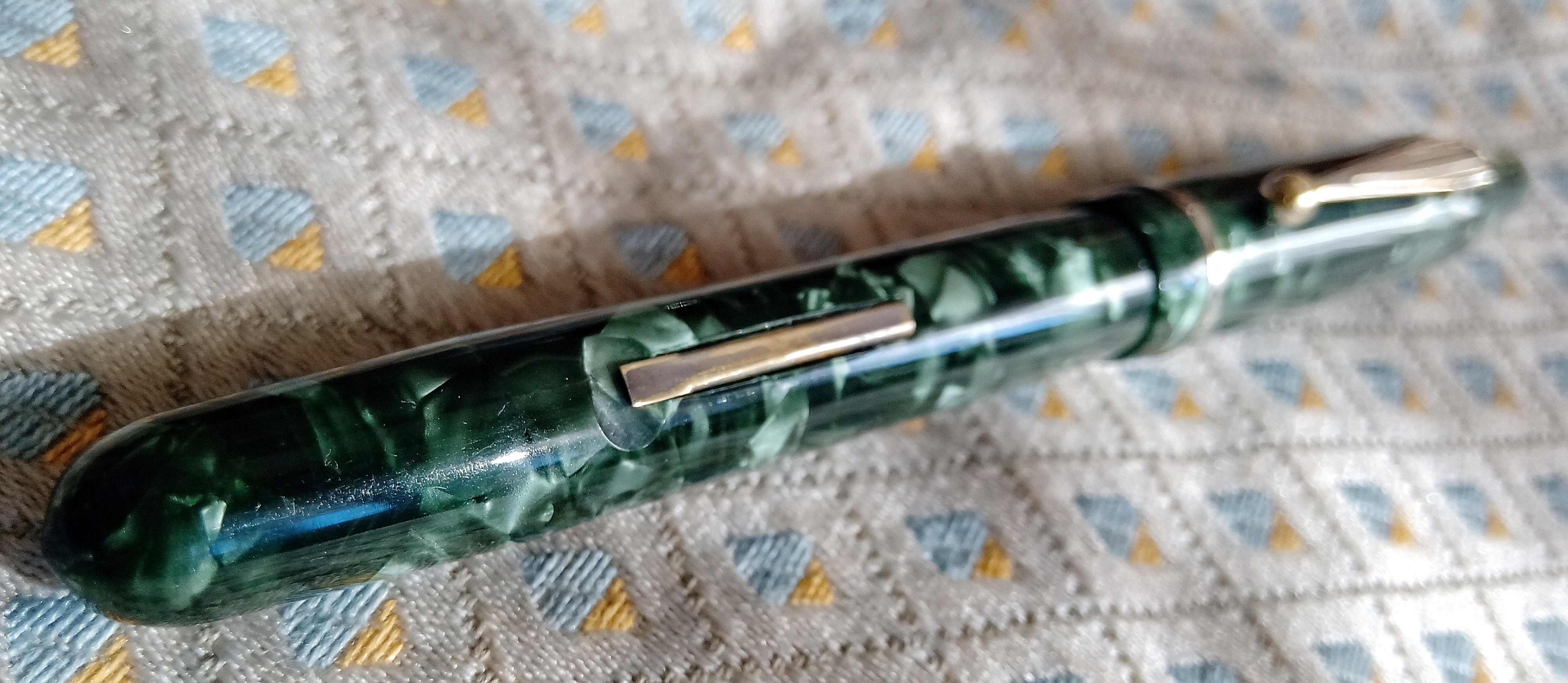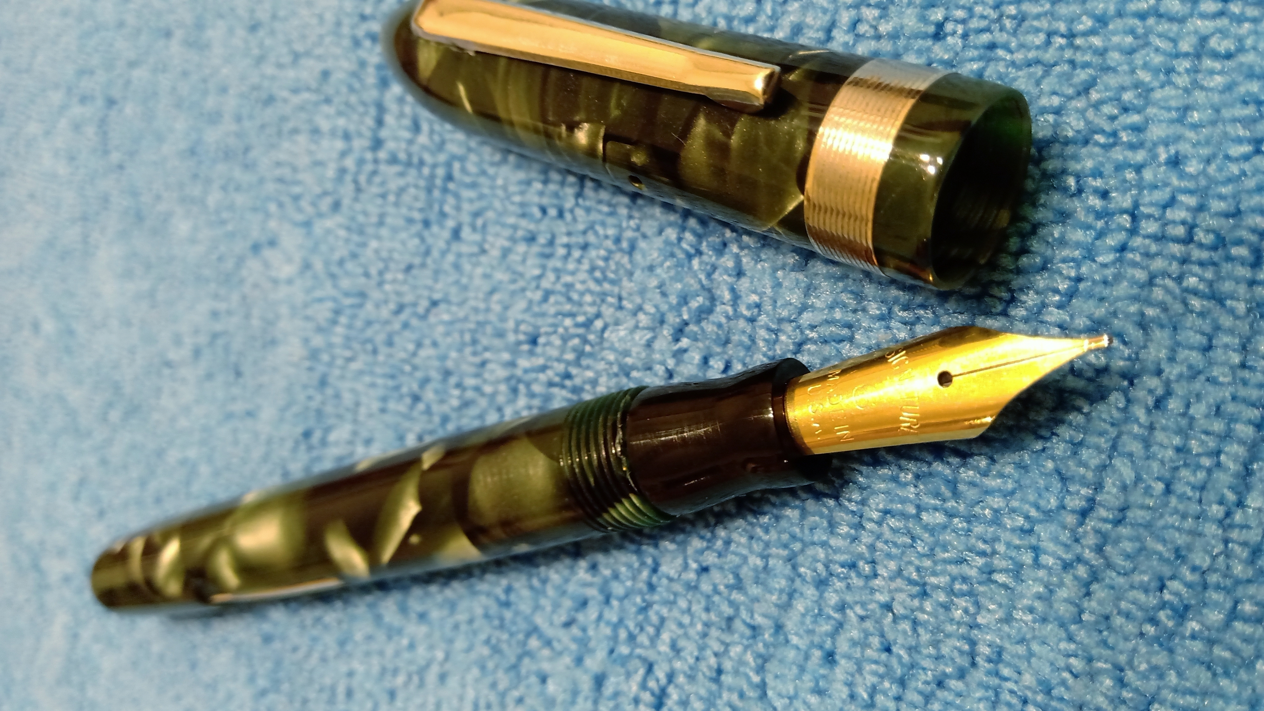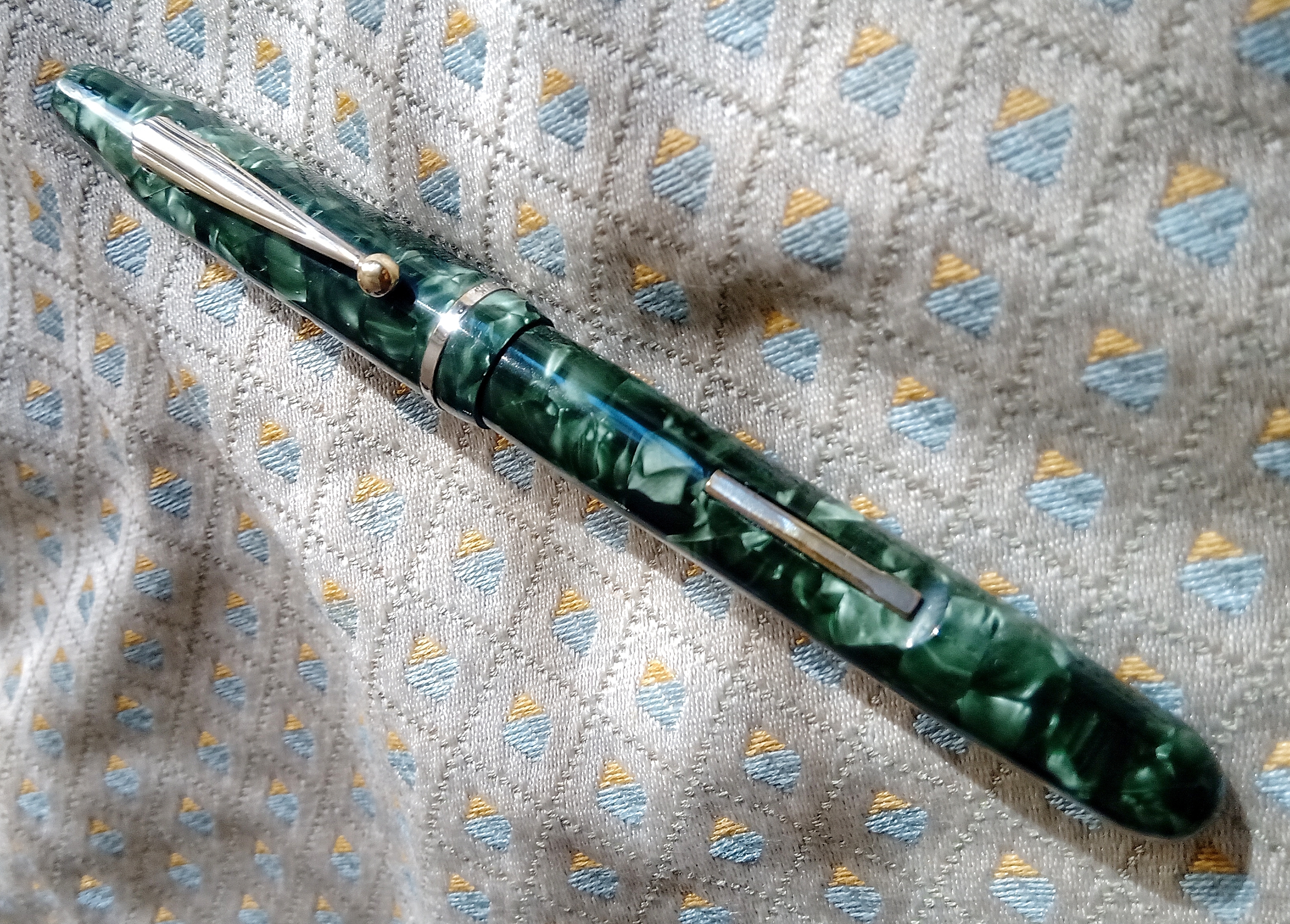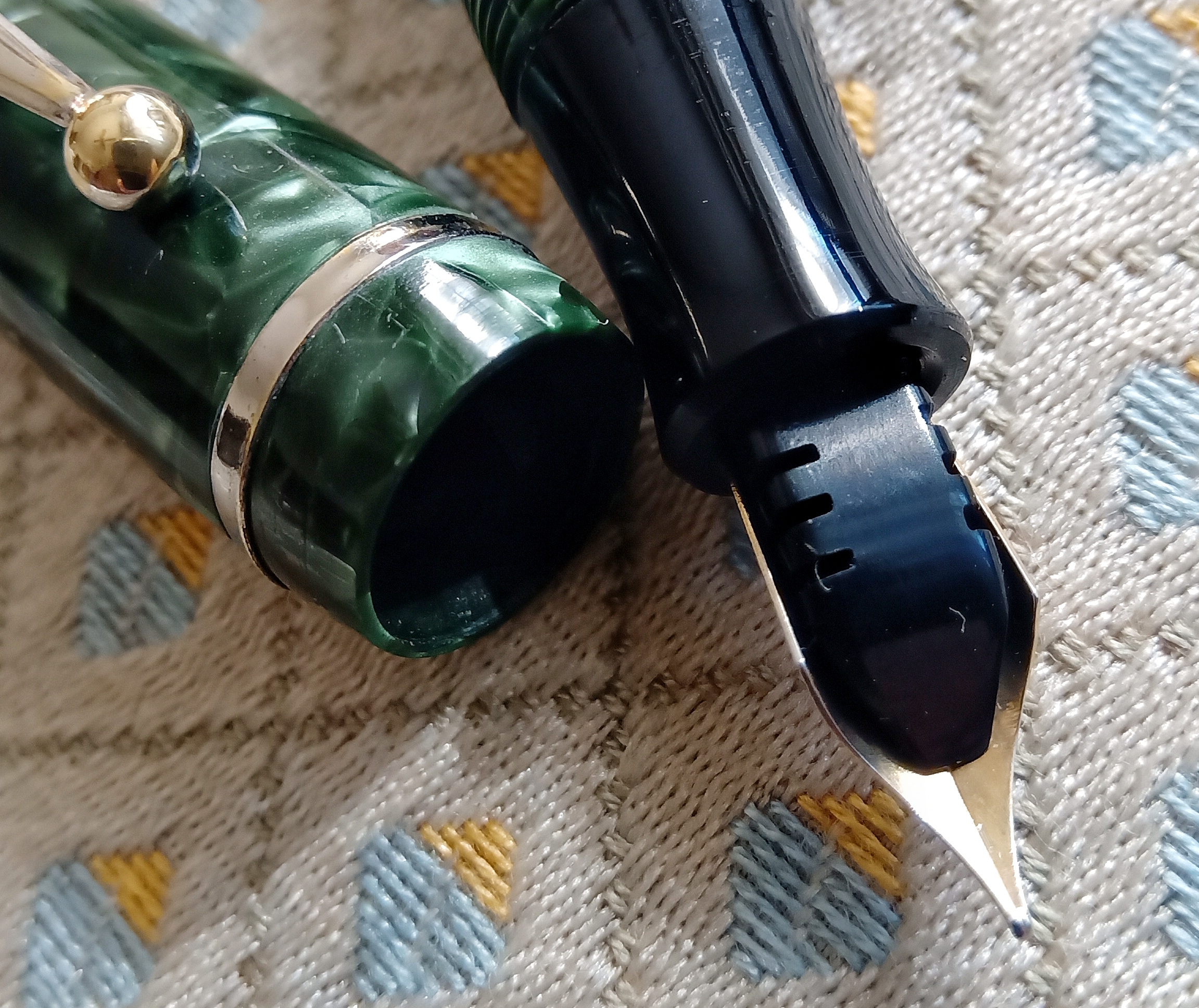 In questo caso un'altra stilografica degli anni 40 circa, dove compare solo l'impronta della provenienza ma non il marchio, con sistema di caricamento a leva, pennino aperto placcato oro non originale Iridium Tipped, impugnatura in ebanite, corpo e cappuccio in celluloide laminata , argento perlato e marmorizzato verde, clip, leva di caricamento e fascia del cappuccio cromate...
