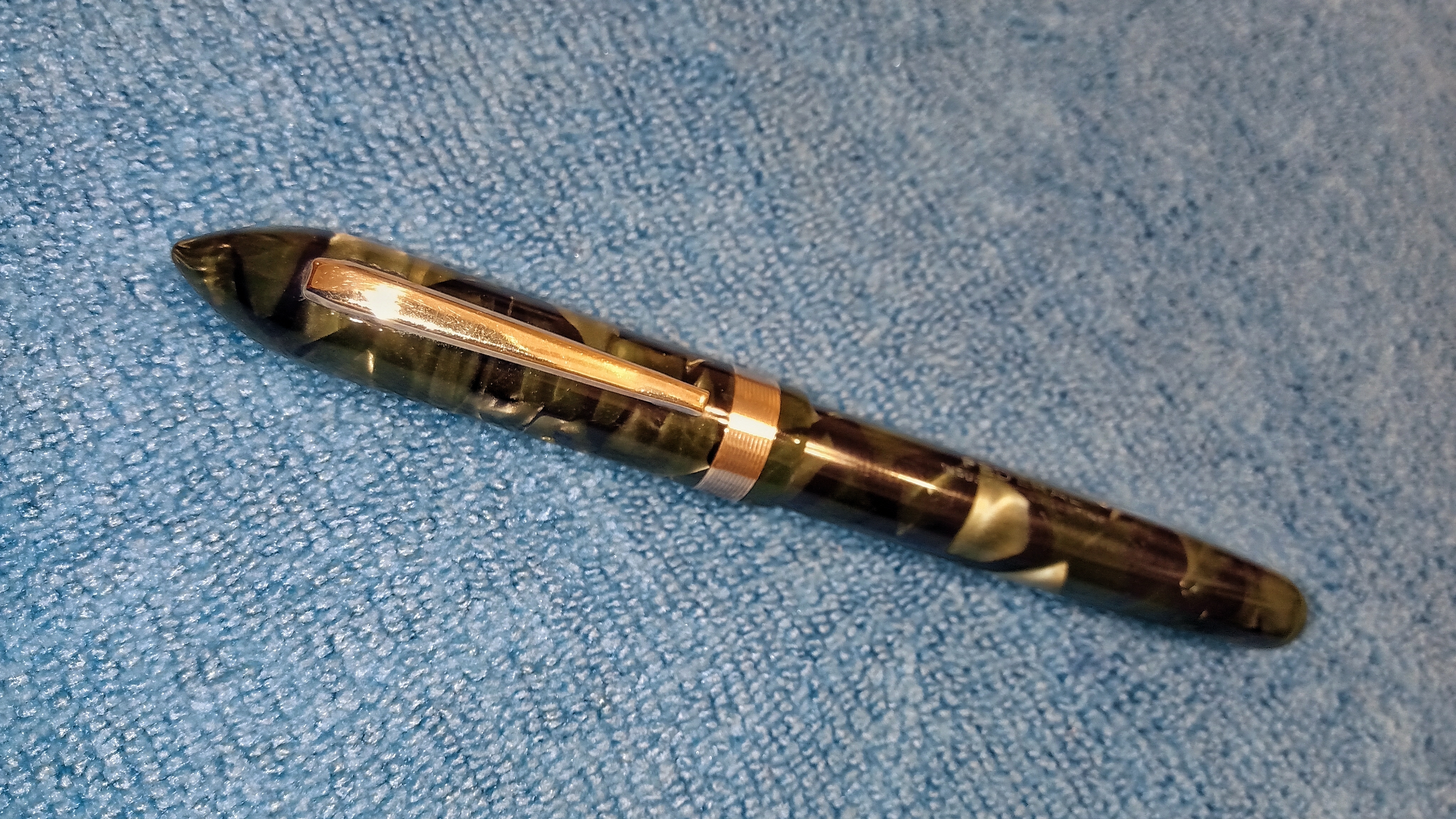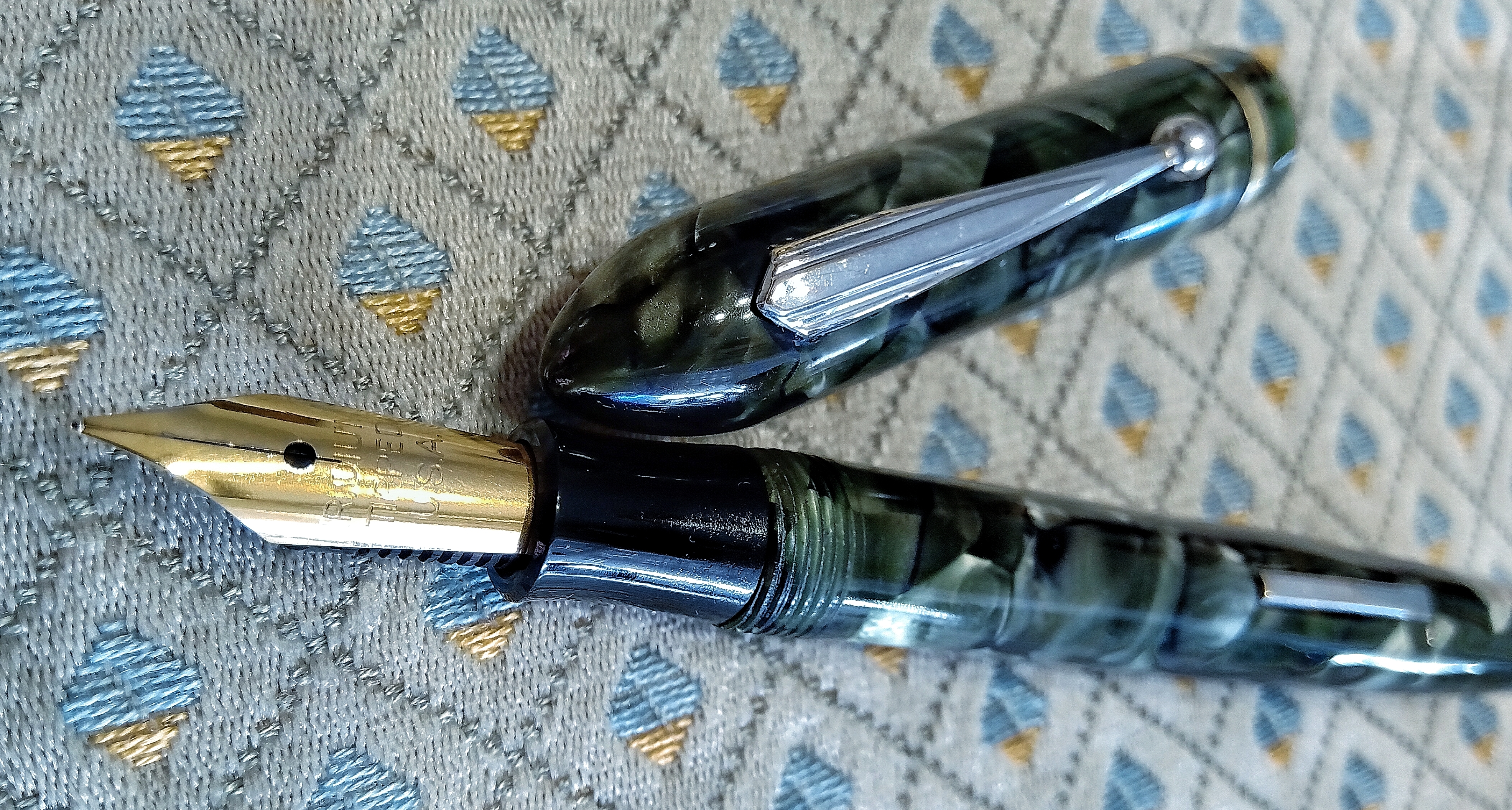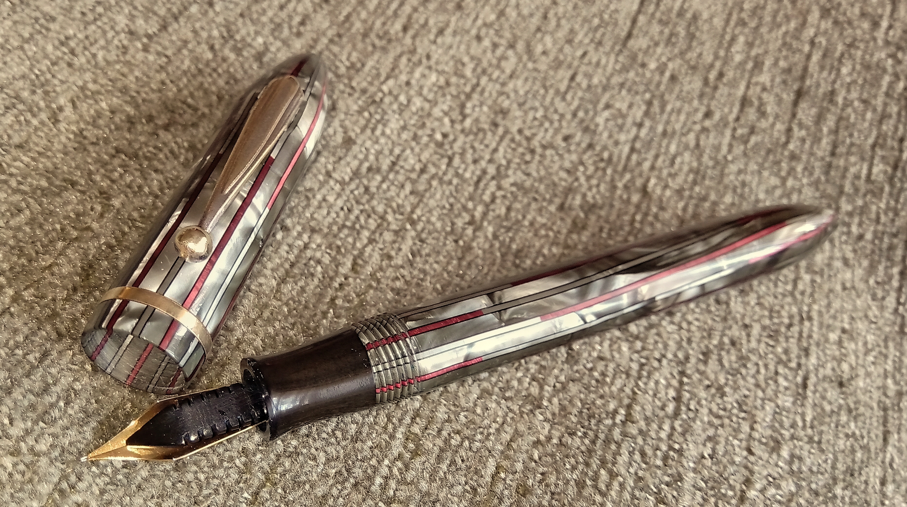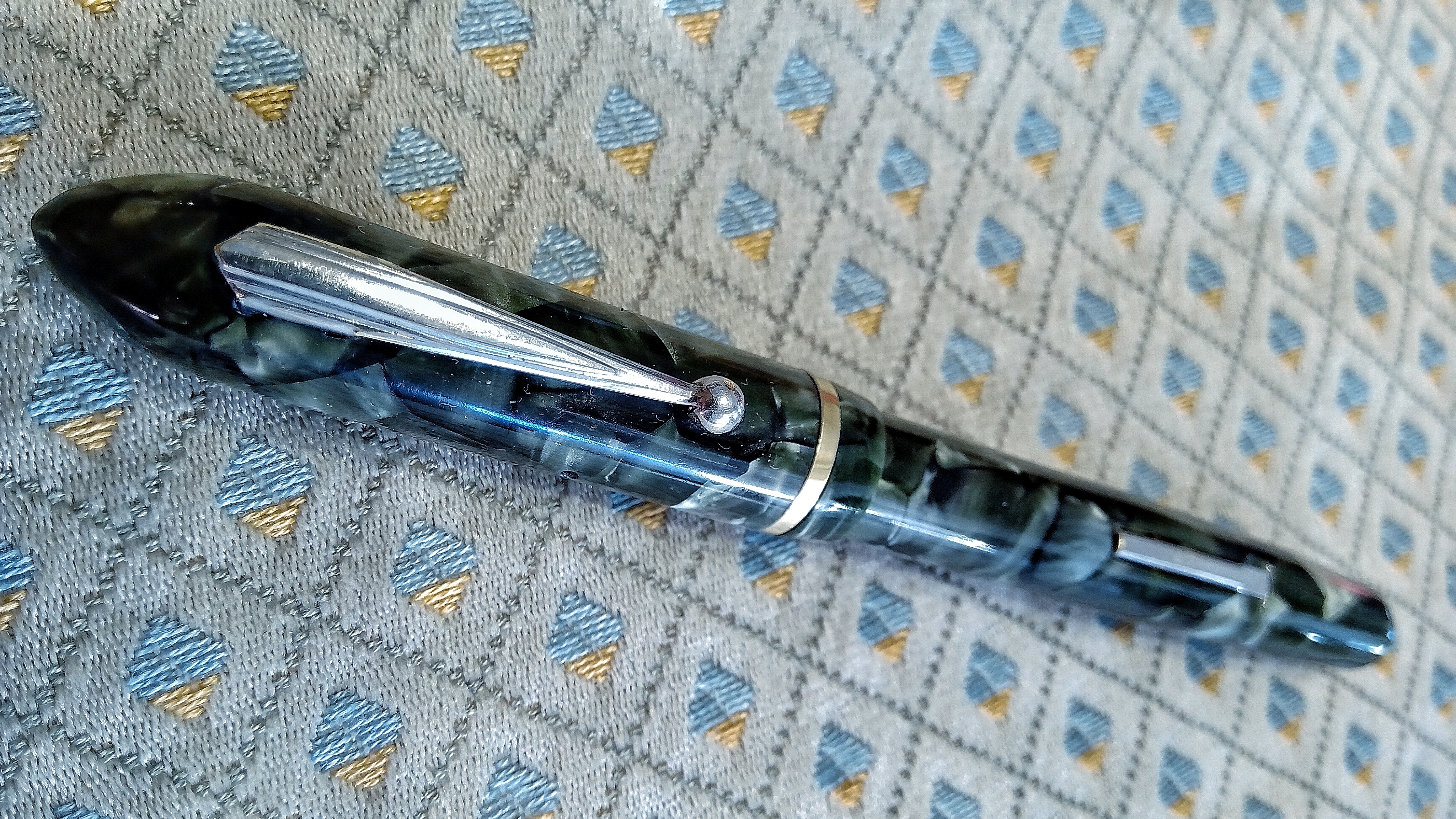 In questo caso un'altra stilografica degli anni 40 circa, dove compare solo l'impronta della provenienza ma non il marchio, con sistema di caricamento a leva, pennino aperto placcato oro non originale Iridium Tipped, impugnatura in ebanite, corpo e cappuccio in celluloide laminata , argento perlato e marmorizzato verde, clip, leva di caricamento e fascia del cappuccio cromate...