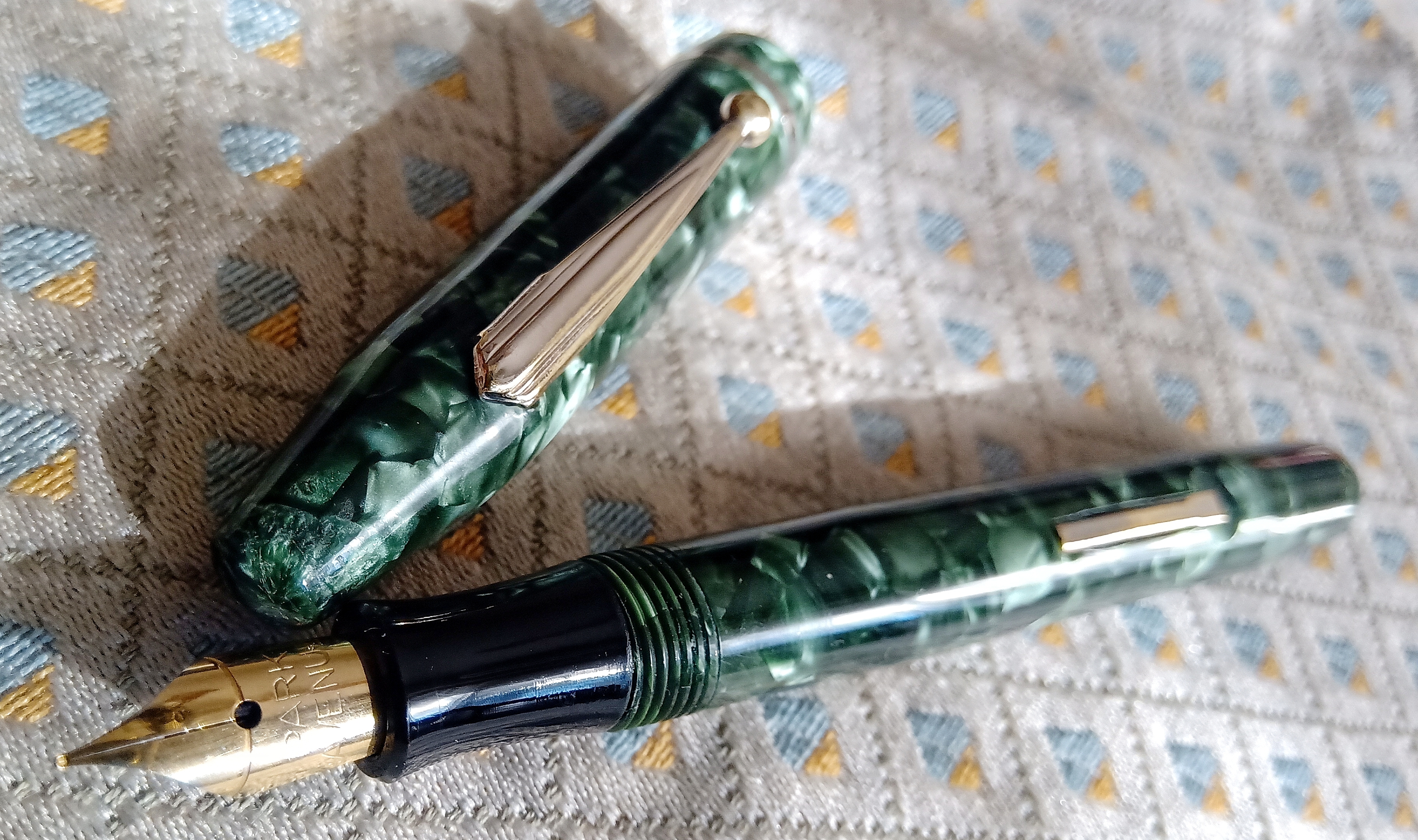 Lasciando ora queste penne stilografiche di marche internazionali che all'epoca venivano prodotte da filiali in Argentina, passiamo ora a marche propriamente argentine, come nel caso di Artcraft, azienda nata negli U.S.A. e che negli anni 30, in piena crisi finanziaria, finì per trasferirsi e continuare a produrre i suoi modelli in Argentina, come nel caso di questo Artcraft prodotto negli anni '40 dalla Artcraft Pen Company del paese, con un sistema di ricarica leva, pennino a vista Park Avenue placcato oro originario degli U.S.A., impugnatura in ebanite, corpo e cappuccio in celluloide laminata, argento perlato e verde smeraldo marmorizzato, clip, leva di caricamento e anelli del cappuccio cromato...