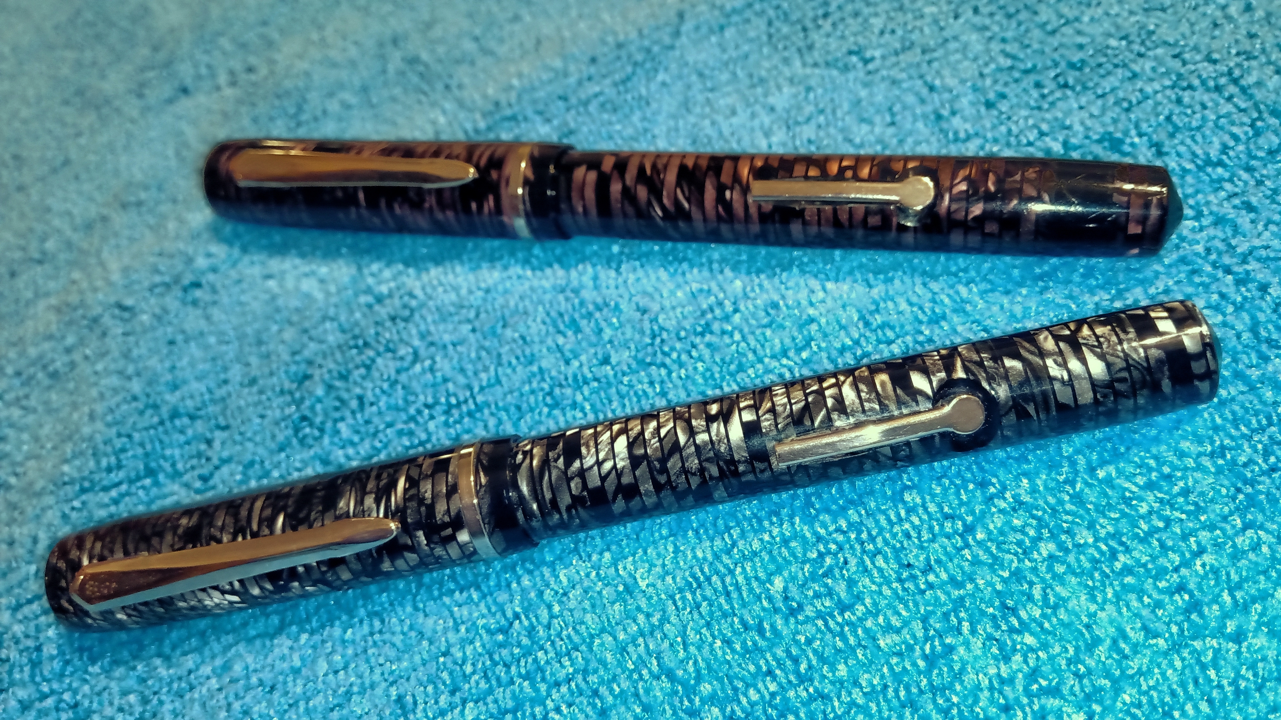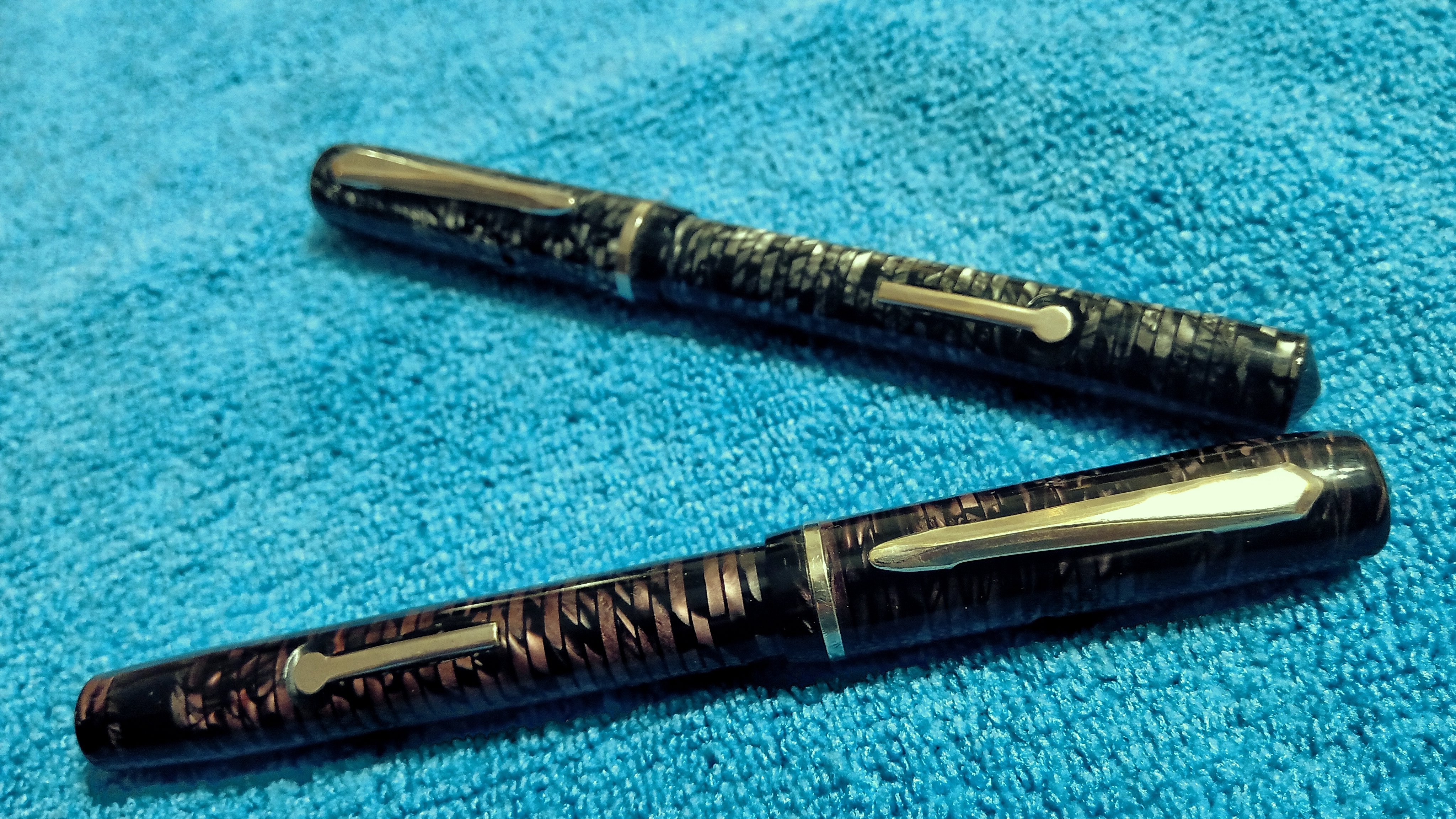 oppure queste due stilografiche marca Escritor (sottomarca della Artcraft) degli anni 40 circa, con sistema di caricamento a leva, pennino aperto non originale Osmiroid placcato oro, impugnatura in ebanite, corpo e cappuccio in celluloide laminata in astuccio con anelli in perlato argento e verde e nell'altro caso in argento perlato e rame, e clip a leva e anello cappuccio cromato...