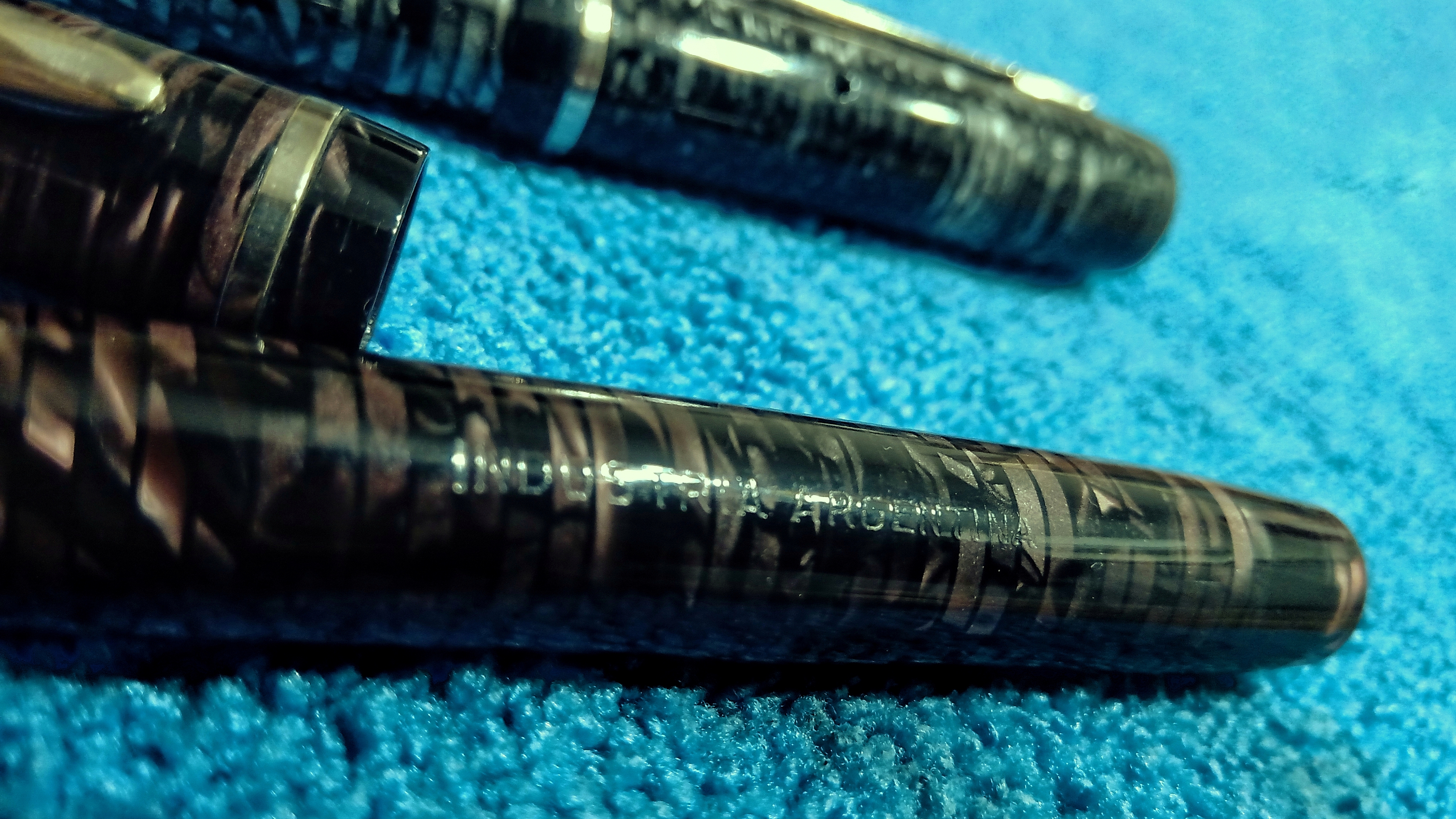 Qui abbiamo il caso di una penna capilografica, una degli ultimi Tintenkuli, di provenienza tedesca e degli anni 50/60, secondo alcuni fabbricata totalmente o parzialmente in Argentina, secondo altri solo assemblata, con punta trasparente, punta in lega di tungsteno, pistone di carica, cappuccio in celluloide nera con anello dorato e clip placcata oro, corpo trasparente colorato nero con finestra del livello dell'inchiostro non colorato, anello di caricamento in celluloide rossa, manopola di caricamento e cappuccio cieco in celluloide nera, un gioiello di ingegneria che funziona come quando è partito la fabbrica...!!!