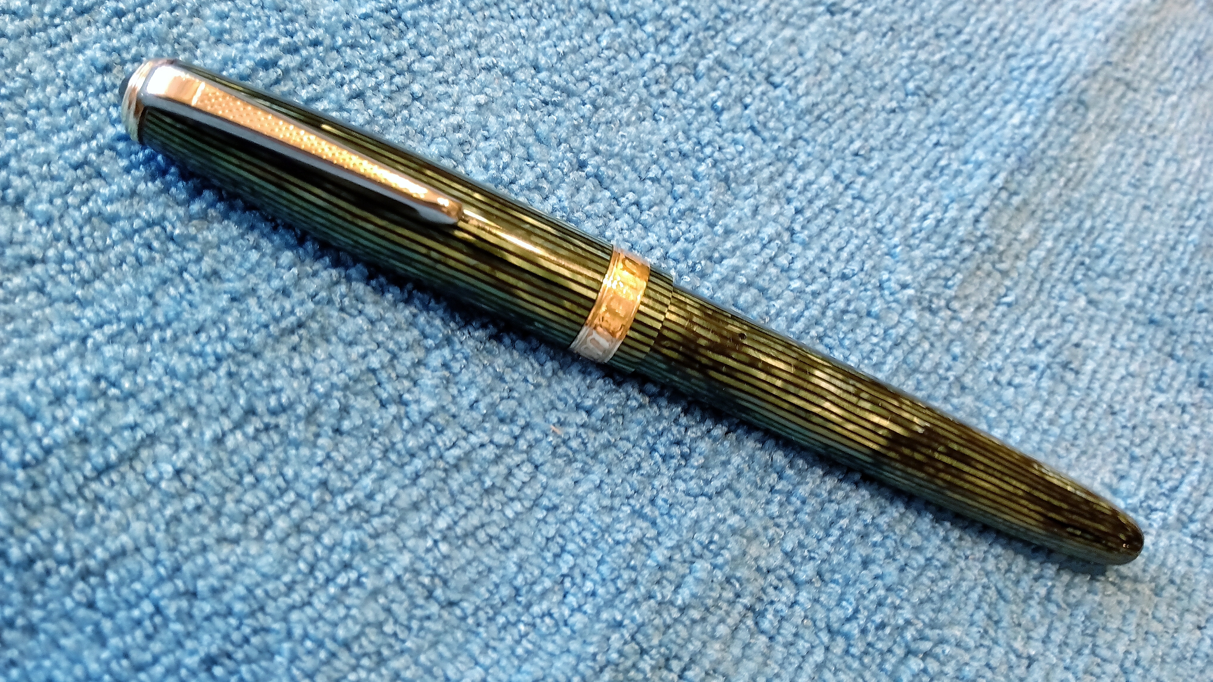 Veniamo ora a questa splendida penna stilografica, sempre della ditta Artcraft, intorno agli anni 40/50, creata per competere come seconda opzione alla Parker 51, la Escritor 54, con sistema di caricamento aerometrico, gioiello nero, impugnatura in ebanite, corpo e cappuccio in celluloide laminata con scanalature longitudinali in argento perlato e verde, clip placcata oro, fascia incisa in oro sul cappuccio, e penna cilindrica semicoperta originale in acciaio marca Escritor, che continua a scrivere meravigliosamente...!!!