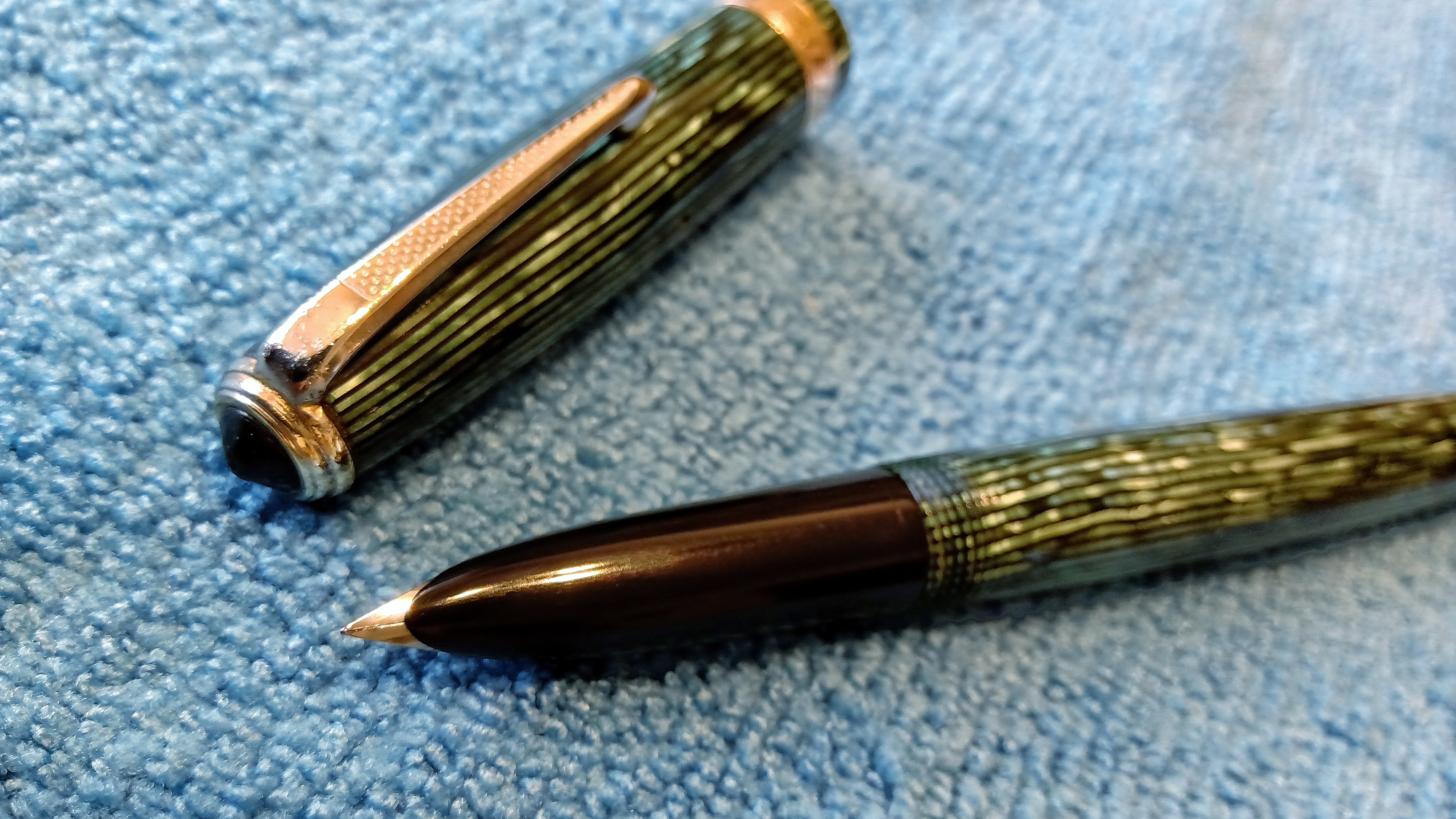 Quest'altra marca Junior's degli anni 50 con impugnatura in ebanite nera e corpo in galatite verde, sistema di caricamento aerometrico, clip e cappuccio cromati e pennino a vista non originale marca Hunt Co. dorato prodotto negli U.S.A., una bella piccola penna stilografica...