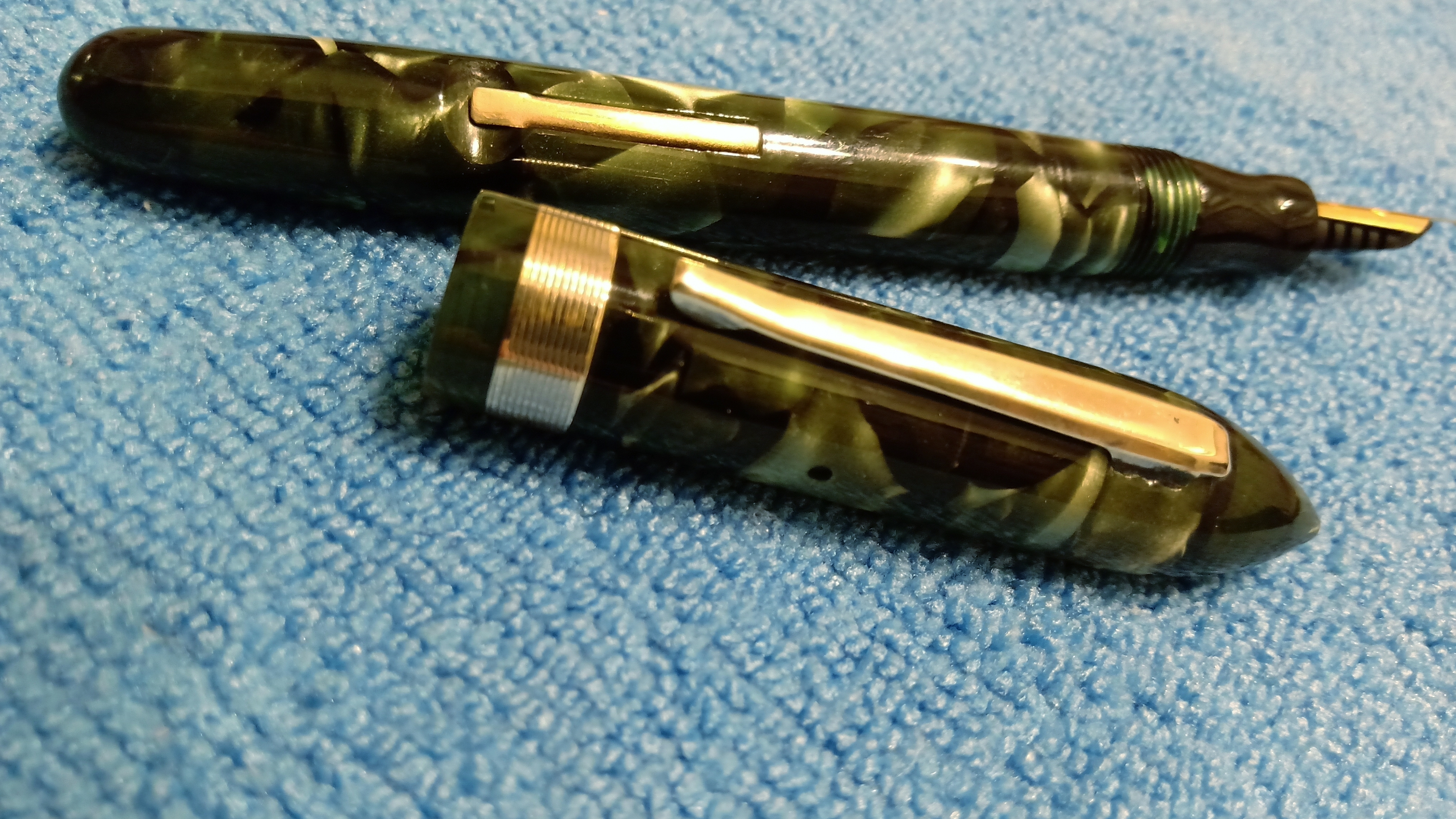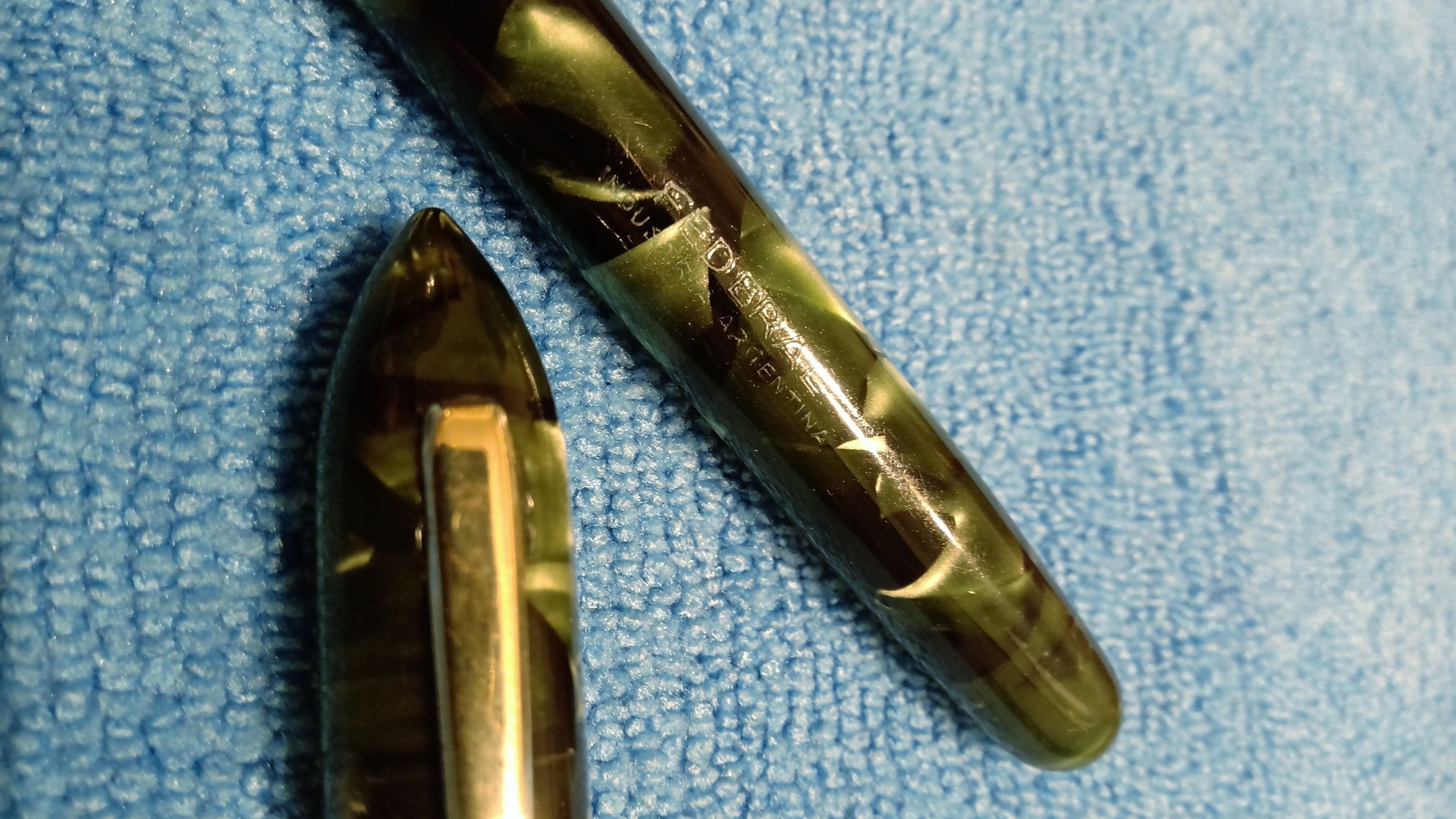 Altro marchio made in Argentina, Federal..., anni 40, con sistema di caricamento a leva, pennino aperto Signature non originale placcato oro, impugnatura in ebanite, corpo e cappuccio in celluloide laminata argento perlescente marmorizzato e un bellissimo verde bosco, levetta, clip e ampia fascia sul cappuccio con incisione dell'orologiaio placcata in oro...