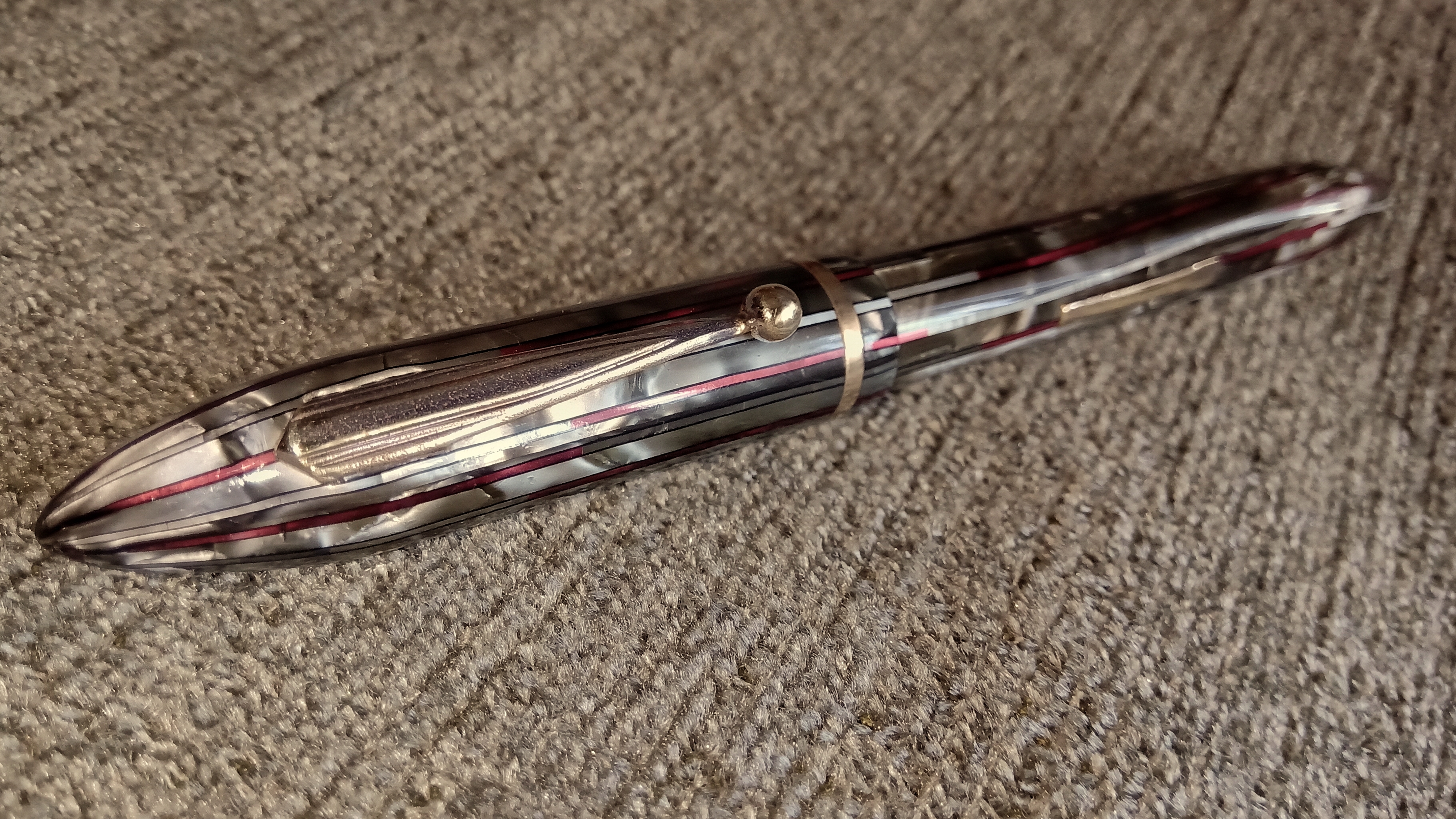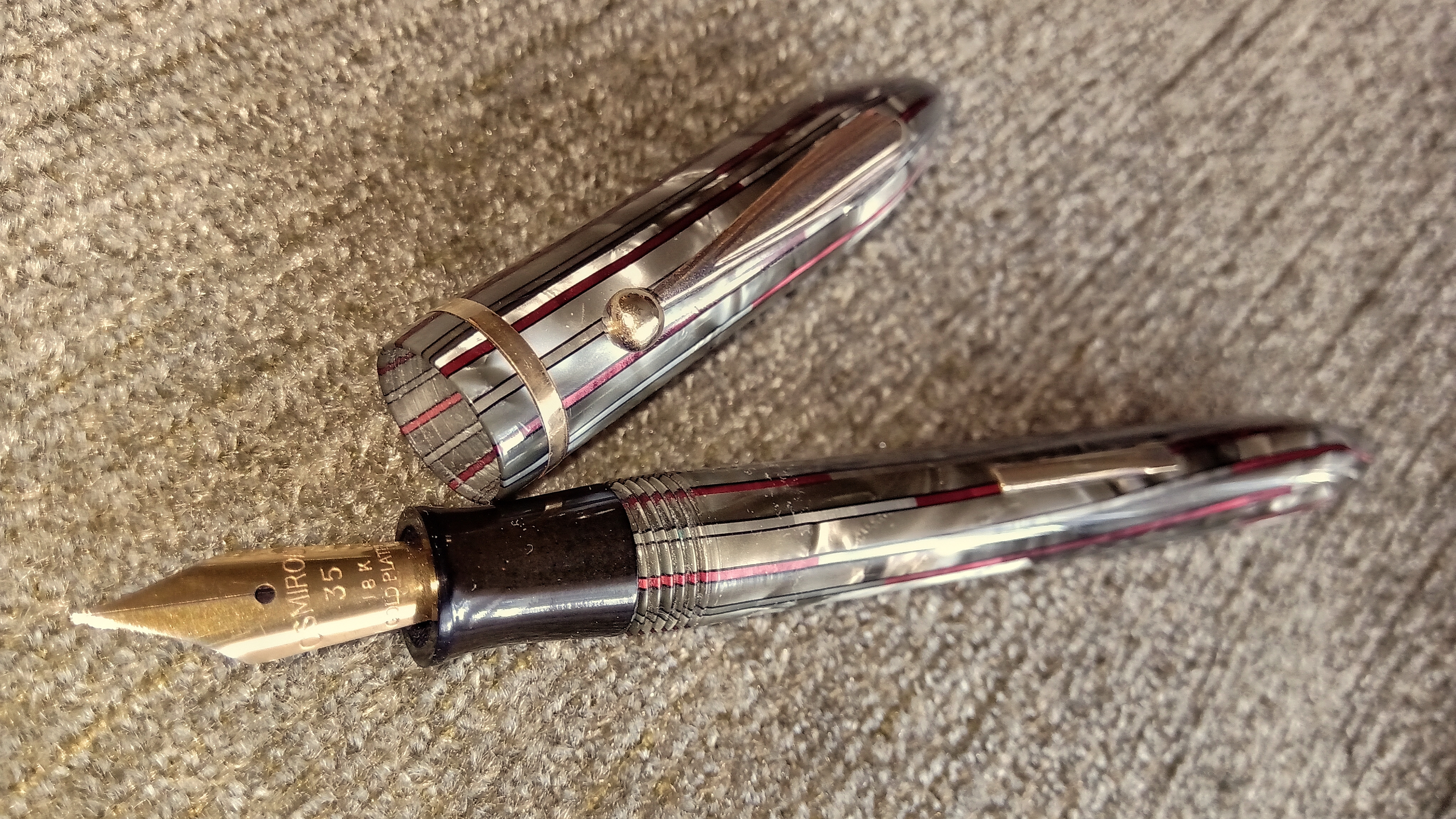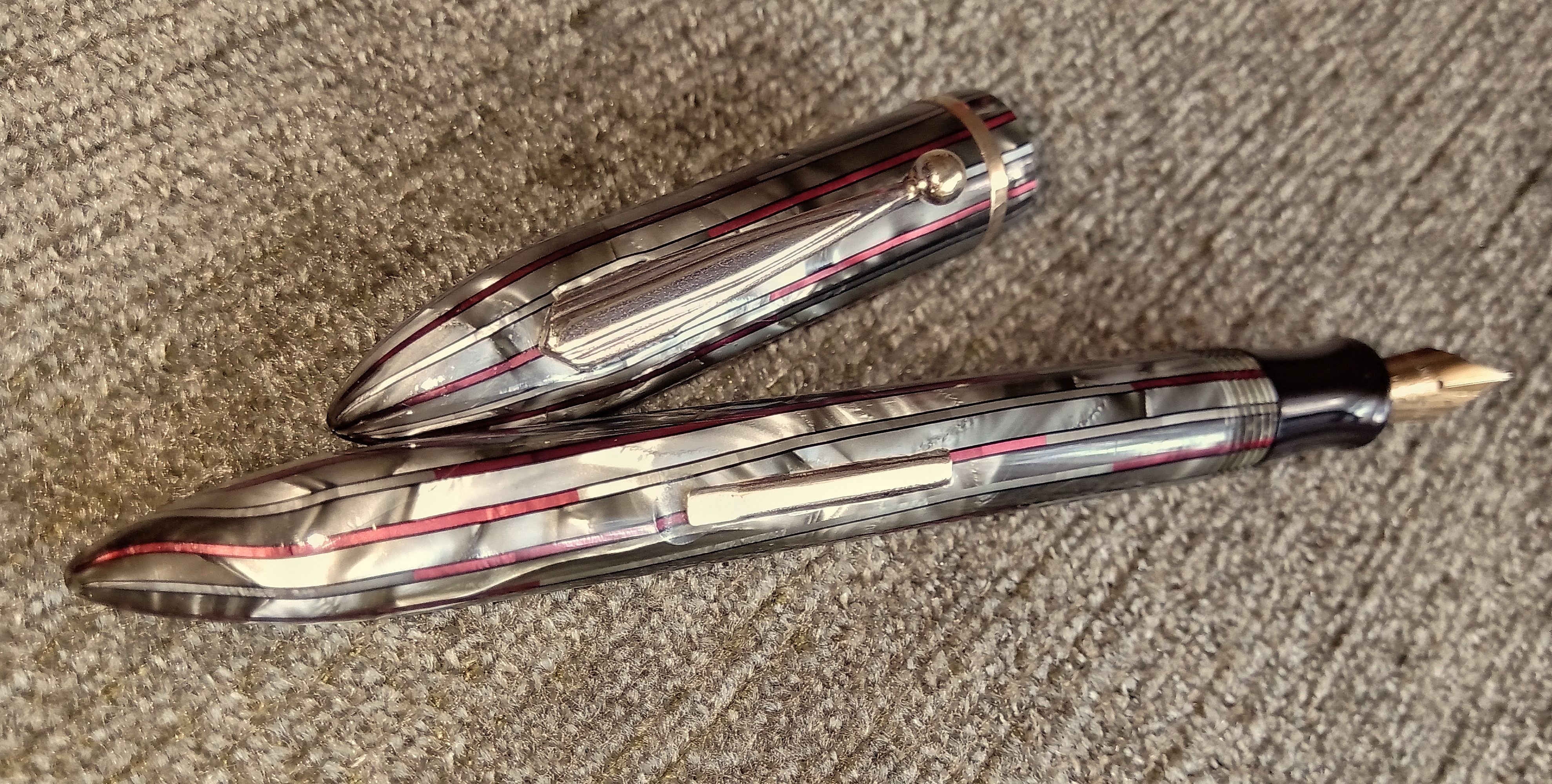 Bellissima imitazione del design della Sheaffer's Balance, degli anni 30/40 circa, dove anche in questo caso appare solo l'impronta dell'origine, con sistema di caricamento a leva, pennino aperto non originale Osmiroid placcato oro 18k, impugnatura in ebanite, corpo e capuccio in celluloide laminato marmorizzato in argento perlato e scanalature longitudinali in argento e bordeaux, clip levetta e fascia del cappuccio che all'epoca erano cromati ma non ressero al tempo...