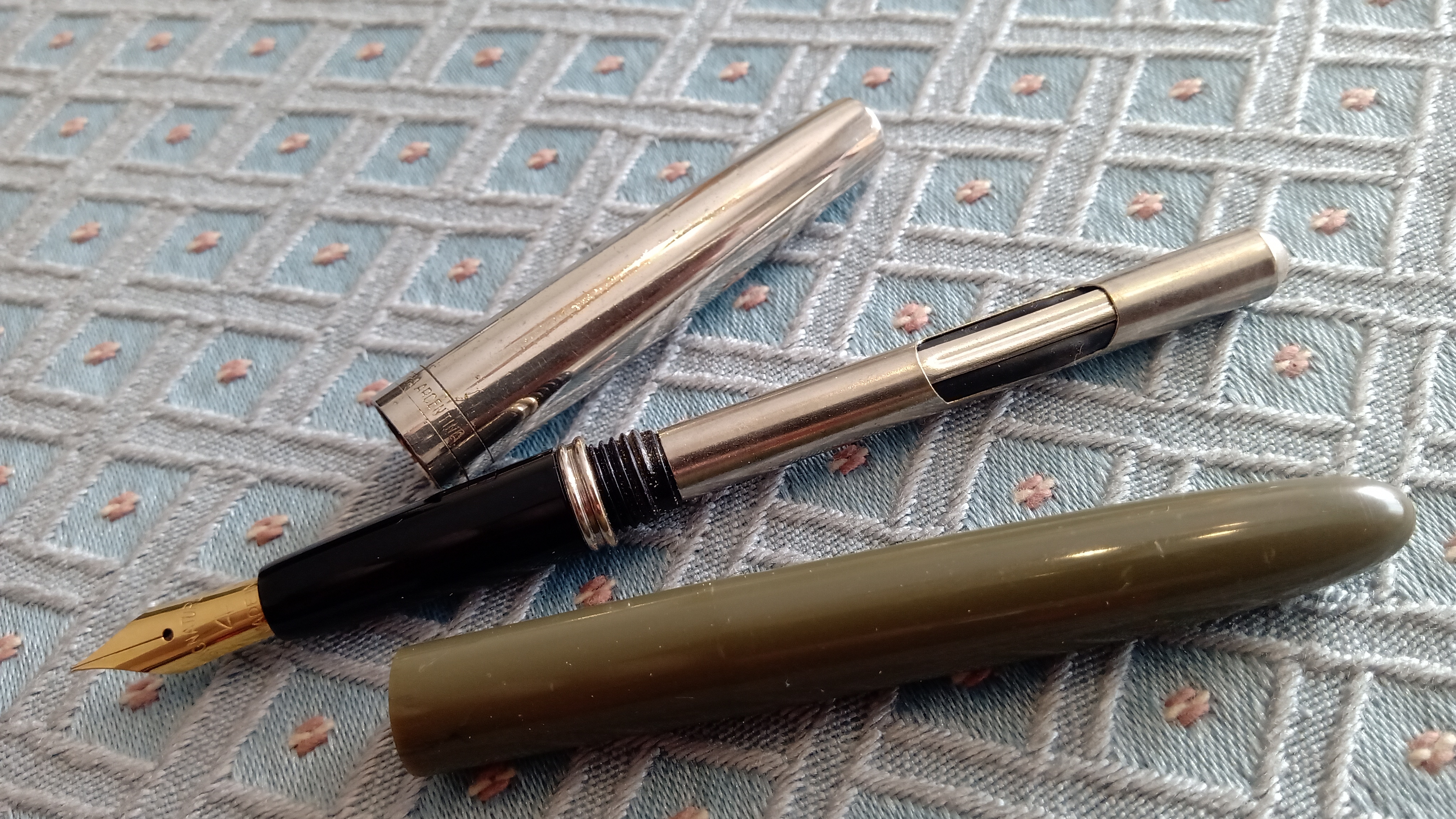 Penna stilografica marca Perfecta, sempre anni 50/60, con impugnatura in ebanite nera e corpo in galatite grigio oliva, sistema di caricamento aerometrico, clip e cappuccio cromati, e pennino a vista con marchio Signature in dorato, non originale, prodotto negli U.S.A...