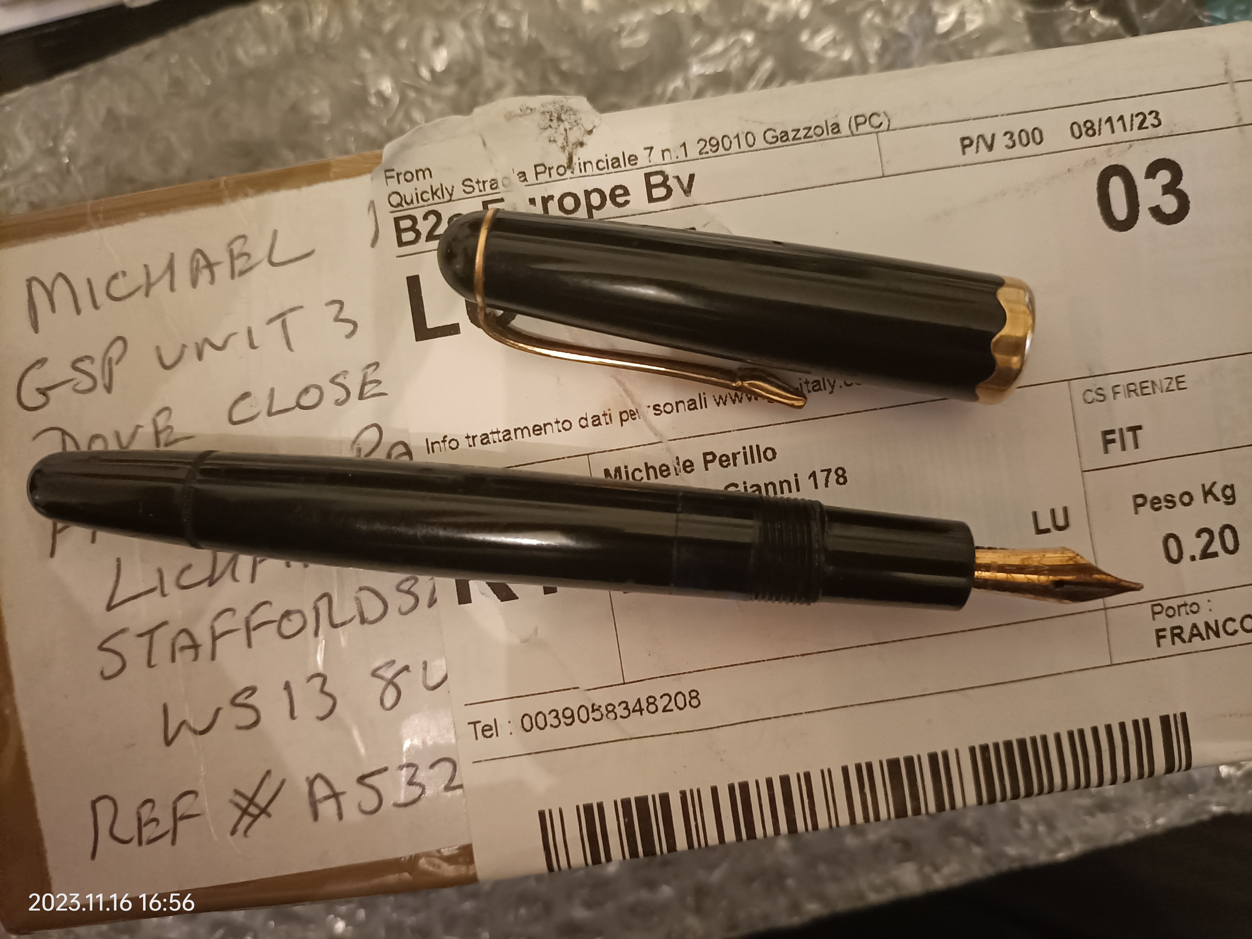 Una Monterosa 042G con pennino d'oro! Sorpreso, contatto il venditore e lui mi restituisce i soldi e poi (traduco) "dato che non ha modo di inviarmi soldi per rispedire indietro la penna" me la posso tenere o buttarla via!