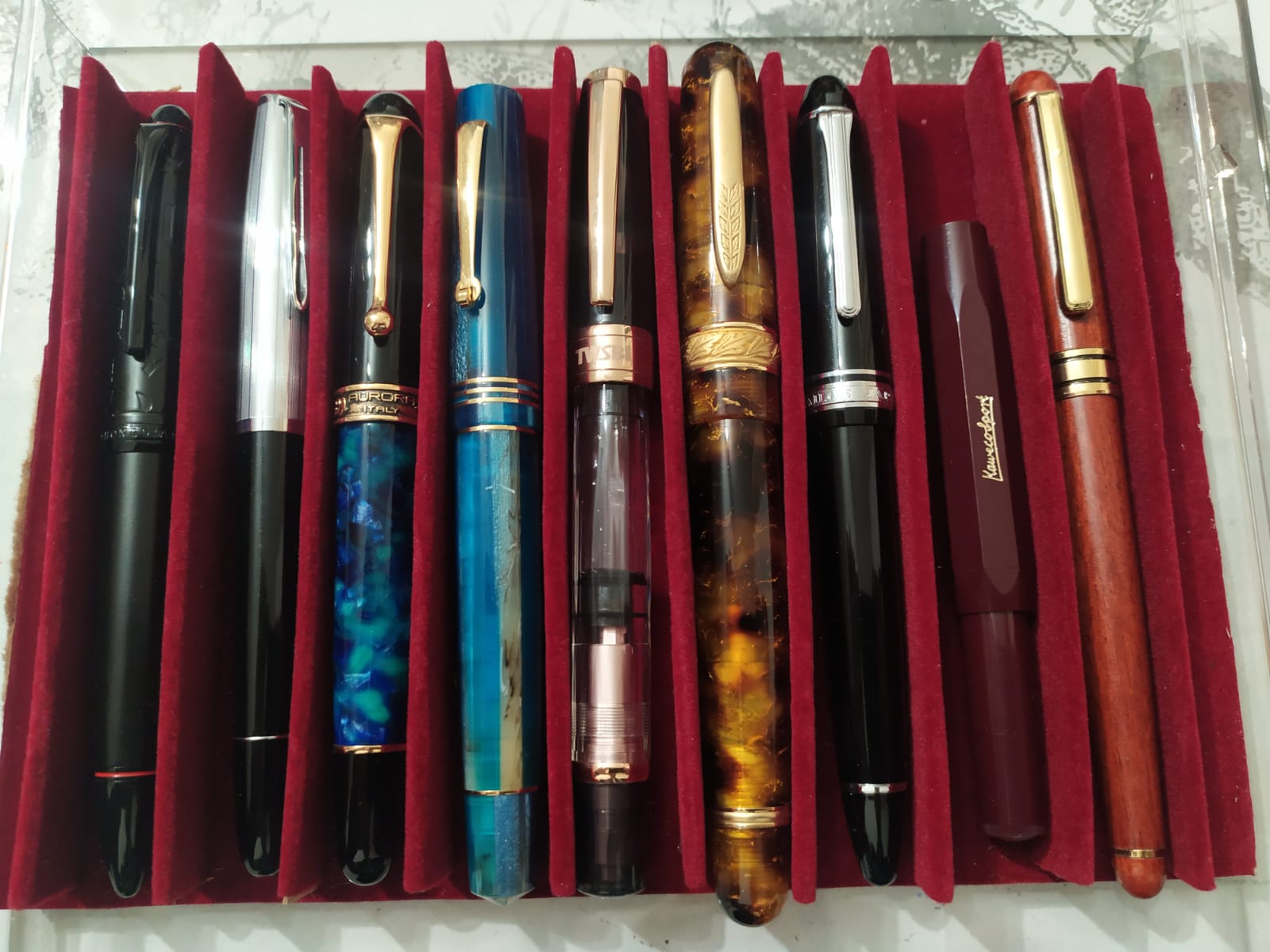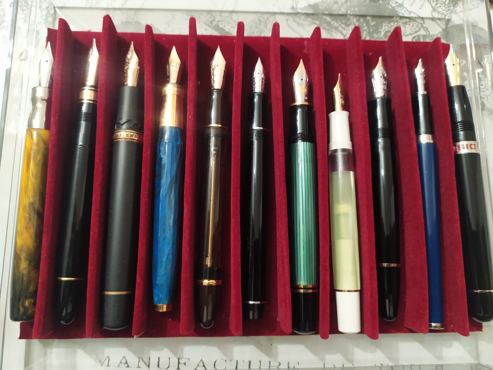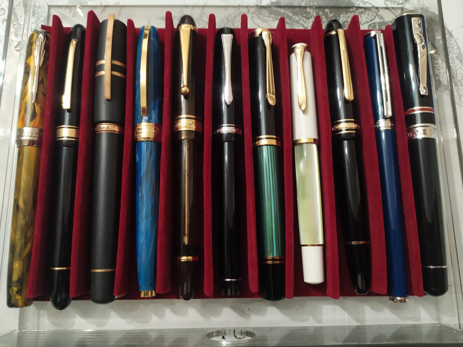 Tra quelle "mancanti" vedrei una Capless (tecnicamente tra le più "diverse"), una con laccatura Urushi, magari in ebanite (Pilot 845 o Custom Urushi, ma anche Platinum Izumo, Nakaya, Wancher, Sailor KOP) e un pennino veramente flessibile (Pilot 912FA o vintage tipo Waterman 52). Mancherebbe anche un pennino Architect o Naginata (che danno variazione di tratto opposta a quella dello stub/italico: grosso in orizzontale e fine in verticale)
