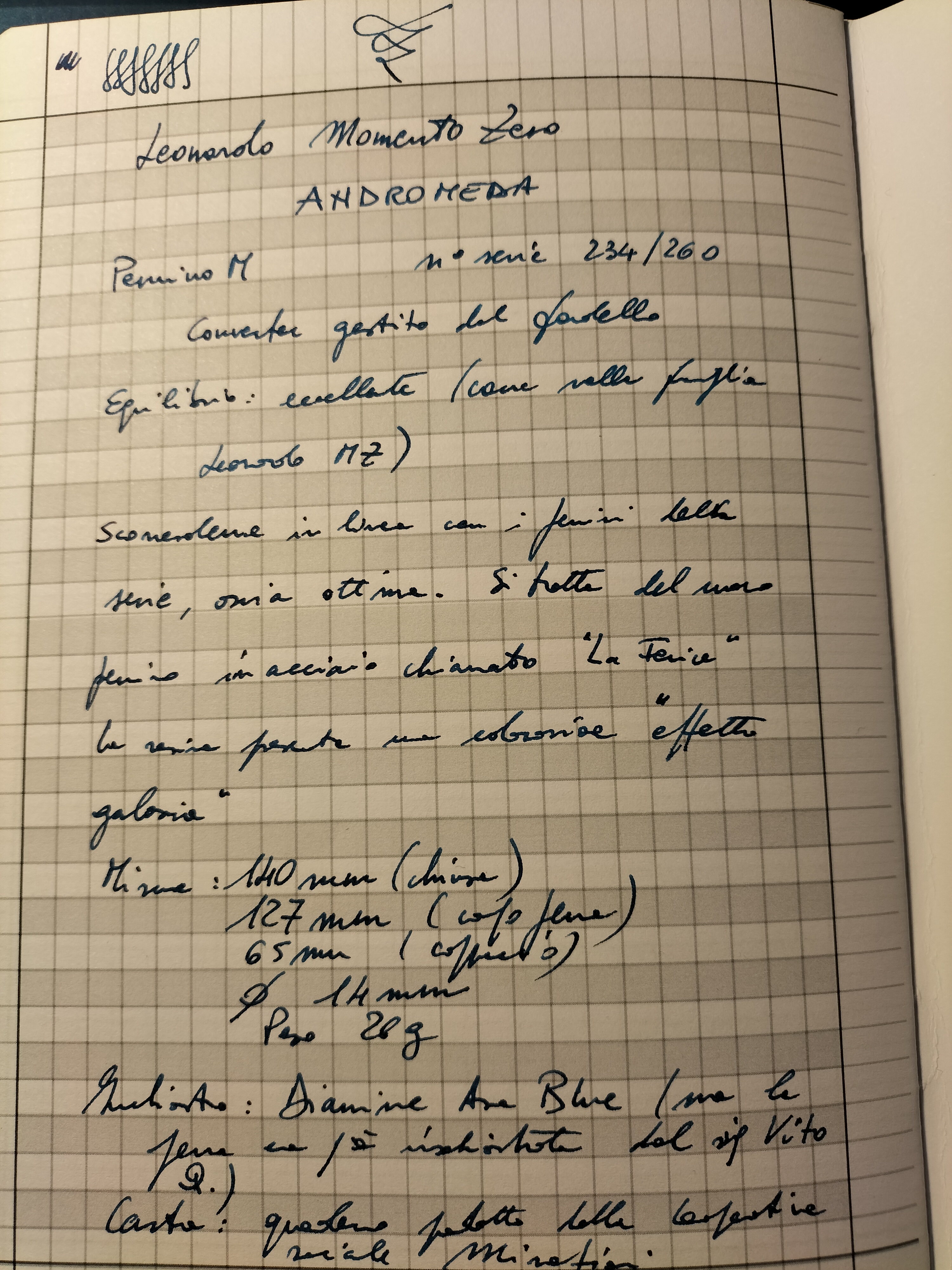 Un noto negozio di penne (si può nominare) ha creato una versione in edizione limitata di 260 esemplari in occasione del Black Friday della Leonardo Momento Zero, chiamandola Andromeda. Infatti la resina è stata trattata con un "effetto nebolosa" che in parte le immagini dovrebbero restituire. Nel testo scritto a mano per provarla c'è scritto: