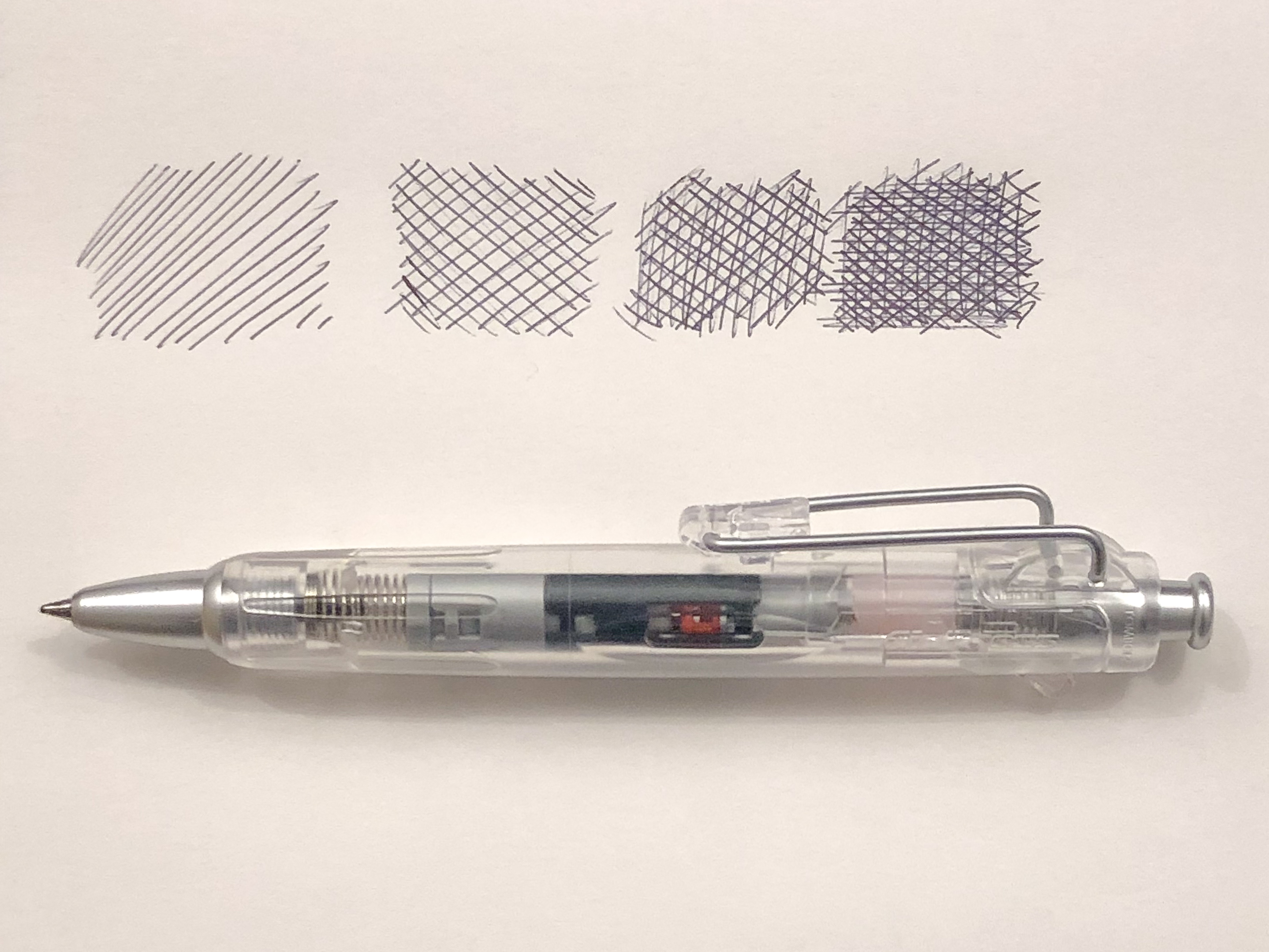 Tra le mie preferite spunta la Tombow Airpress. Una penna a sfera pressurizzata, dunque funziona sottosopra per lunghissimo tempo, e in qualsiasi posizione nello spazio, anche sott’acqua. Solitamente disegno sul piano inclinato(30-70gradi),con un angolo di penna opposto. Trovo abbia una marcia in più, non smette mai di lasciare inchiostro in modo costante. Posso tranquillamente disegnare con il cavalletto come se fosse un pennello. Esteticamente mi fa pensare ai cantieri