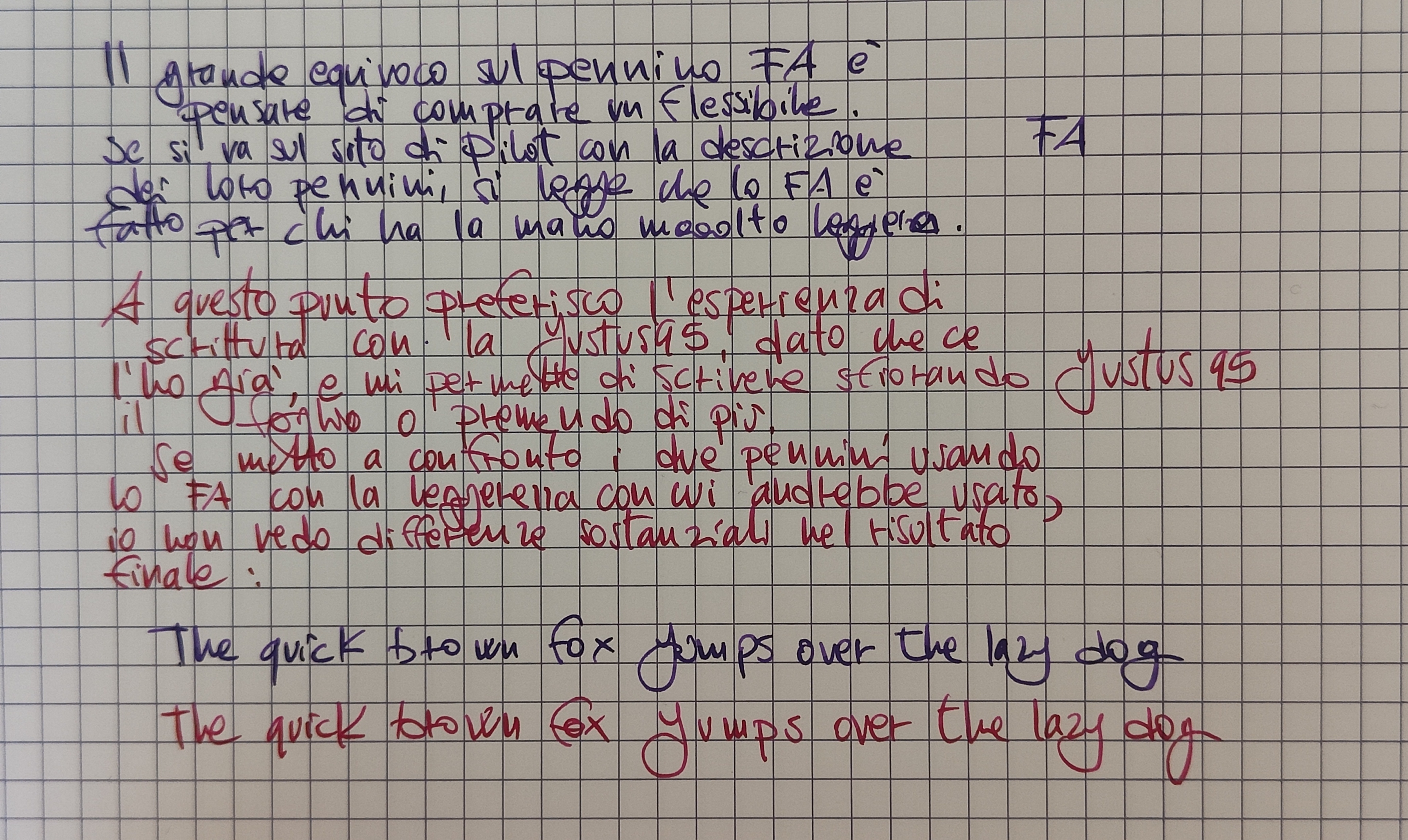 Va usato con un tocco molto leggero, e questo spiegherebbe il perché Pilot avrebbe messo in commercio un pennino che ha bisogno di un alimentatore custom, comprato a parte da terzi. La verità è che il pennino FA è usato in modo improprio. Un noto negoziante mi disse che i giapponesi dell'azienda con cui ha contatti sostengono che noi occidentali sbagliamo completamente nell' uso del pennino FA. Evidentemente continuano a venderlo perché i margini che fanno sono maggiori dei costi di riparazione, o perché insomma hanno in qualche modo un ritorno. L' ho presa larga per risponderti perché non è che lo FA non mi piaccia, ma se lo devo usare sfiorando il foglio, io personalmente non ottengo nulla di diverso da quello che mi viene fuori con la Justus95: