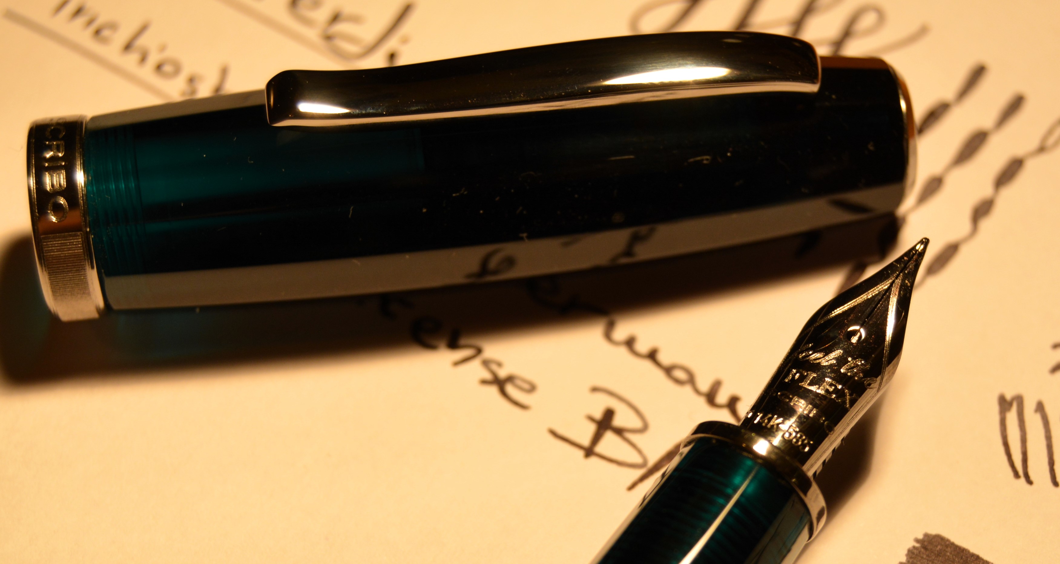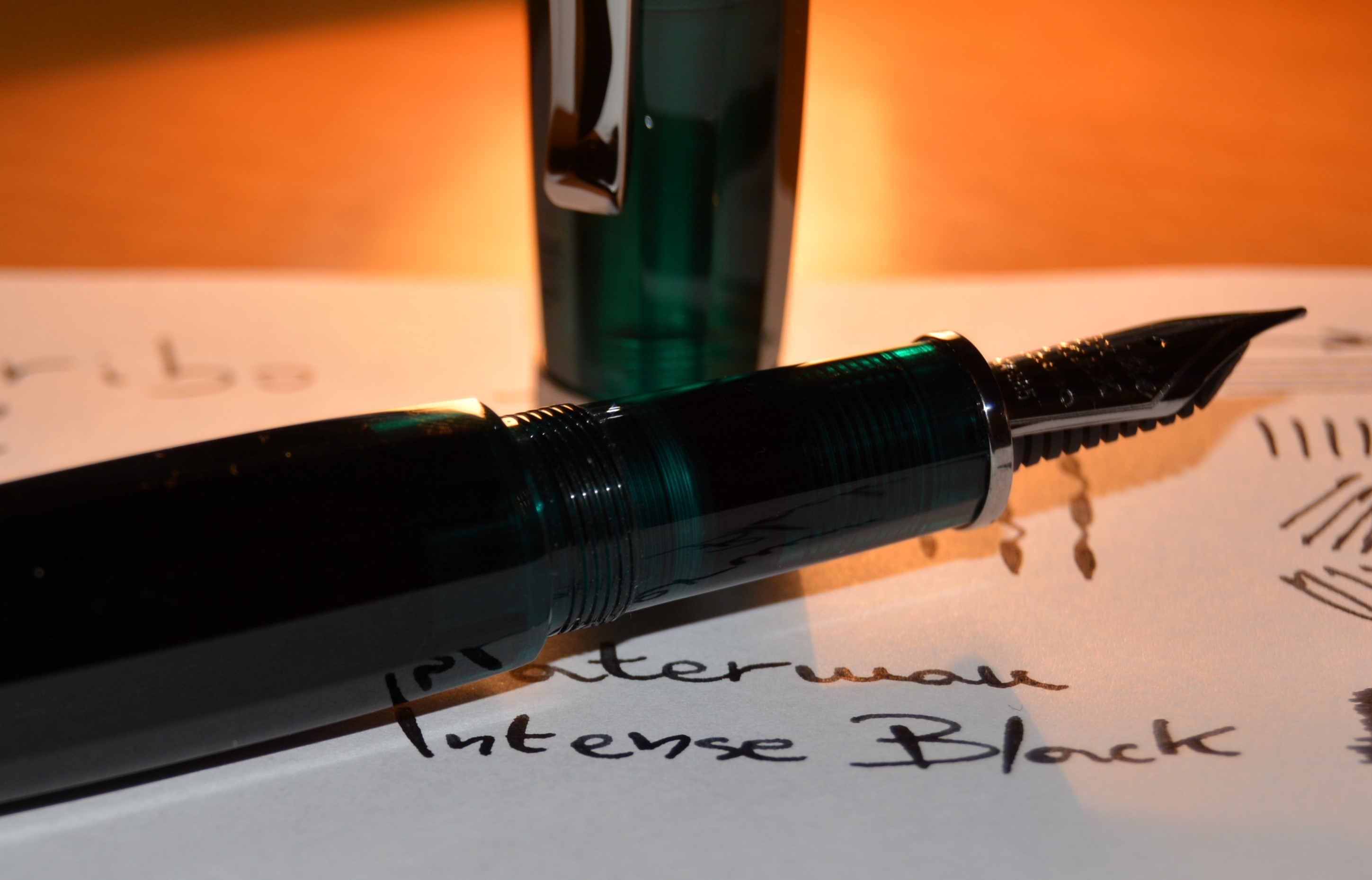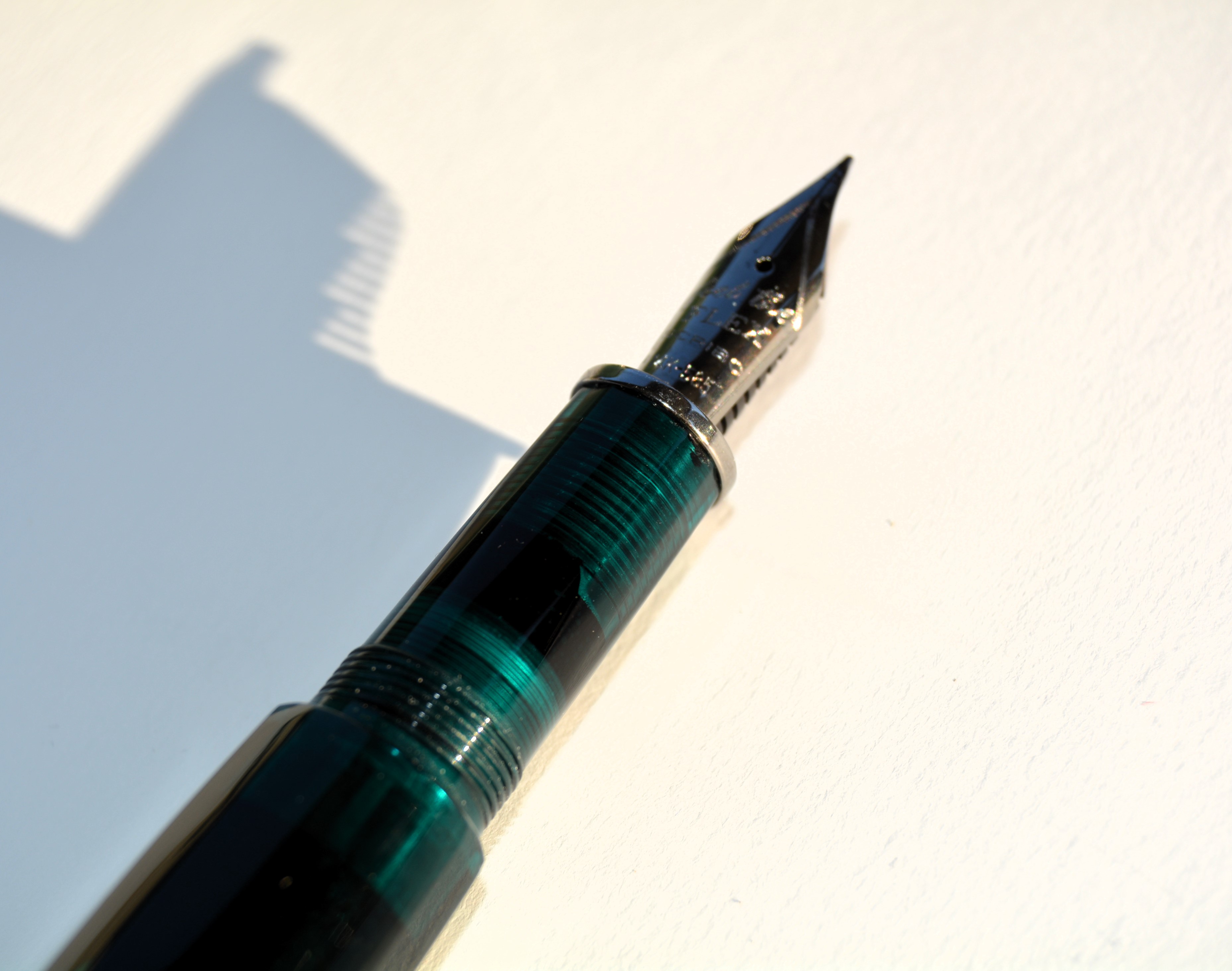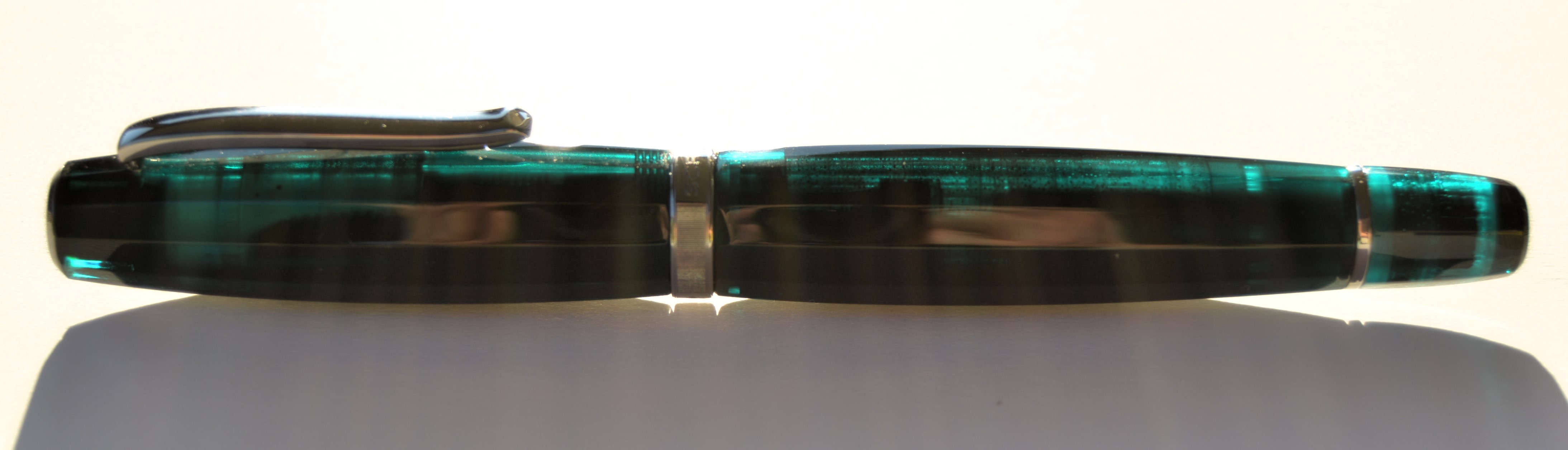 Di sostanza: pur essendo "di plastica" (resina trasparente, di un bellissimo colore verde scuro...quasi smeraldo direi), garantisce un certo feeling alla mano, merito, credo, del sistema di caricamento a pistone (che pare sia proprietario di SCRIBO) realizzato in metallo. Fatti salvi pennino e anellino decorativo alla sezione, non vi sono altri elementi metallici sul corpo della penna, se non, appunto, quelli relativi alla zona stantuffo/codolo di azionamento.