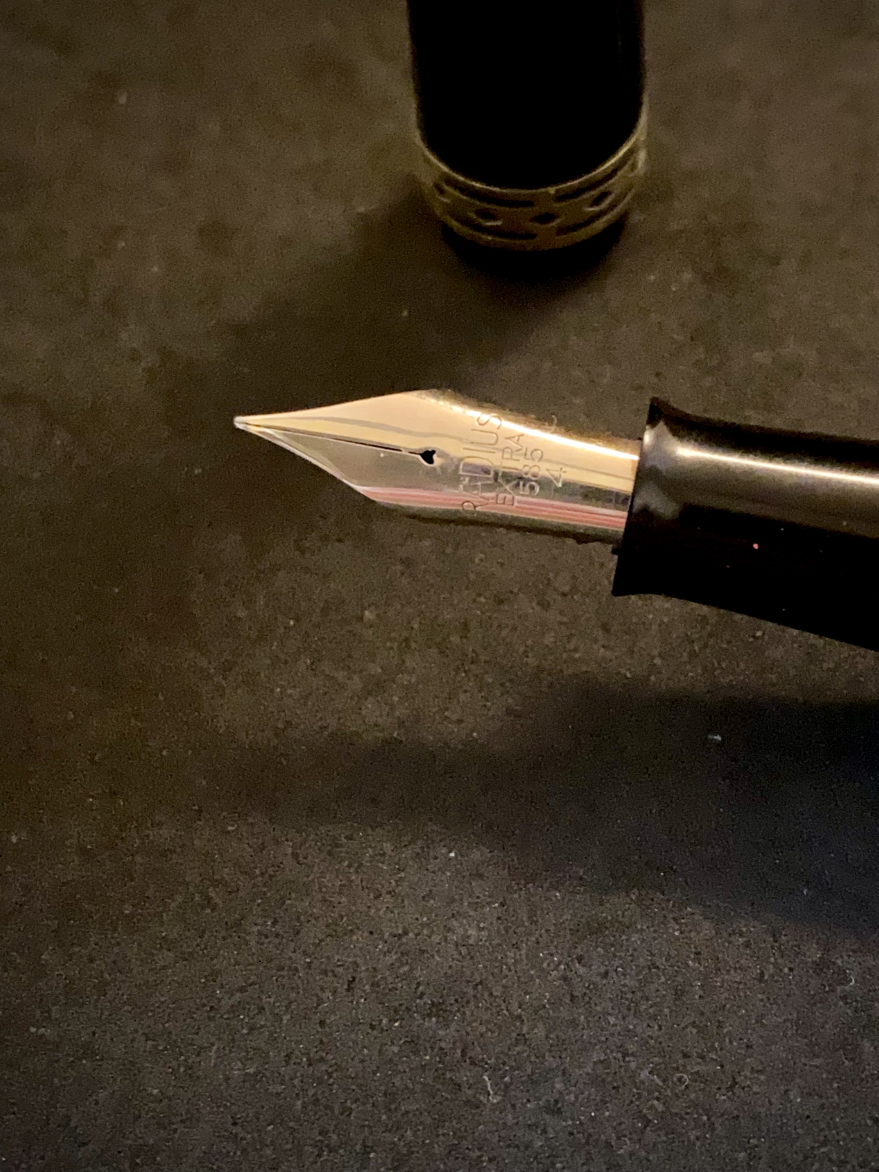 Ad occhio direi tra un EF ed un F, ha un feedback presente, ma direi che c’è da aspettarselo da un pennino di questa gradazione che ha evidentemente lavorato tanto. Caricato con il Montblanc Permanent Grey, scorre senza incertezze, con un tratto continuo ed un flusso sempre ben misurato. E’ un pennino a cui piace la mano leggera, flette solo quando chiediamo di farlo senza perdere un colpo e segue perfettamente la mano, ma è una penna d’altri tempi e se non guidata a dovere diviene poco piacevole. Se crediamo di scrivere con una biro e calchiamo la mano, la sentiamo grattare la carta ed in alcune direzioni tende quasi ad impuntarsi divenendo una vera tortura. Per cui bisogna sedersi, respirare e lasciarla scivolare sul foglio, fino a prendere confidenza con un pennino d’antan che saprà ripagarci con deliziose ore di scrittura.