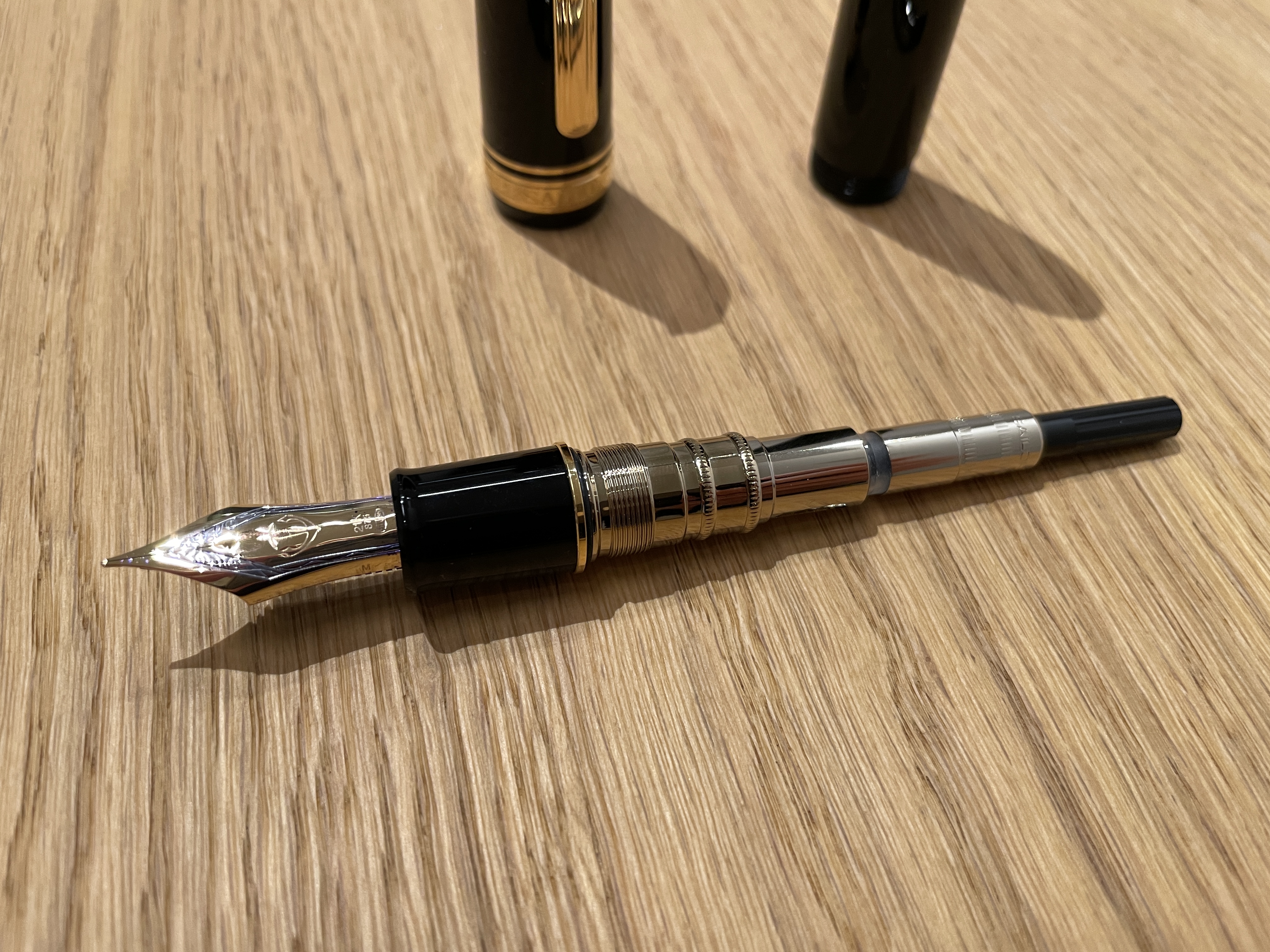 Il flusso è molto più generoso rispetto ai pennini più piccoli. L’alimentatore è in ABS e si comporta molto bene con qualsiasi inchiostro, non facendo rimpiangere l’ebanite.