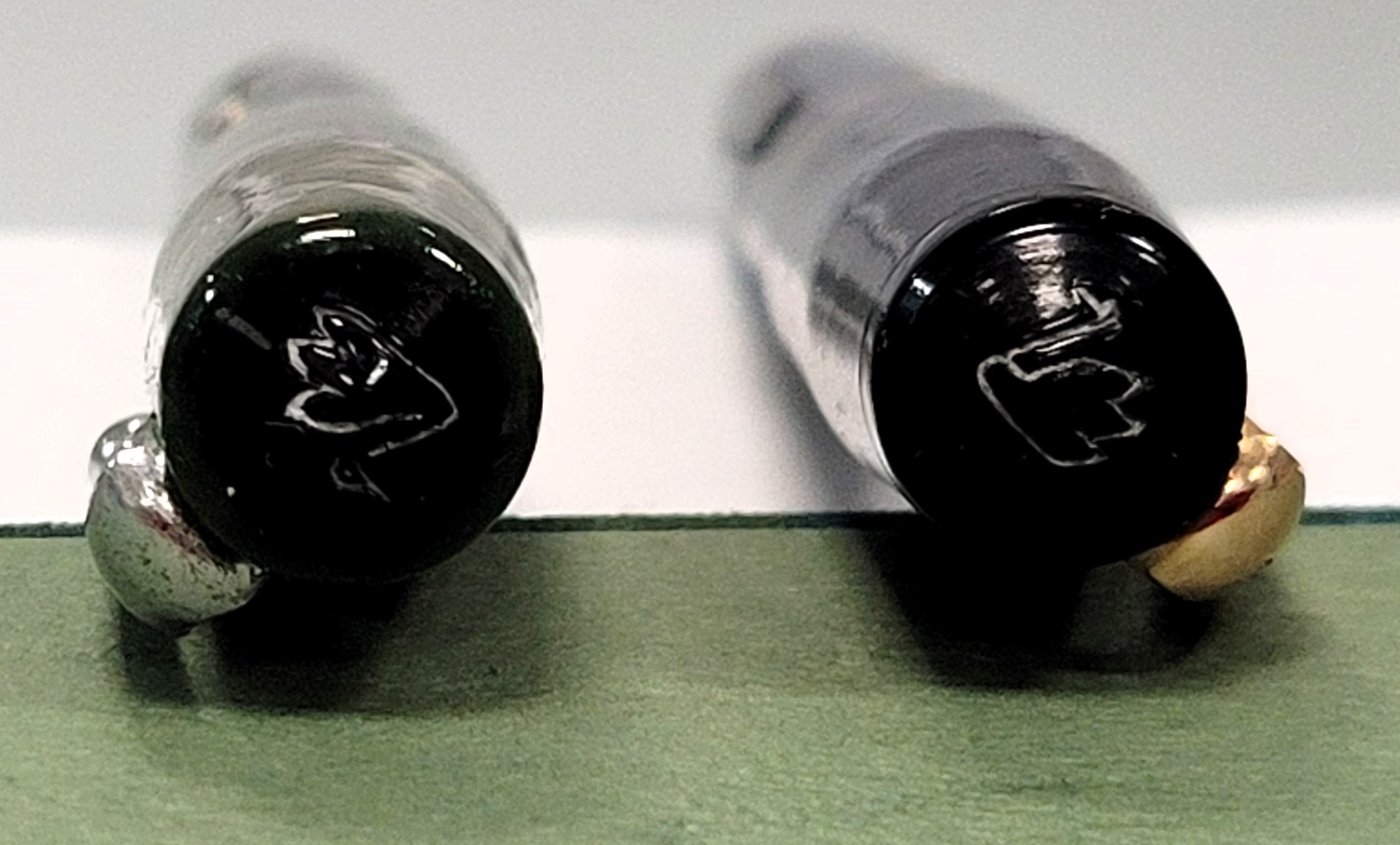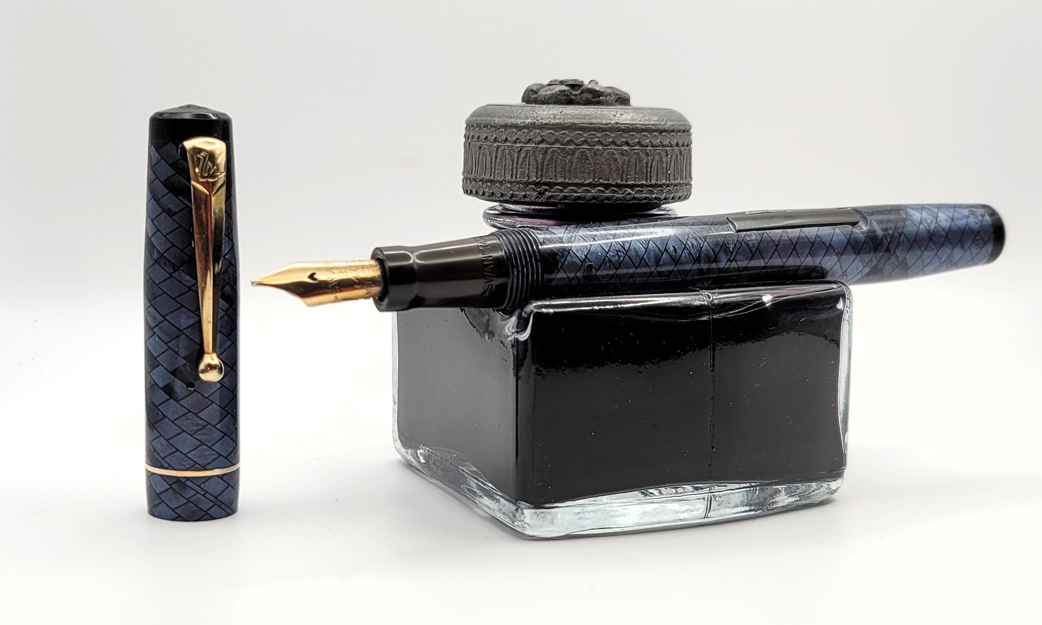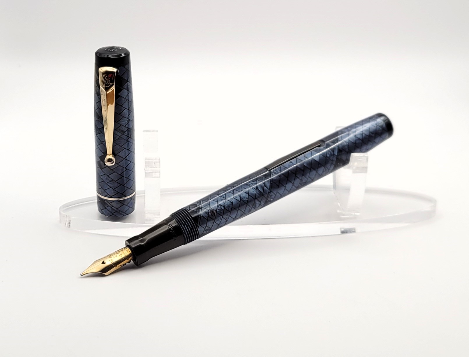 La mia, Blu, riporta appunto il numero 83 La successiva produzione, nei primi anni ’40, subì qualche modifica estetica la levetta di carica in ebanite fu sostituita con una in metallo ed i tappi neri furono inseriti nel fusto e nel cappuccio quindi non visibili dai lati. Ne esistono con finiture dorate e verette e, come quella in mio possesso, con clip e leva di carica cromate ma senza verette, quindi molto liscia e lineare. In questo caso anche la clip è assolutamente lineare e non presenta alcun motivo o spigolo. Segue...