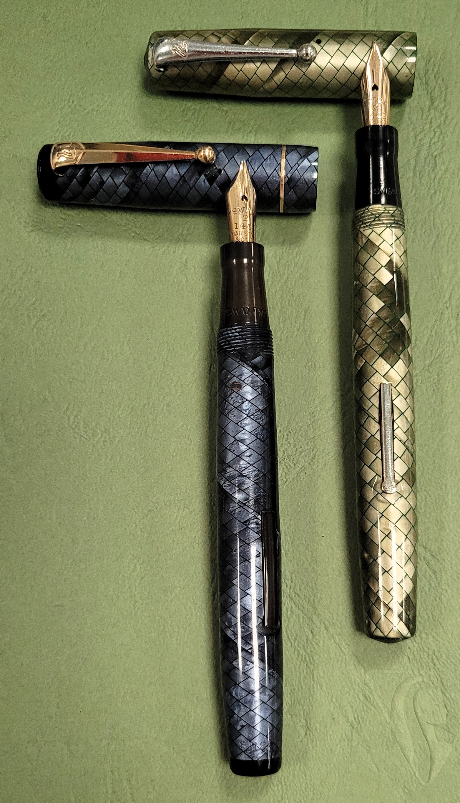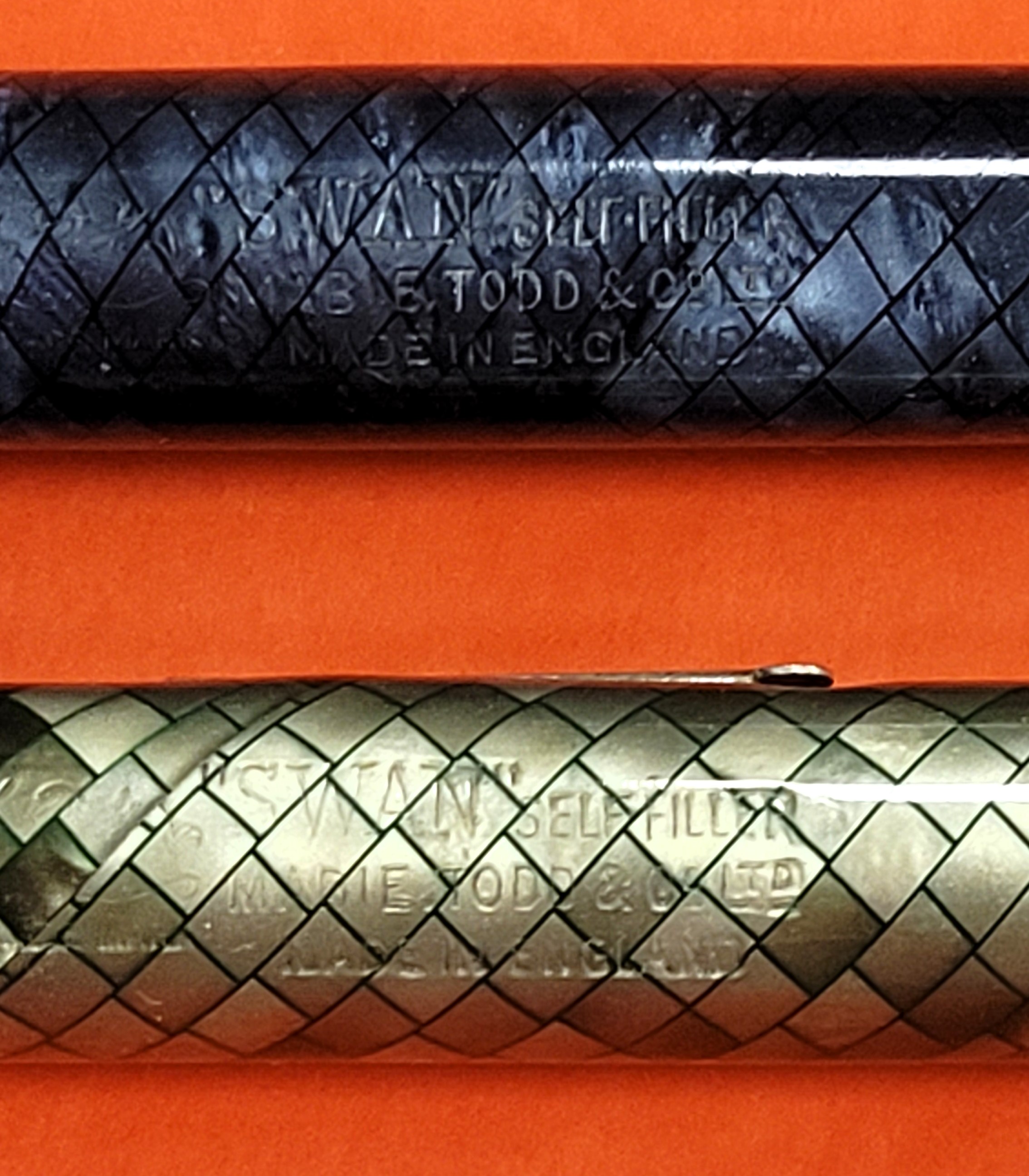 Le prime versioni avevano la leva di carica in "hard rubber" (quindi nera) erano realizzate da un foglio di celluloide avvolto elicoidalmente e chiuse da due tappi terminali neri, uno sul fusto ed uno sul cappuccio su cui è inciso il famoso logo della casa britannica, il cigno. Le clip erano le classiche lisce con terminale a sfera senza scritte ma con inciso, anche qui, il cigno. Le varie colorazioni erano identificate da dei codici numerici che vi riporto: