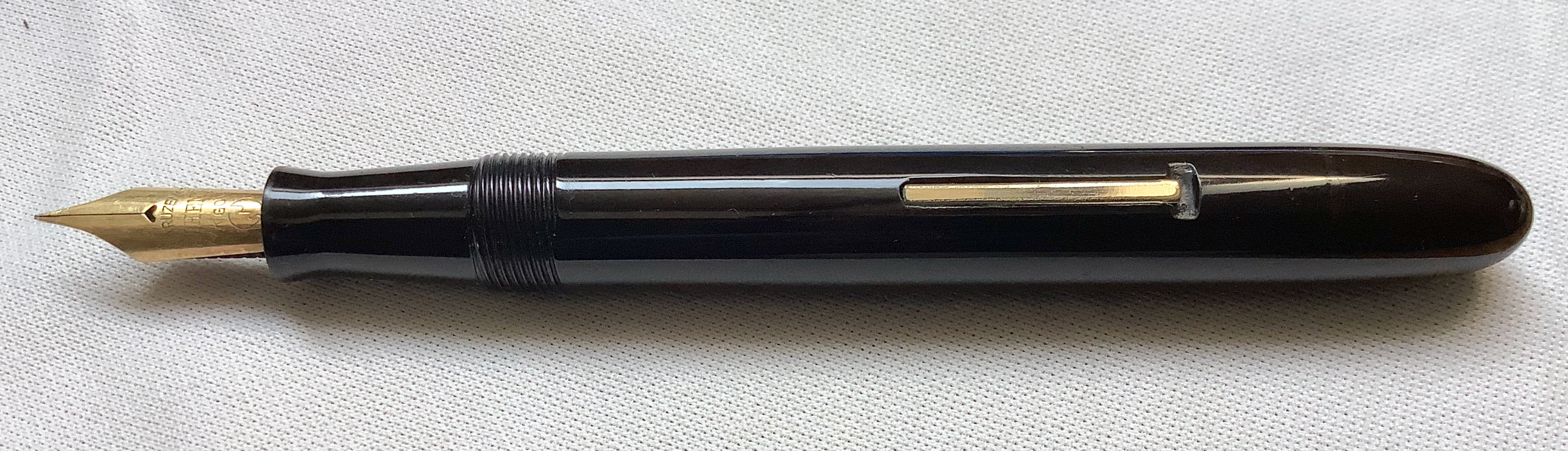 La stilografica presentata è degli anni cinquanta , evidenziato sia dal tipo di fermaglio che dal piccolo gioiello a bottone che lo tiene fisso al cappuccio, ed anche dal marchio JIS introdotto nel 1953. Sul retro del pennino è inciso il numero 401 che dovrebbe indicare la data di fabbricazione, generalmente mese ed anno “maa” oppure a quattro cifre “mmaa” come in uso da Pilot , Platinum e molte altre case. Tuttavia la cifra 401 sembrerebbe avere poco senso , indicando un ipotetico Aprile 2001 o peggio ancora Aprile 1901. Torna utile in questo caso la vecchia codifica adottata da Sailor per un certo periodo di tempo, dove le tre cifre rappresentano anno e mese nel poco usuale (e talvolta poco utile) sistema “amm” , quindi il “4” sarebbe l’ultima cifra dell’anno e “01” indicherebbe il mese di Gennaio , portando la datazione ad un più realistico Gennaio 1954