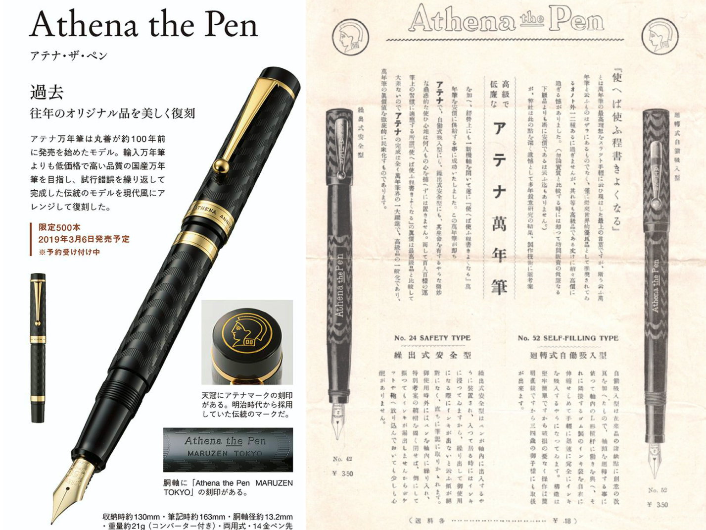Nel 1919 Maruzen lancia sul mercato quella che sarà la linea di stilografiche più longeva della sua storia , la ATHENA THE PEN (diventata poi semplicemente ATHENA).