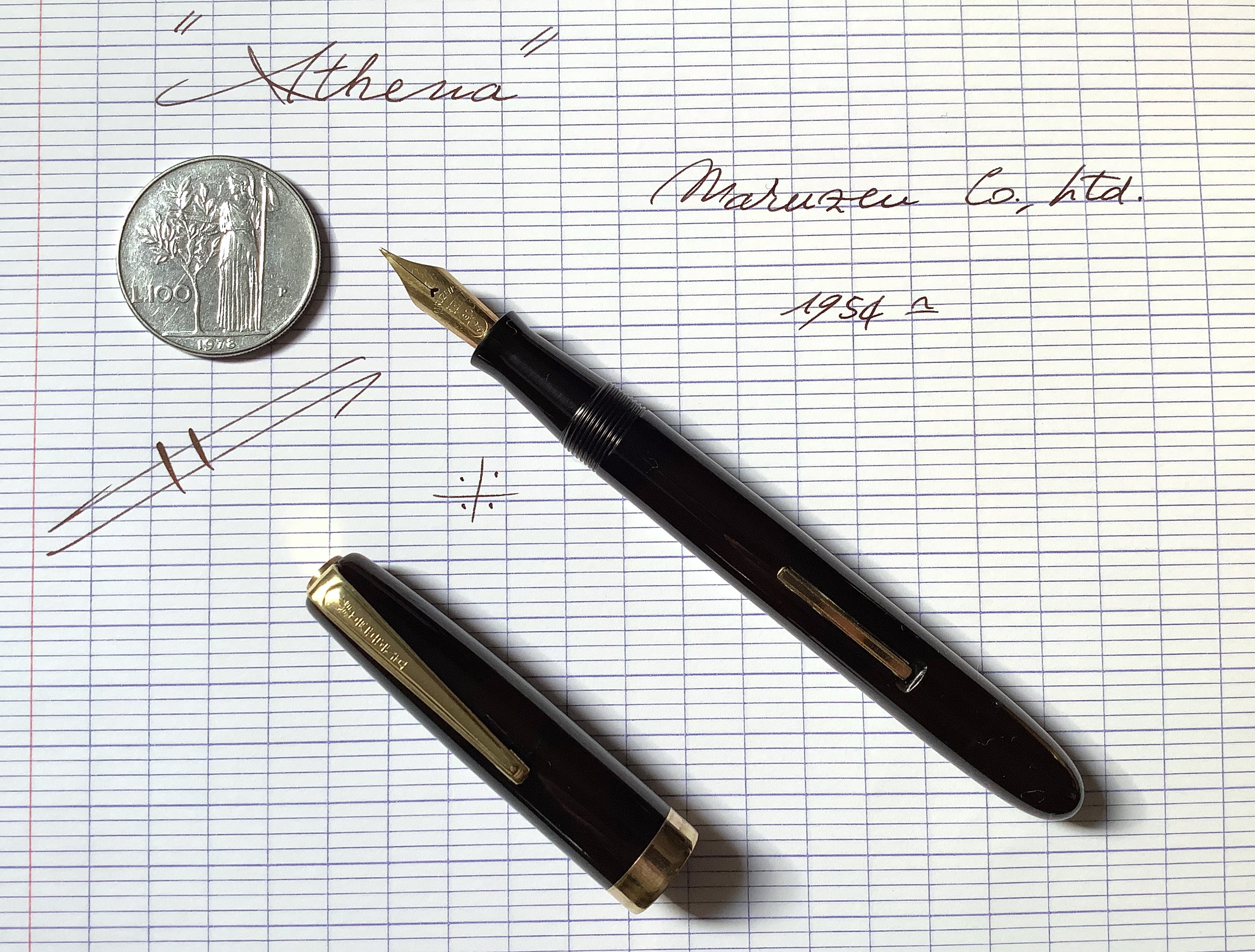Il 1937 è l’anno in cui Maruzen rileva la fabbrica nella quale fino ad allora venivano realizzate le penne a loro marchio ed inizia così la produzione in proprio . Al termine della guerra viene costruito un nuovo stabilimento vicino a Tokyo (il precedente era andato distrutto dagli eventi bellici) e le stilografiche della linea Athena, negli anni ’50, subiscono un nuovo restyling : affiancate alle classiche in ebanite e lacca urushi , vi sono quelle realizzate in celluloide colorata oppure in plastica trasparente , ed i cappucci iniziano ad essere realizzati in metallo dorato o nichelato .