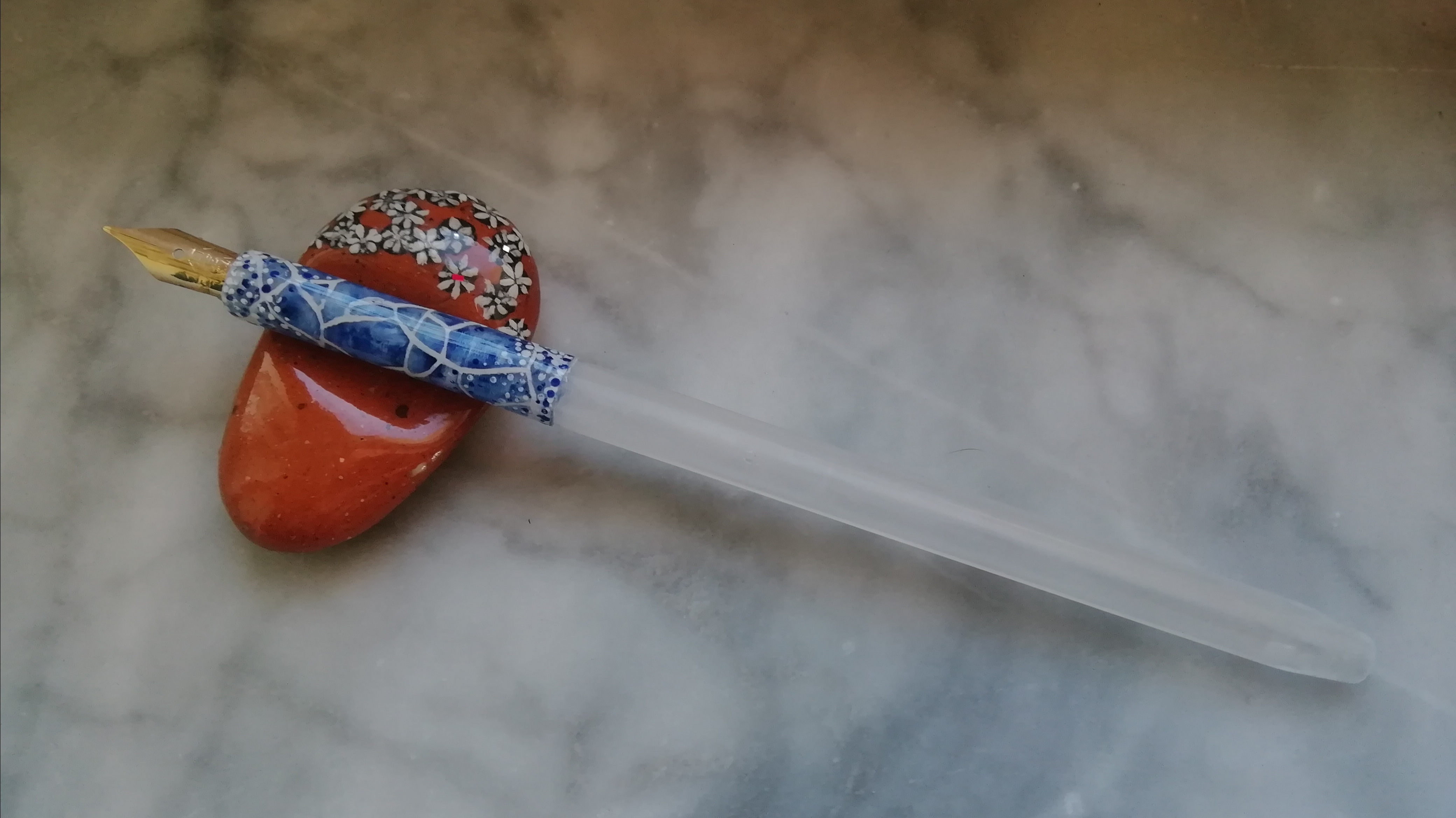 Il colore di fondo l'ho dato all'interno del fusto, sfruttando la trasparenza della penna. Due strati, uno blu e uno bianco, marezzati tra di loro. Finissaggio sempre con un velo di cianoacrilato.