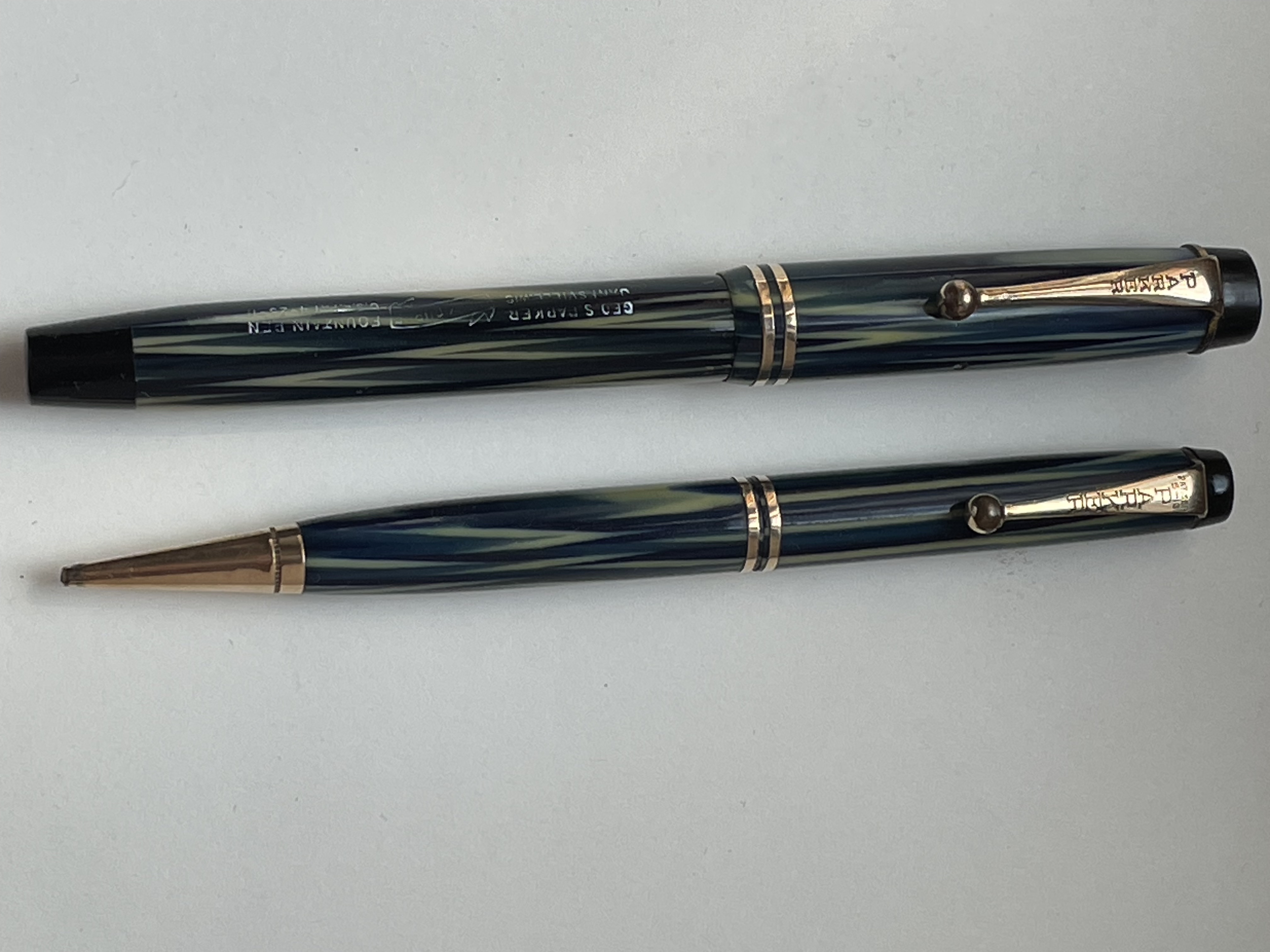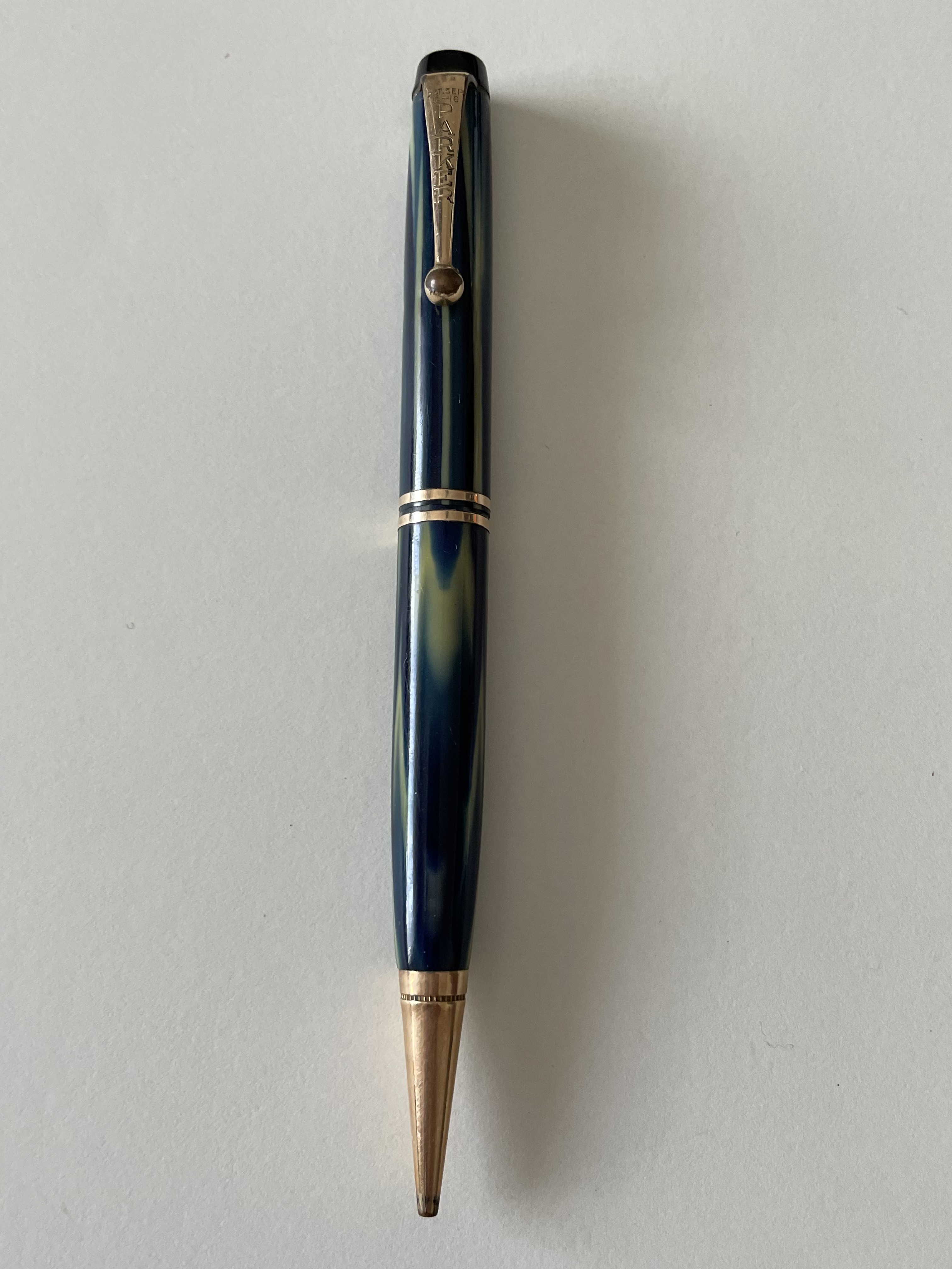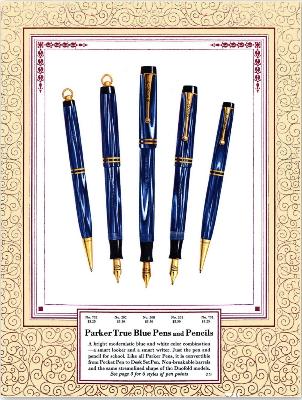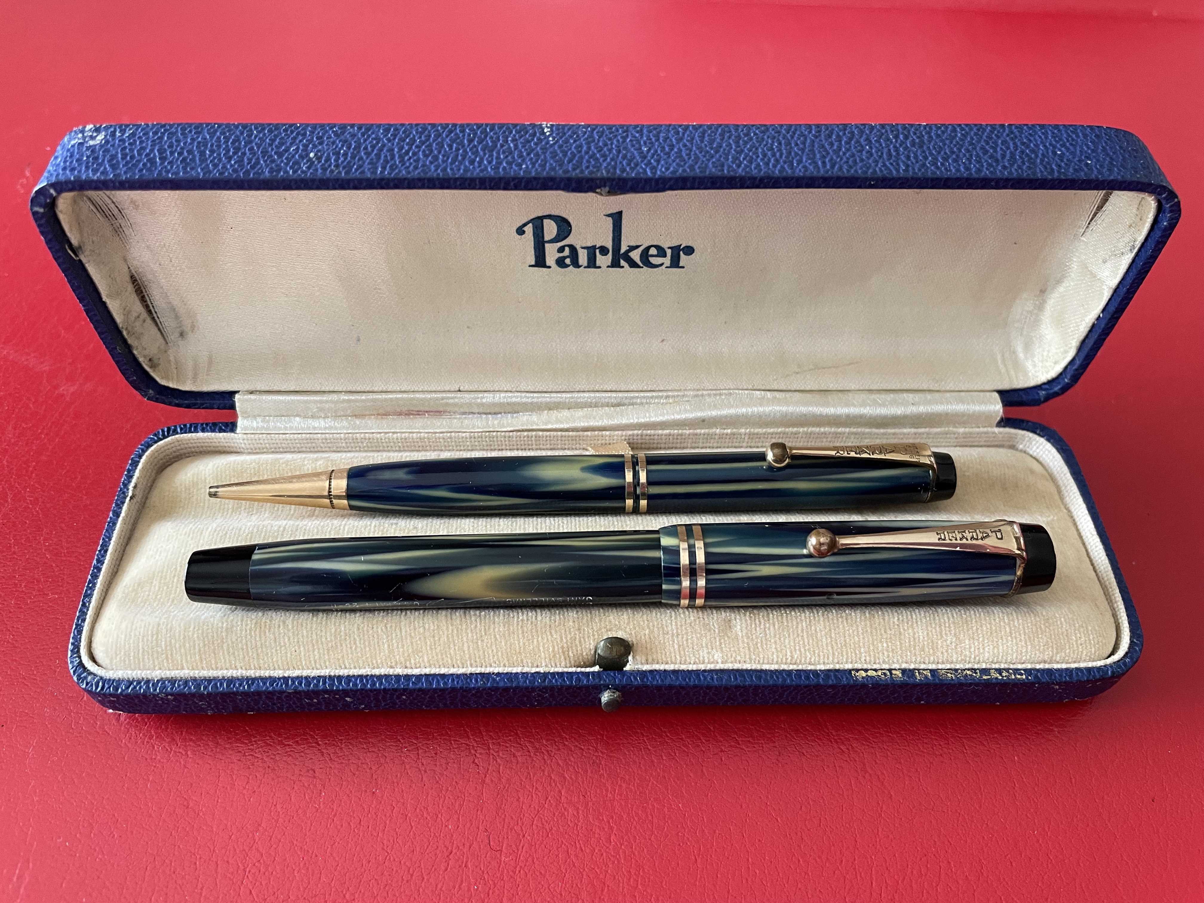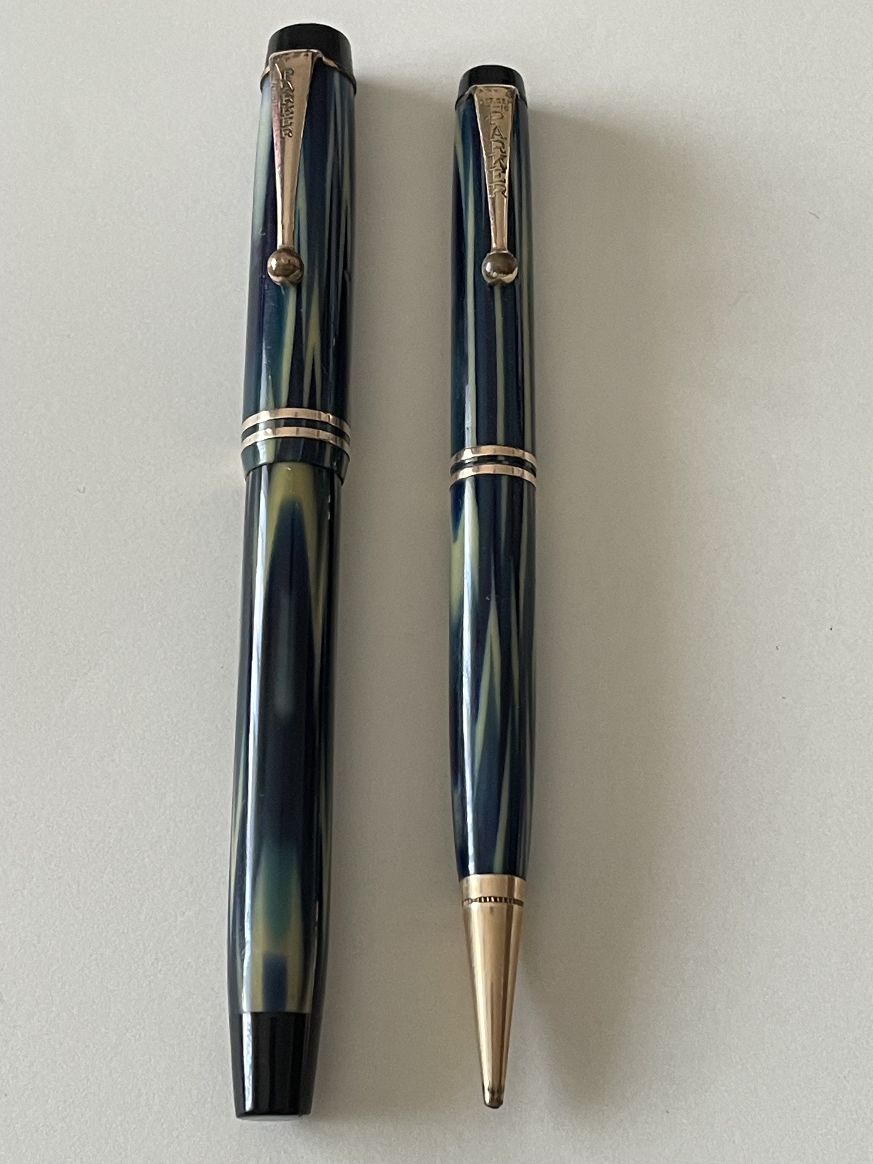 Si tratta di una coppia - stilografica e matita - di Parker True Blue che sono state prodotte soltanto per pochi anni, fra il 1928 e il 1930 o 1931.