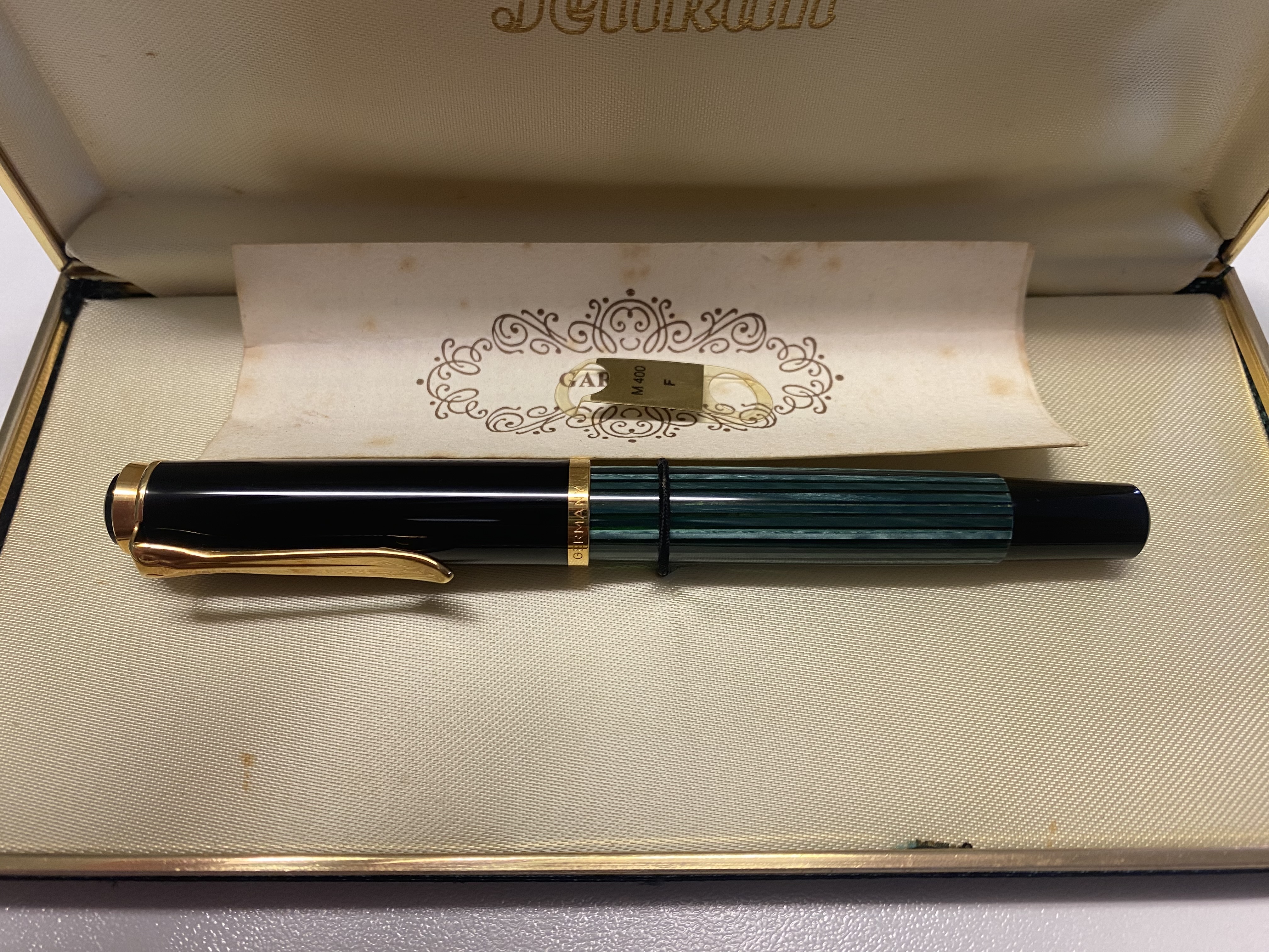 ). Non le fanno più le confezioni di un tempo, essenziali (poco più grandi della penna) , in tema (verde con il verde della stilografica) e robuste. Si vede che la Pelikan negli anni 80-90 andava molto fiera della M400.