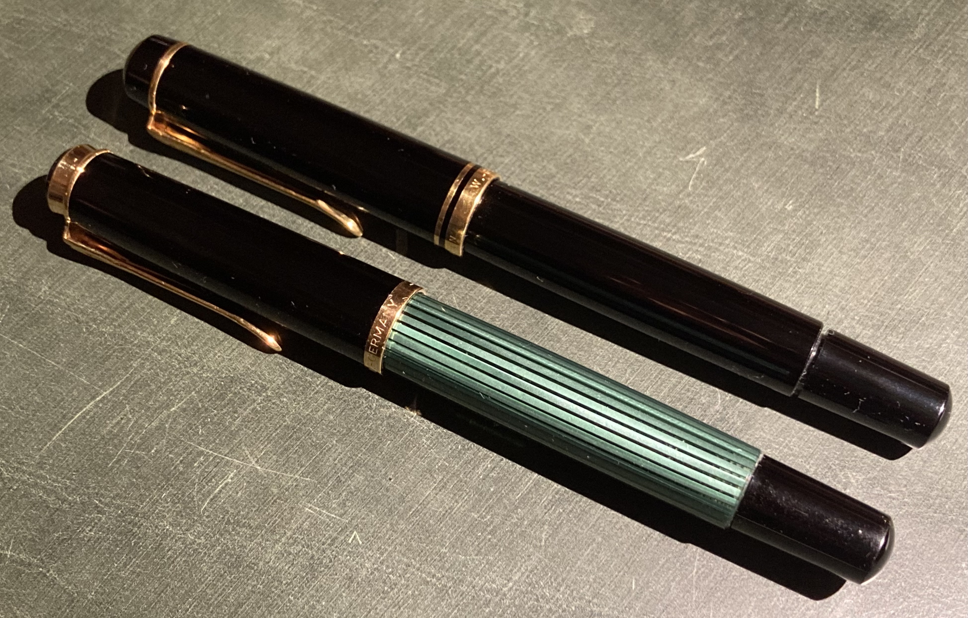 Si tratta di due Pelikan del periodo appena prima della caduta del Muro di Berlino: portano la scritta W. Germany sulla veretta del cappuccio ed appartengono a due serie di produzione diverse: la più economica, ibrida tra la M200 e la M400, si chiama M250 e pur avendo l’aspetto simile alla serie inferiore, monta lo stesso pennino della sorella all’epoca più costosa e rifinita, la M400.