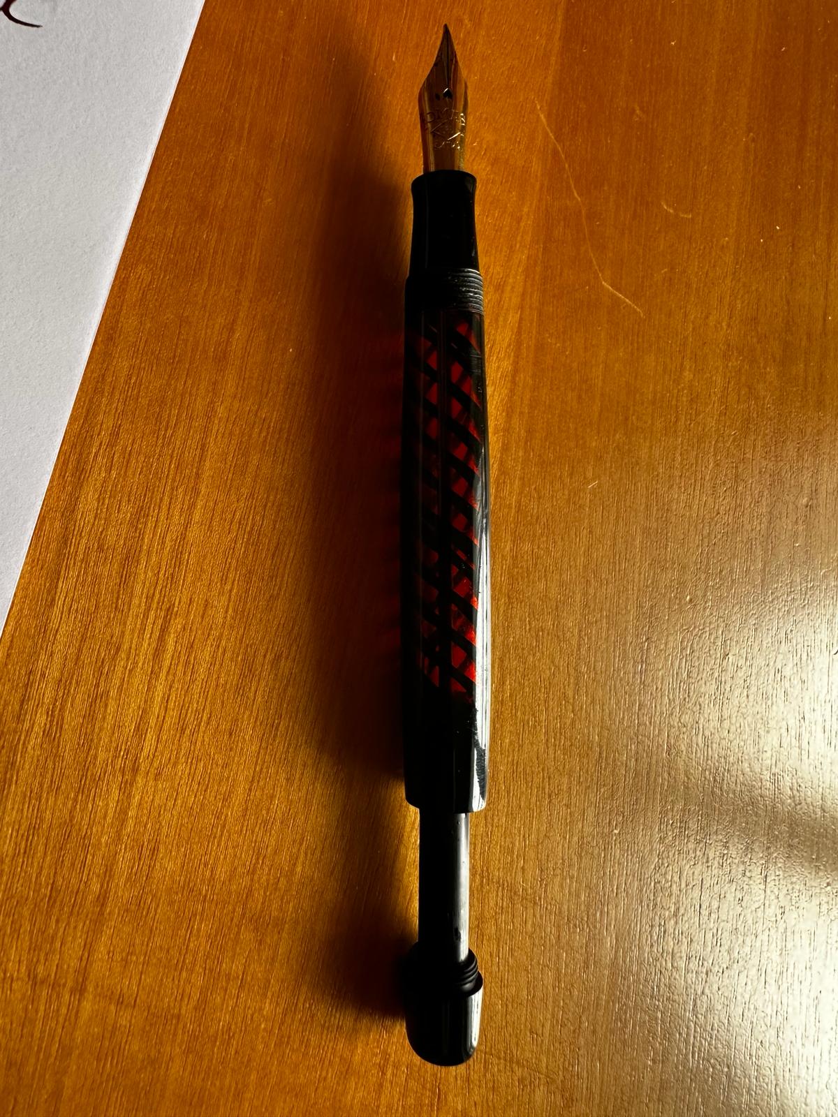 La mia prova è fatta ad intinzione con il Diamine Oxblood, che in quanto a tonalità lo trovo ben abbinato alla penna. Sono in attesa mi arrivi un Omas Amerigo Vespucci con il quale già la immagino bene.