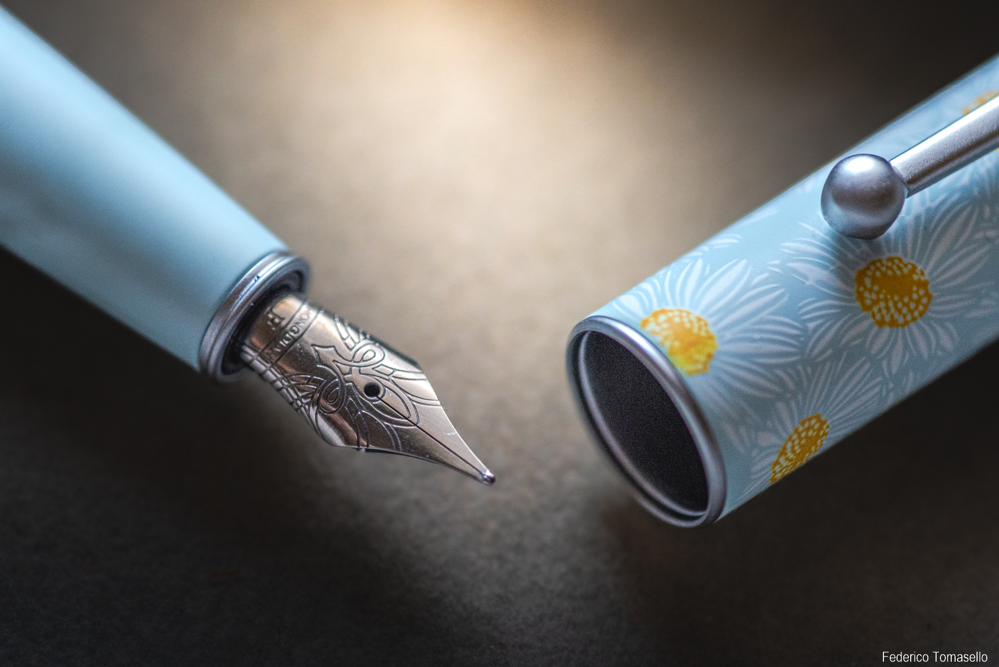 Per il resto è piacevolissima da usare perché il pennino è estremamente molleggiato e asseconda bene la mano, in più il flusso di inchiostro è perfetto, né stitico, né inondante (ma più su questo secondo verso, il che è piacevole).
