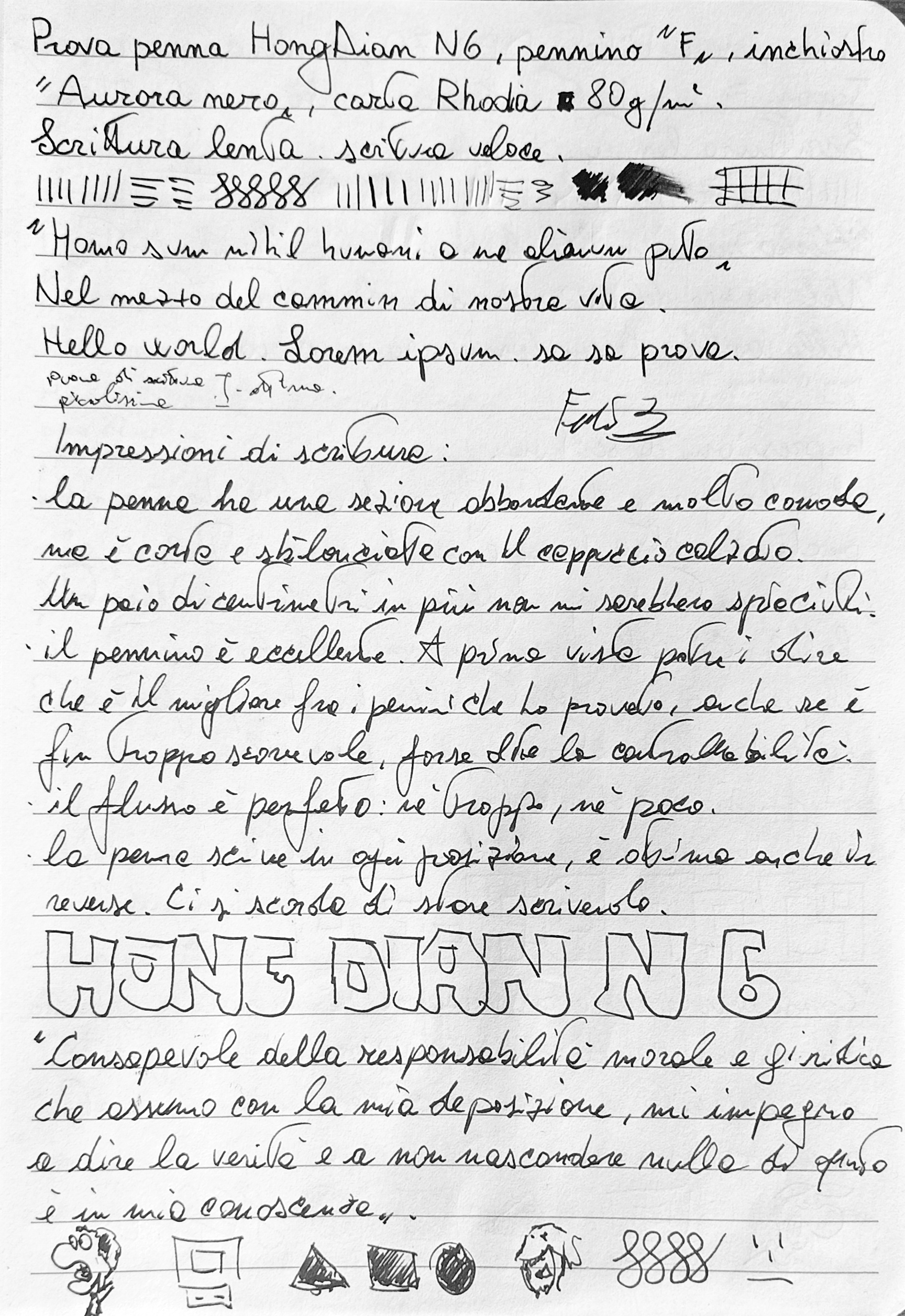 Ora, non so bene di chi sia il merito o quanto sia da dividerlo tra i due concorrenti, ma la Hongdian con l'Aurora VOLANO sul foglio, come se non esistesse il concetto di attrito. Inoltre il pennino vola, ma non scivola, rimanendo sempre a contatto e sempre tracciante la linea. La scorrevolezza, per me, è comunque "troppa": il piacere di tracciare le linee è massimo, ma non riesco comunque a controllare la mia scrittura che diventa orribile esteticamente e inintelligibile alla lettura.
