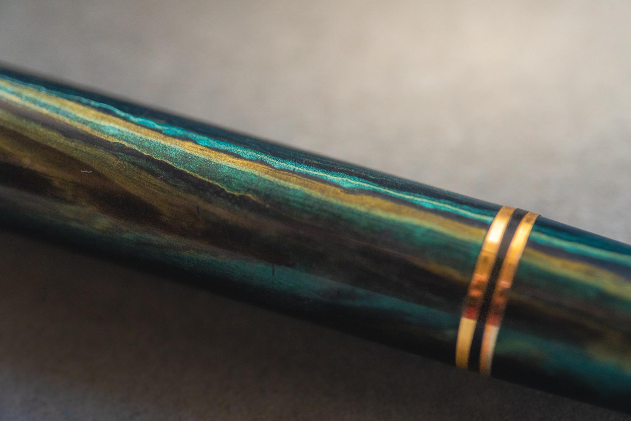 Confortevole in mano, ben bilanciata, comoda per l'uso (il cappuccio si sfila con meno di un giro di filettatura), era disponibile sia nera che verde "finto legno". Ho preso questa seconda versione, che ritengo decisamente più bella (nonostante la penna non lo sia, soprattutto a causa del fermaglio kitsch che incastona un pregiato gioiello arancione di plasticaccia).