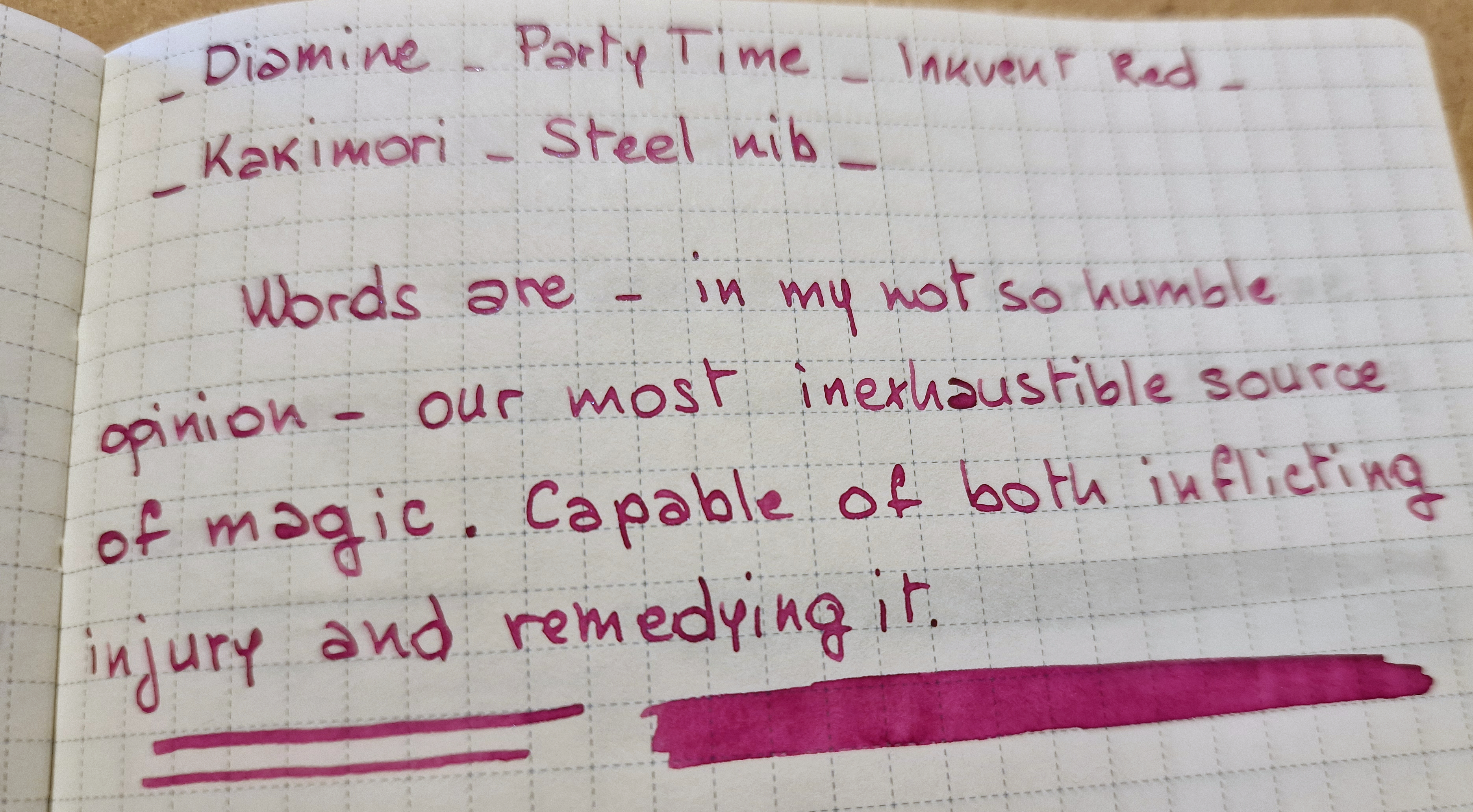 Alla scrittura con la Kakimori, risulta scorrevole - caratteristica relativamente frequente negli inchiostri a base magenta.
