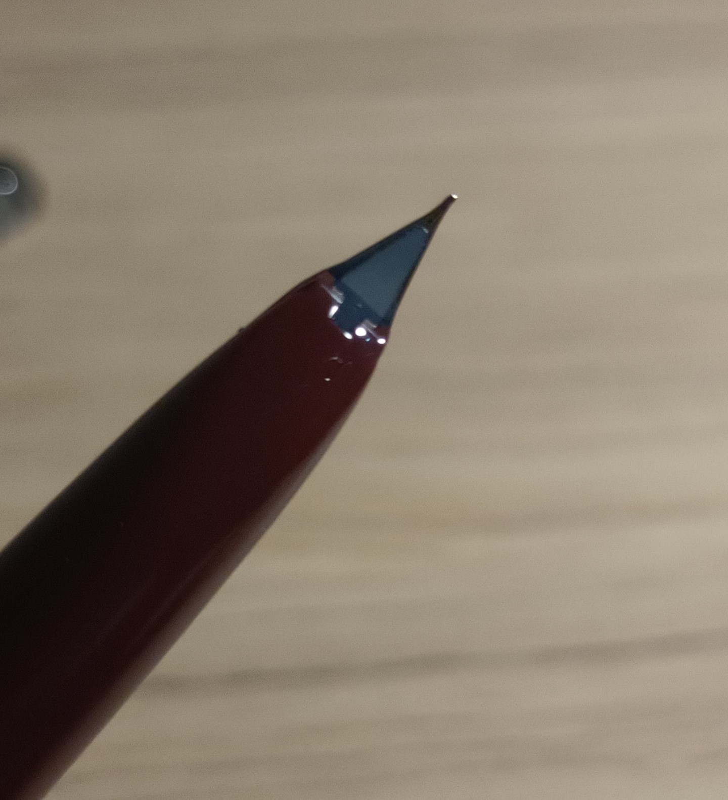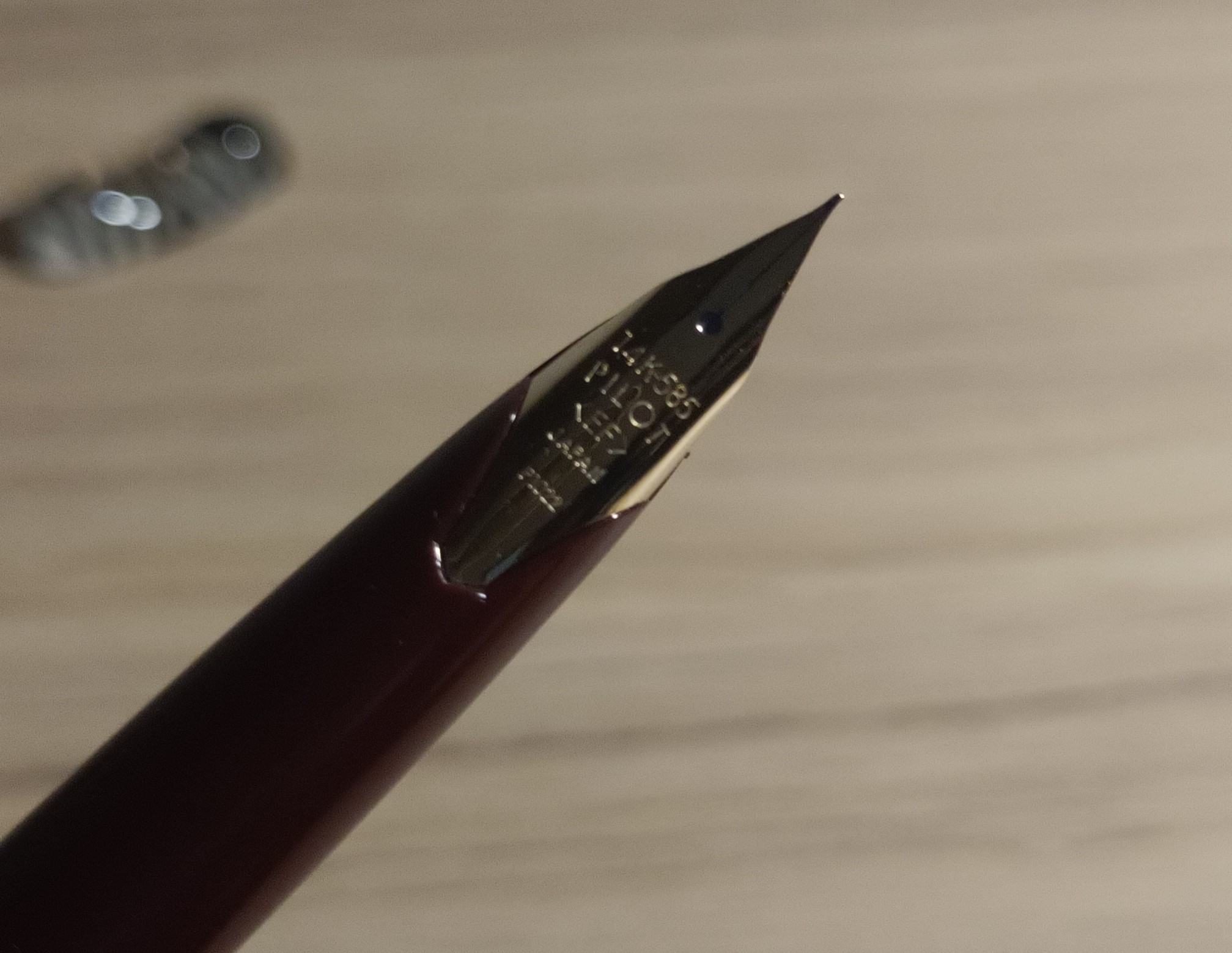 Non ho ancora parlato della parte fondamentale, il pennino, perché merita un discorso a parte. Il pennino della Pilot Elite è certamente riconoscibile e particolare: si tratta di un pennino in oro 14 carati incastonato nella sezione, che continua con una elegante “coda” per qualche millimetro sulla sezione e le cui ali sono avvolte attorno alla sezione, con un alimentatore quasi completamente nascosto nella sezione tranne che per la parte terminale. Secondo me questa è la scelta di design migliore fatta su questa penna, trovo il risultato molto elegante, e ciò permette anche di inserire un pennino non piccolo senza aumentare la lunghezza totale della penna (ricordiamo che è una “pocket pen”, quindi ogni millimetro risparmiato è prezioso). A parte la sua forma molto particolare, il pennino è molto semplice, presenta solamente un piccolo foro di sfiato circolare e le incisioni con i dati tecnici: caratura dell’oro (14k-585), Il nome del produttore, la larghezza del tratto, la scritta “JAPAN” e infine un numero di serie.