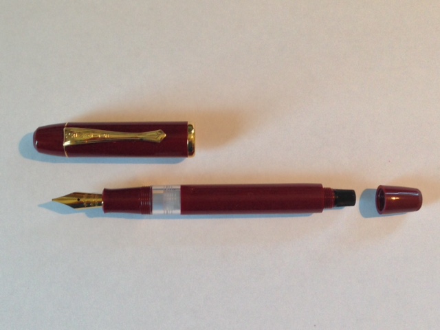 Era intasata e con pennino rotto in punta e corroso. Non essendo esperta, mi sono limitata a ripetuti lavaggi. Il pistone si è sbloccato e ora si riesce a caricare la penna, anche se il serbatoio e il pistone stesso sono ancora leggermente incrostati di inchiostro. La penna sembra funzionare: per provare ho messo il pennino di una Jinhao 82.