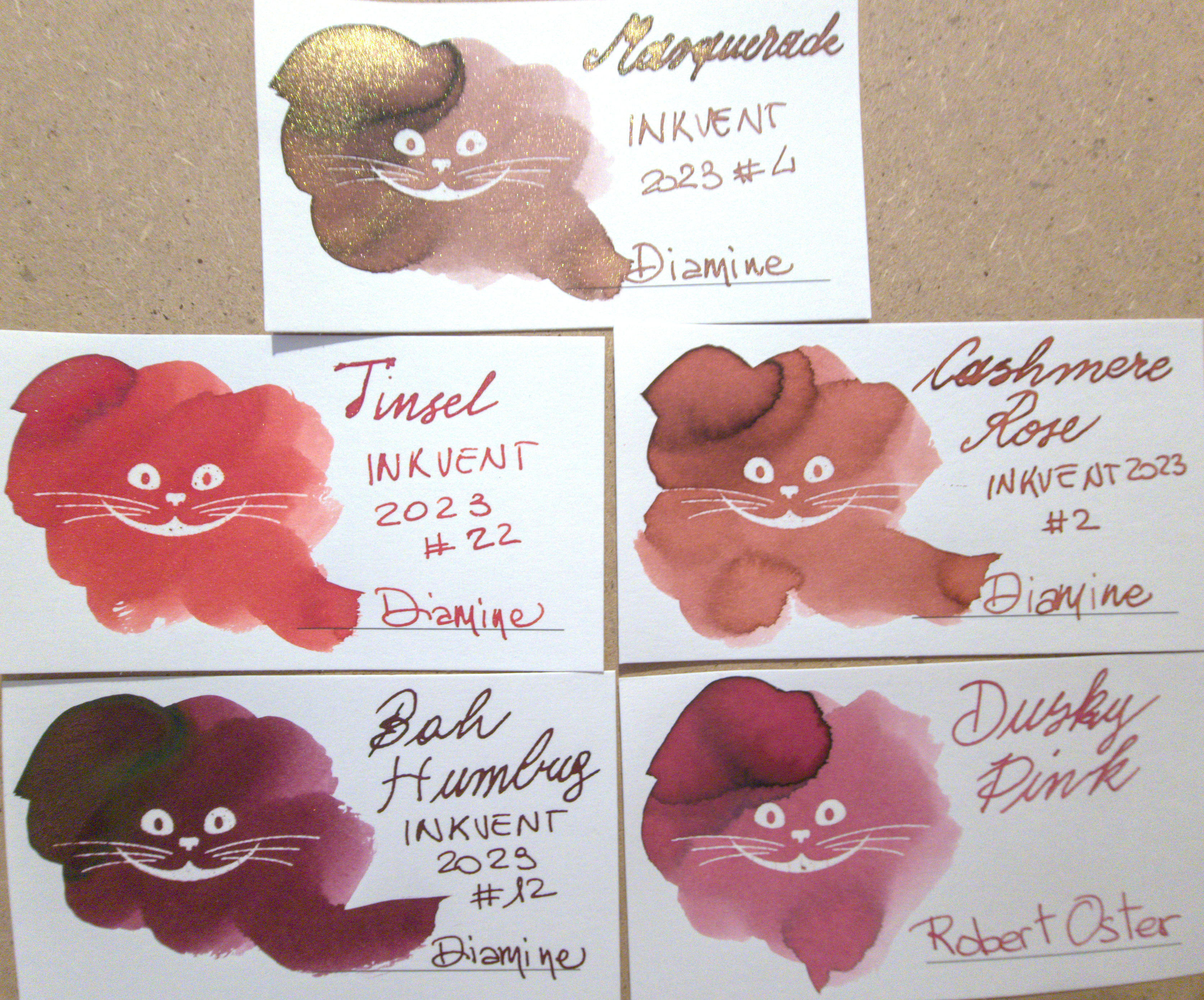 Il confronto sopra è un poco scuro e mi scuso, era una foto scartata, ma ho pensato - in questo momento - che sarebbe potuta esserci la curiosità di vederlo affiancato a Bouquet D'Antan di Jacques Herbin. In confronto a Bouquet D'Antan, Dusky Pink è molto rosso