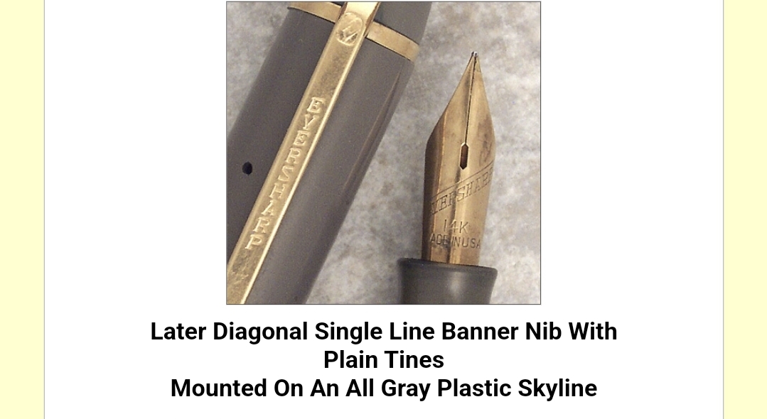 Successivamente (anni ’40) venne adottato sulle Skyline ed in tre diverse incisioni : Eversharp scritto in obliquo con una riga sopra , Eversharp in obliquo con sopra due linee laterali che vanno a confluire verso le punte (pennino detto T-banner), Eversharp in obliquo con linea sopra più una forma “goccia” che parte dalle punte ed inscrive il foro di sfiato (pennino detto Teardrop)