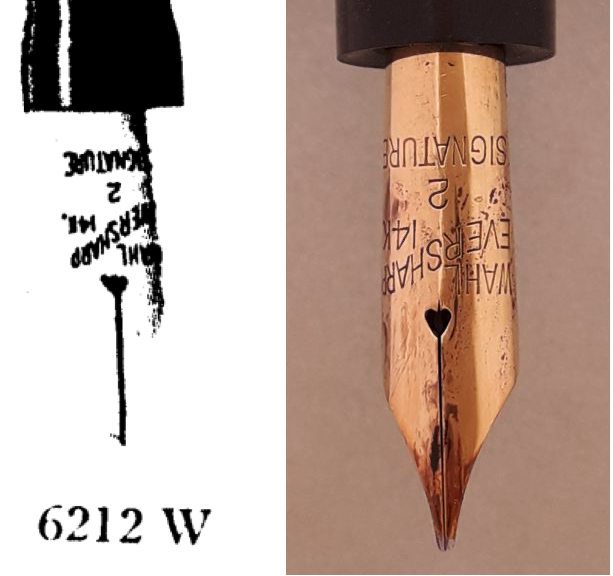 Nei Cataloghi [fonte Pen Collectors of America] delle ultime flat-top (quelle in celluloide) del 1928 e del 1929 i pennini hanno il classicissimo foro "a cuore". Mentre il foro "a esagono allungato" (e con quella tipologia di iscrizione con "banner" obliquo e una linea sola) si trova molti anni dopo sulle Skyline anni Quaranta [Jim Mamoulides]. https://newpentrace.net/penbase/Data_Re ... tml?id=297