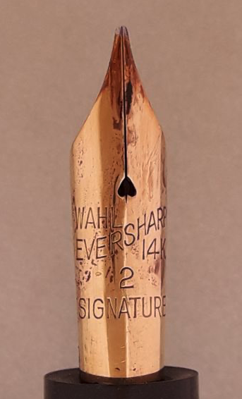 Di conseguenza , e facendo sempre riferimento alle immagini che è possibile vedere sul catalogo del 1929, le incisioni sul pennino alla parola WAHL si aggiunse anche EVERSHARP scritta in obliquo (rimane la numerazione del pennino, l’indicazione dei carati, ed eventualmente la stampigliatura SIGNATURE)