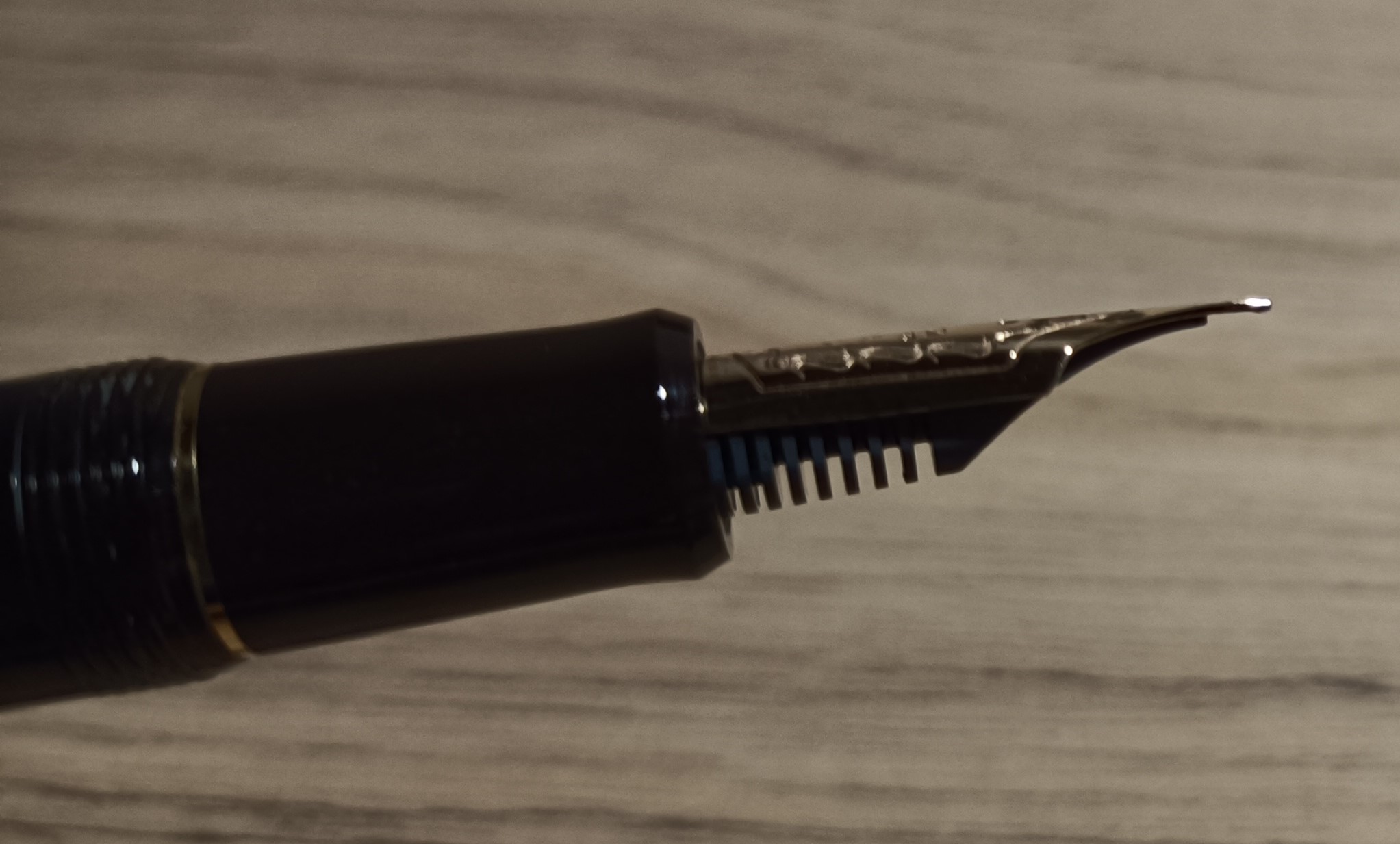 Il pennino in oro 14 carati è di dimensioni importanti, la misura 15 di Pilot (quella della 743 e della 913 per intenderci), ha i soliti ornamenti dei pennini della serie Custom, presenta un piccolo foro di sfiato sotto il quale sono incisi, in ordine dall’alto al basso, “PILOT”, “14k-585”, “15”, “<F>”. L’alimentatore è quello classico di serie delle Custom, in plastica blu-grigia.