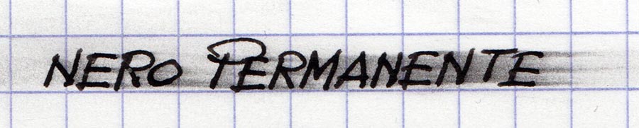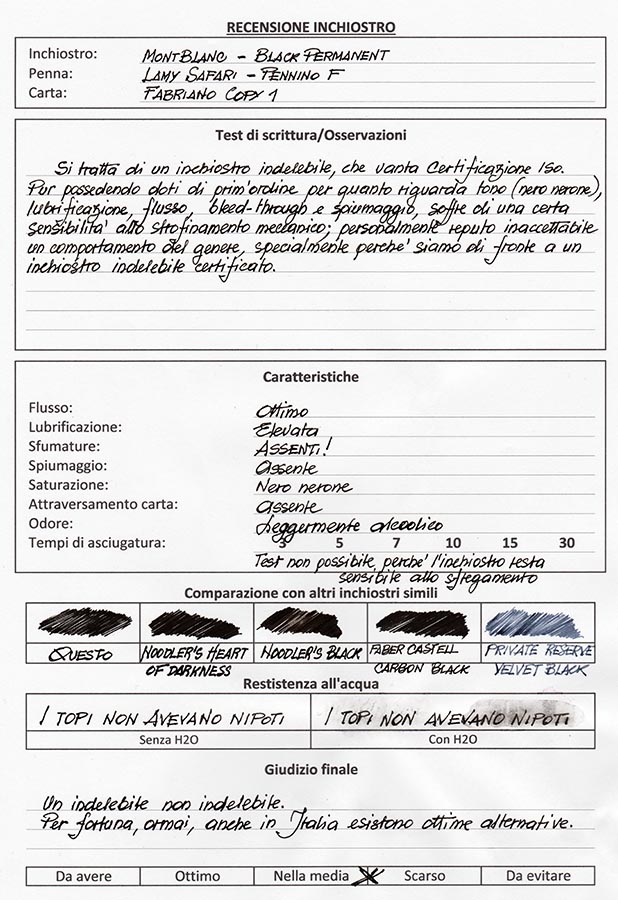 Probabilmente ho un concetto troppo ampio dei vocaboli “indelebile” e “permanente”, ma a casa mia questi termini significano - quantomeno - “non sensibile allo sfregamento”. D’altra parte la presenza sul mercato, ormai anche italiano, di inchiostri analoghi anche a prezzo decisamente inferiore, pone, a mio avviso, il MontBlanc in fondo a una ipotetica classifica, e non meritevole - allo stato attuale - di un giudizio positivo, in quanto promessa sostanzialmente mancata, certificazione ISO o non certificazione ISO. Sul piatto della bilancia che regola le mie scelte trovo prodotti come Sailor Kiwaguro, Noodler’s black, Noodler’s Heart of darkness, Graf Von Faber Castell Carbon Black (non un vero indelebile, ma incredibilmente robusto), e tutto l’esercito di ferrogallici assortiti. Francamente ne sono davvero dispiaciuto, perché tutte le altre qualità sarebbero di prim’ordine, ma è mia opinione che MontBlanc dovrebbe rivedere la formulazione che, allo stato attuale delle cose, è sbagliata.