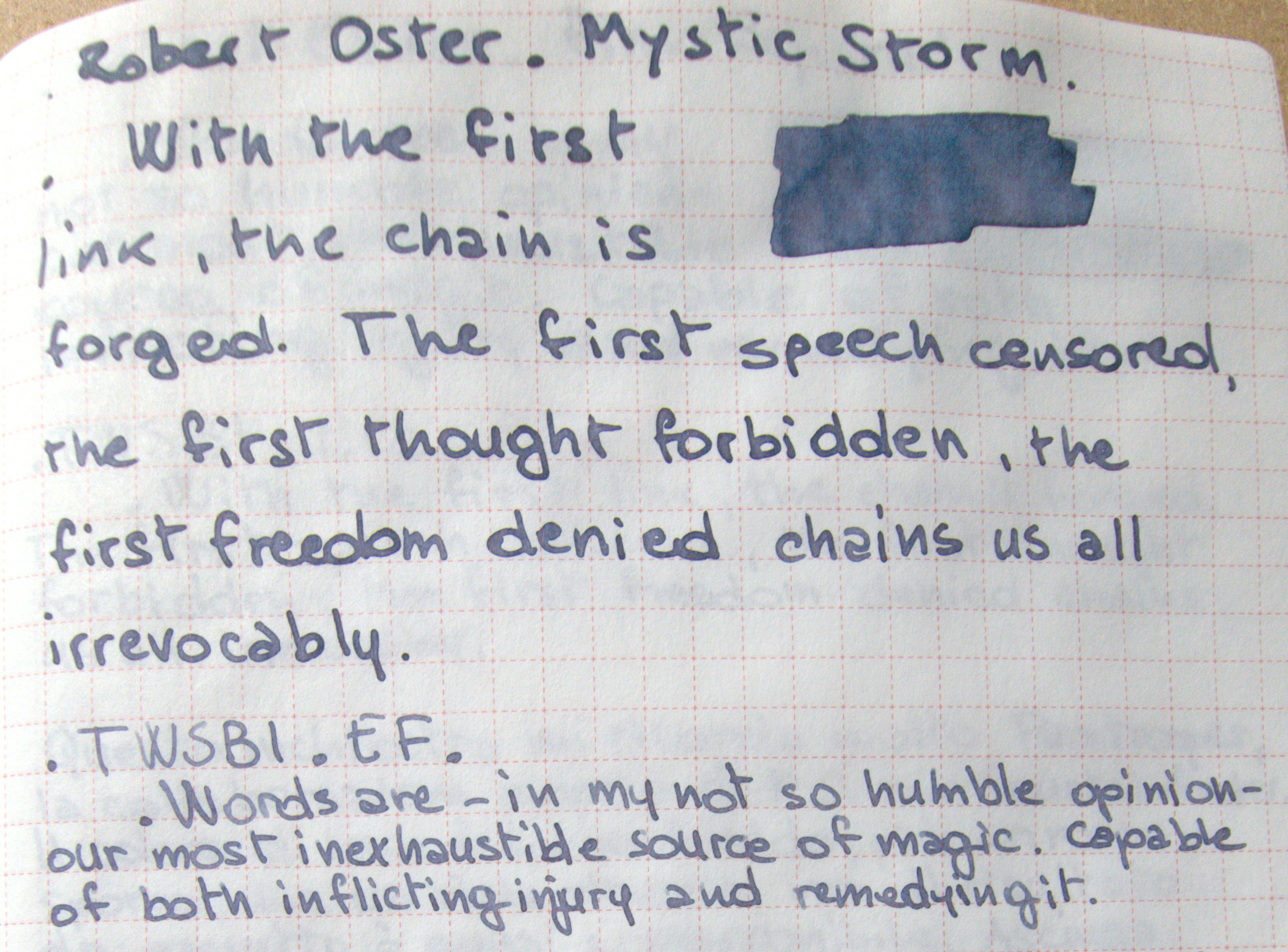 Mystic Storm è un inchiostro bagnato, in modo meno esuberante di altri inchiostri di Robert Oster ma si difende bene ugualmente. Per quanto a me personalmente non interessi, trovo che sia un colore interessante: blu o grigio, a seconda della luce. Nei rari momenti di shading, si intuisce l'azzurro che fa parte di questo inchiostro.