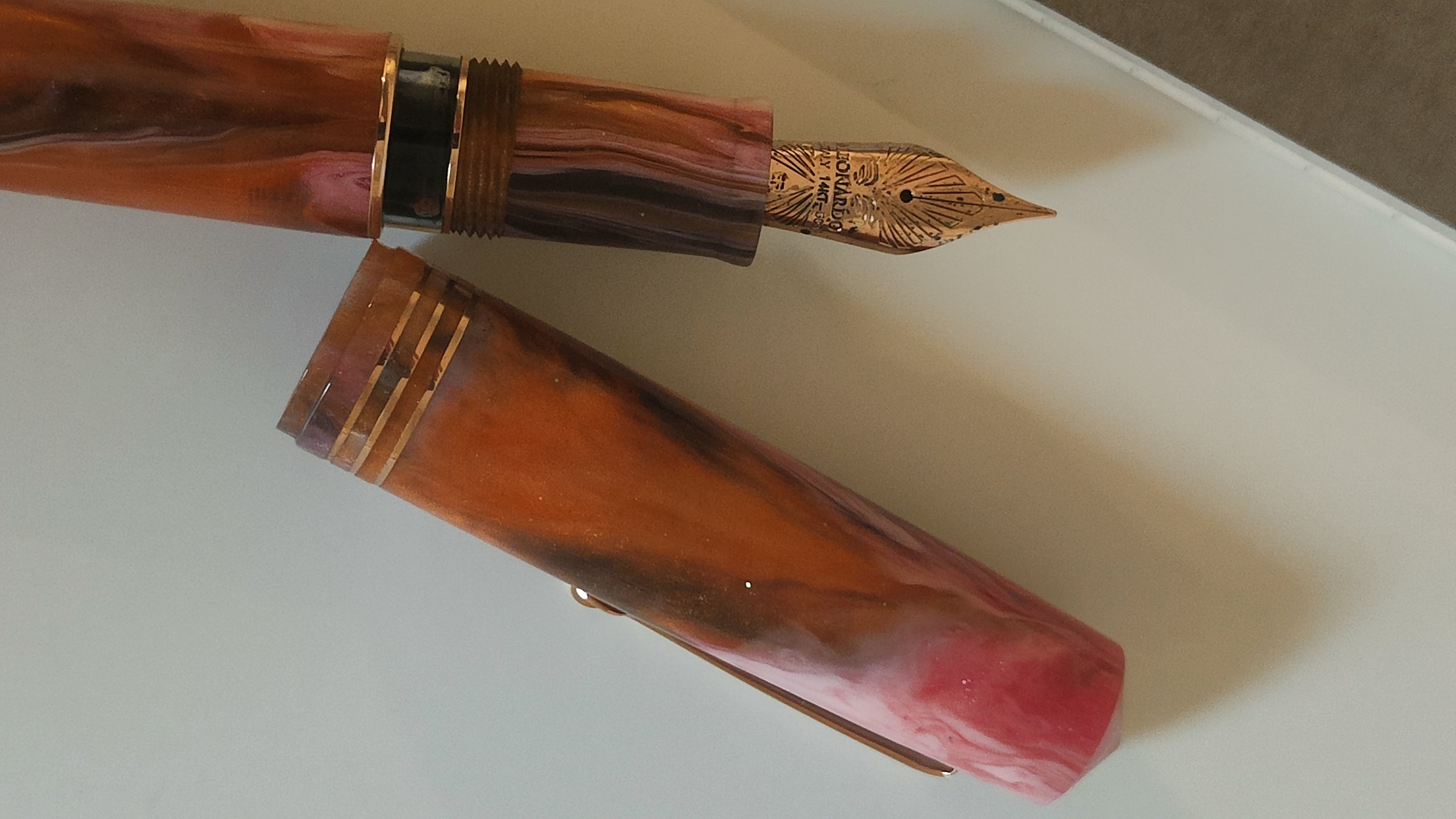 So che queste resine sono molto controverse. Io ne sono entusiasta: mi piacciono le linee classiche abbinate a simili mescole di colori. I toni rosa e arancio sono tra i miei preferiti, insomma non potevo perdermela! Inoltre, la penna in resina, meno affascinante delle ebaniti (che che ho) e delle celluloidi (che non ho, tranne una Omas gentlemen nera) è davvero pratica, in particolare se lucida. Puoi lavarla e, se dimentichi in ammollo, non succede niente. Puoi caricarla con qualsiasi inchiostro e non resta traccia dopo il caricamento. Puoi lasciarla in qualsiasi posto (da cui non voli!) senza preoccuparti della luce e delle sue conseguenze sul materiale. Per rimanere in tema di praticità, altro particolare non trascurabile, è il cappuccio che internamente ha tre diametri: il più piccolo combacia con l'inizio della sezione. La penna può stare ferma giorni e giorni, a me è sempre ripartita al primo colpo.