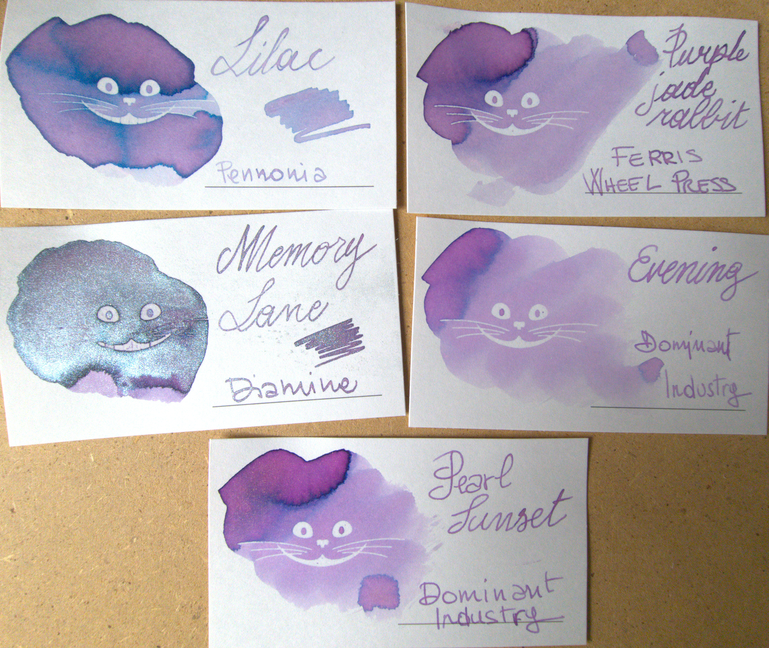 Come si vede dalle foto sopra, della swatchcard dello Stregatto, con tutta quella perla è davvero faticoso vedere l'inchiostro base. Per usarlo con la TWSBI ho dovuto lasciarlo sedimentare un poco. A me fa ridere quella maschera carnevalesca da cui spuntano gli occhioni e il sorrisone del gatto ma io mi diverto con poco :lol: