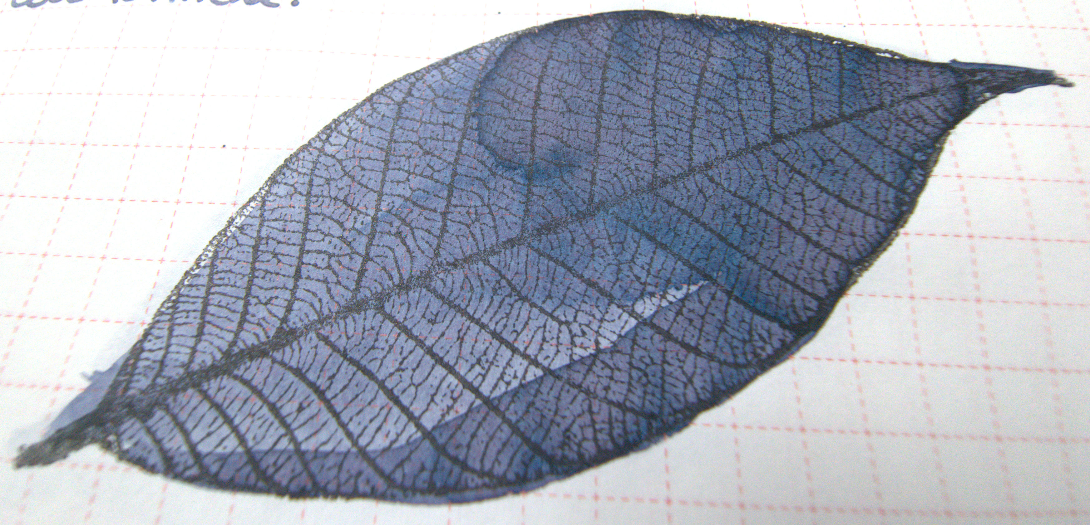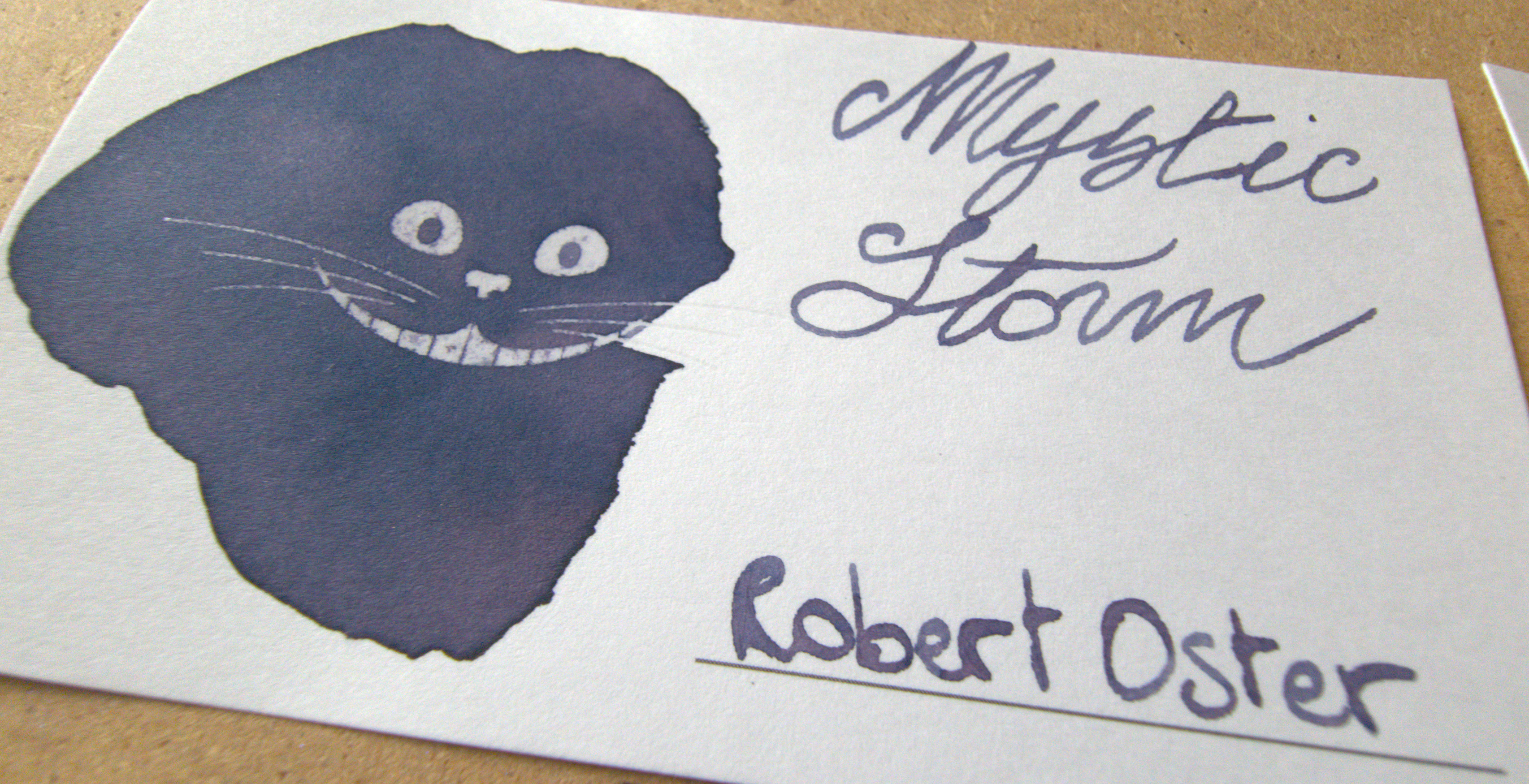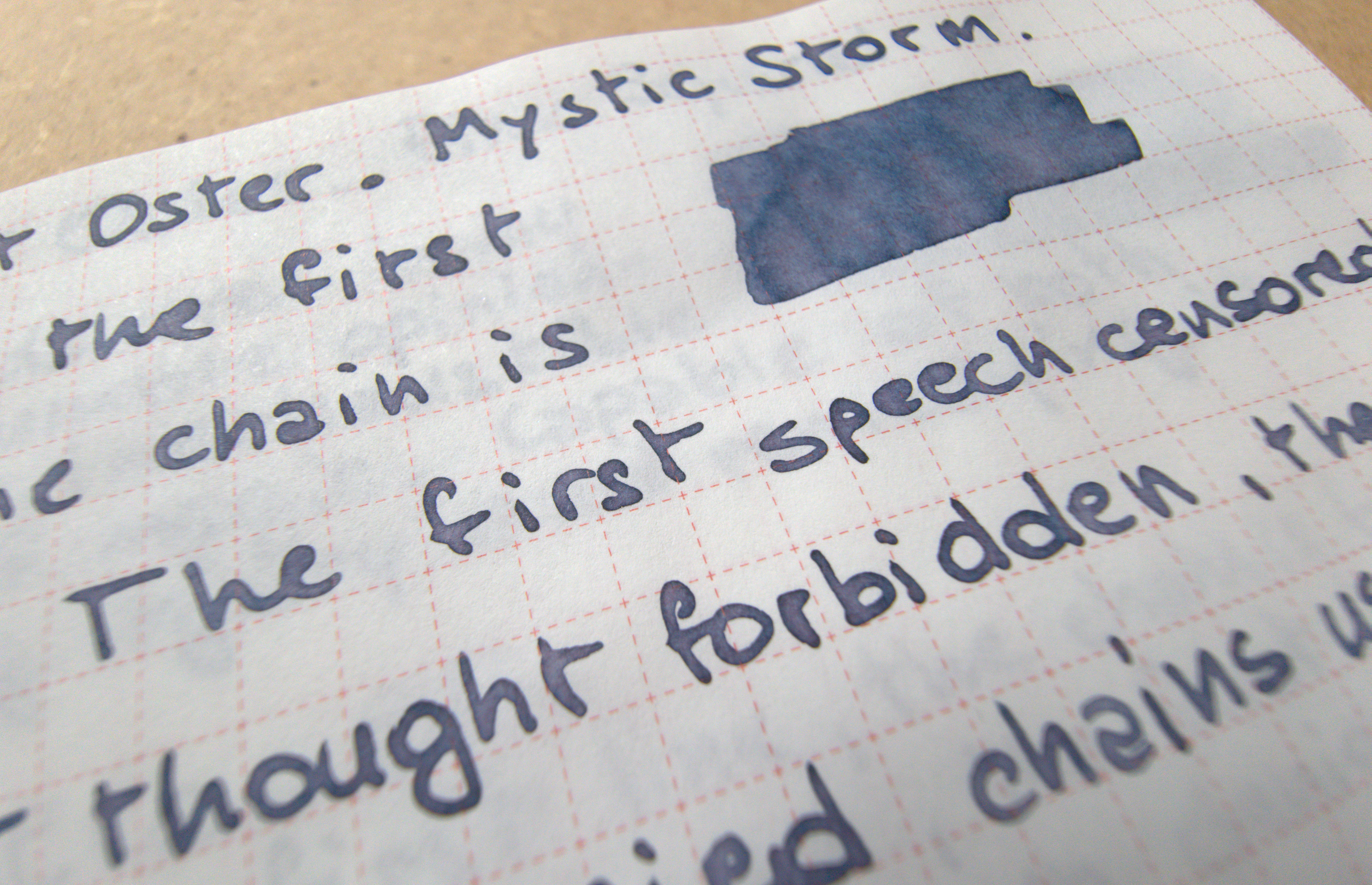 Mystic Storm è un inchiostro bagnato, in modo meno esuberante di altri inchiostri di Robert Oster ma si difende bene ugualmente. Per quanto a me personalmente non interessi, trovo che sia un colore interessante: blu o grigio, a seconda della luce. Nei rari momenti di shading, si intuisce l'azzurro che fa parte di questo inchiostro.
